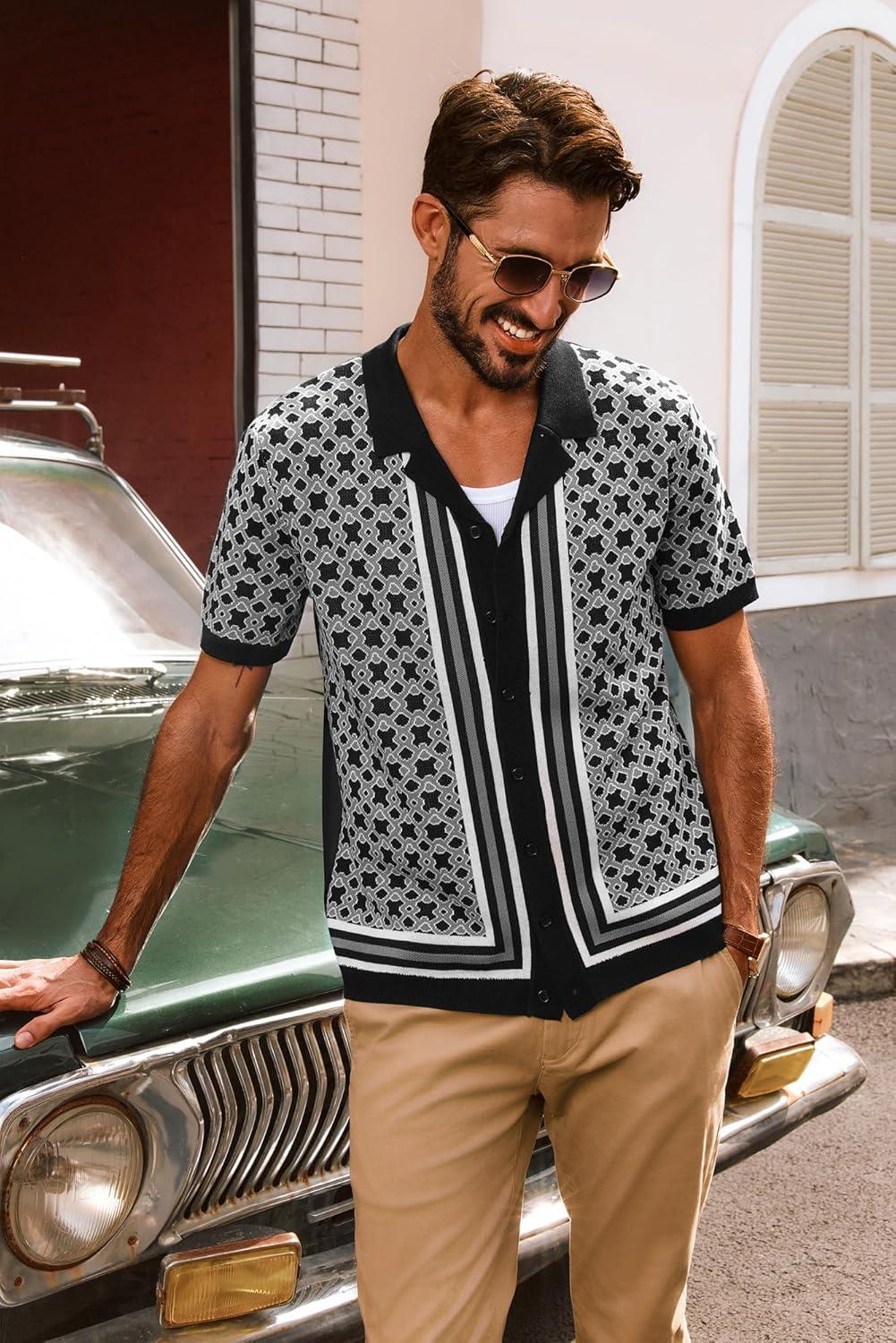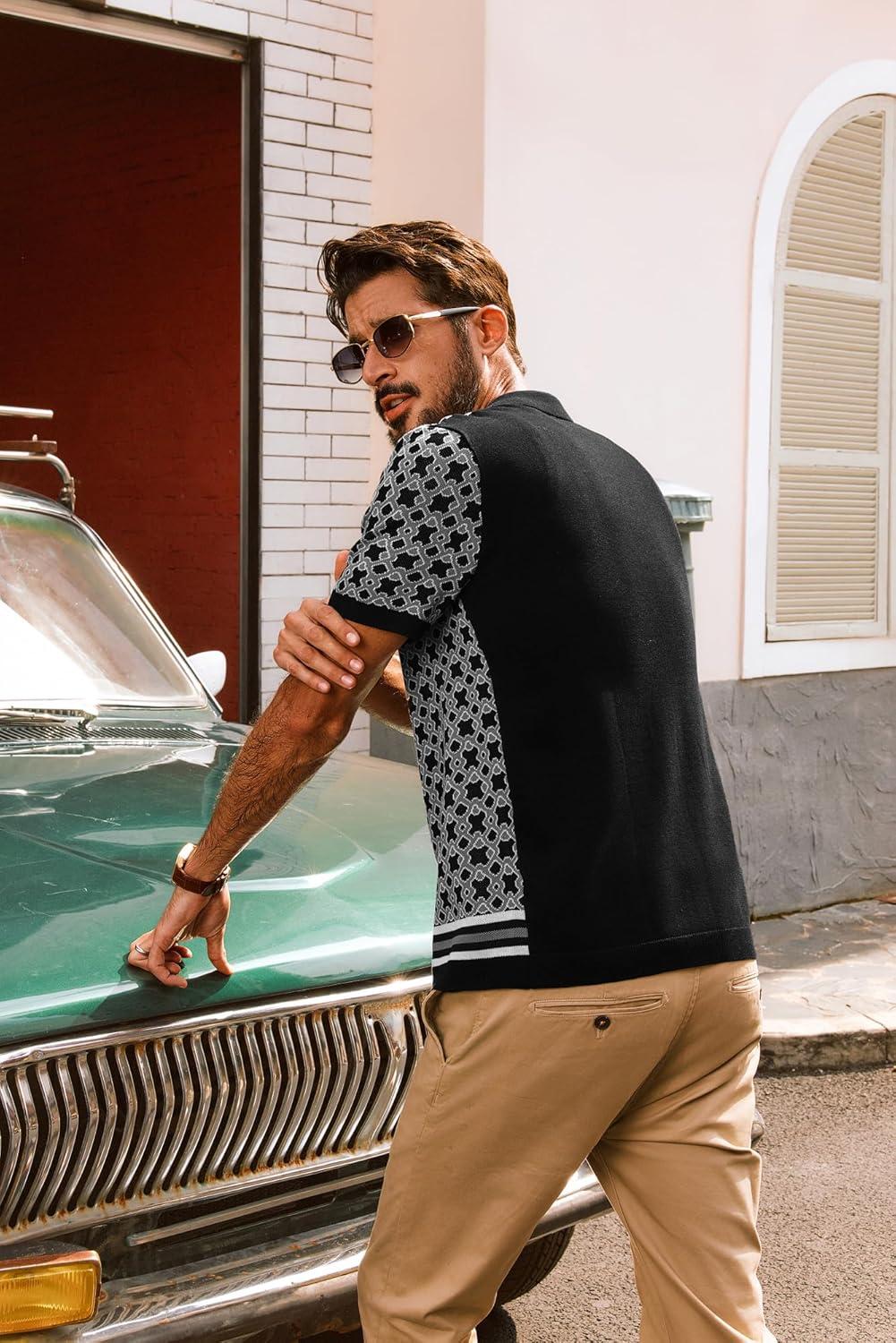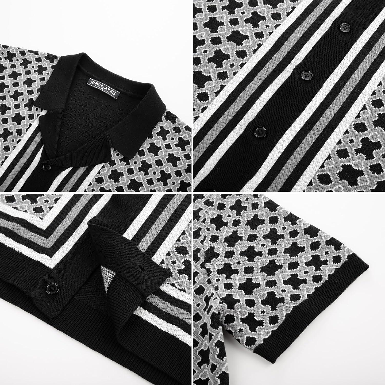 PJ PAUL JONES Mens 70S Shirts Vintage Shirts Button Down Cuban Collar Knitted Polo Shirt(Black)