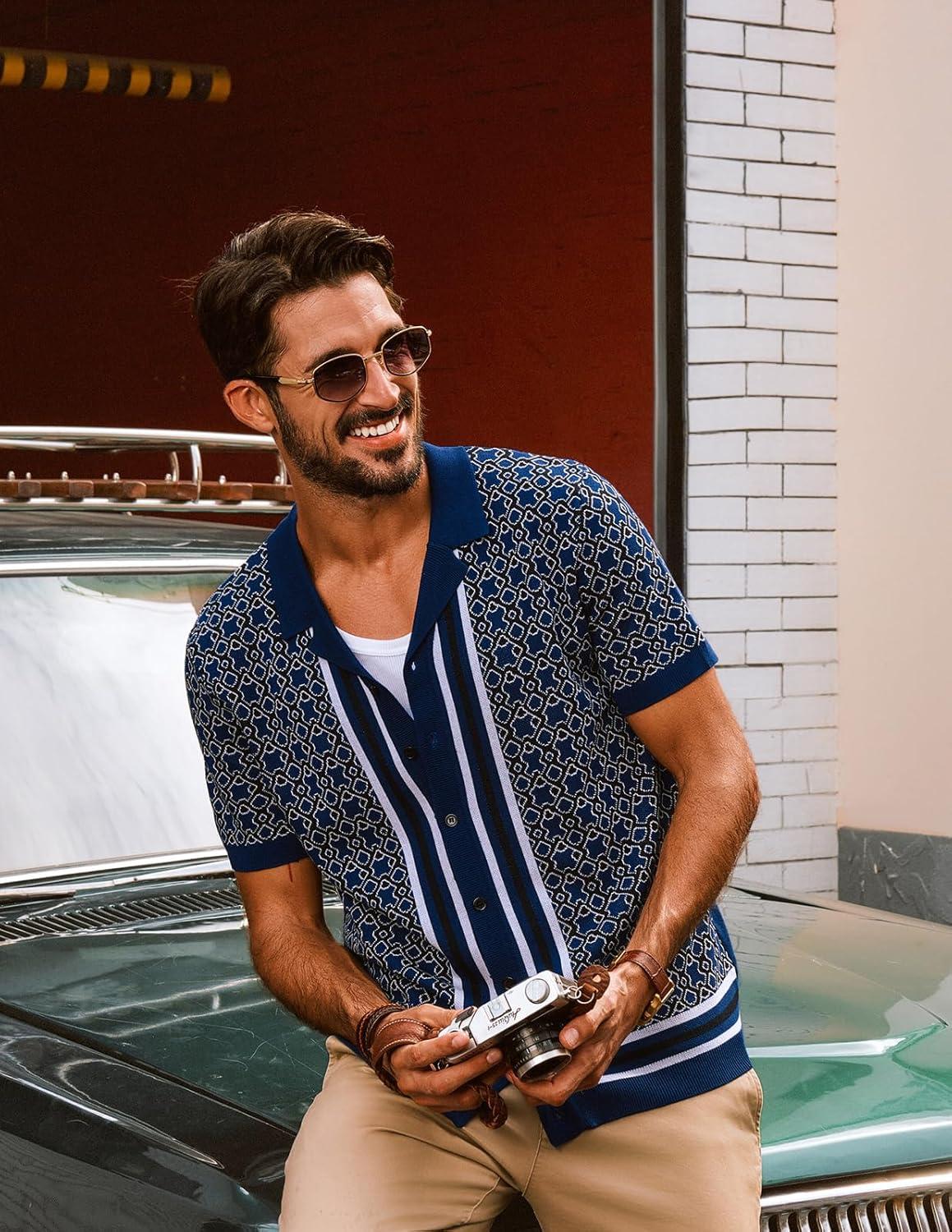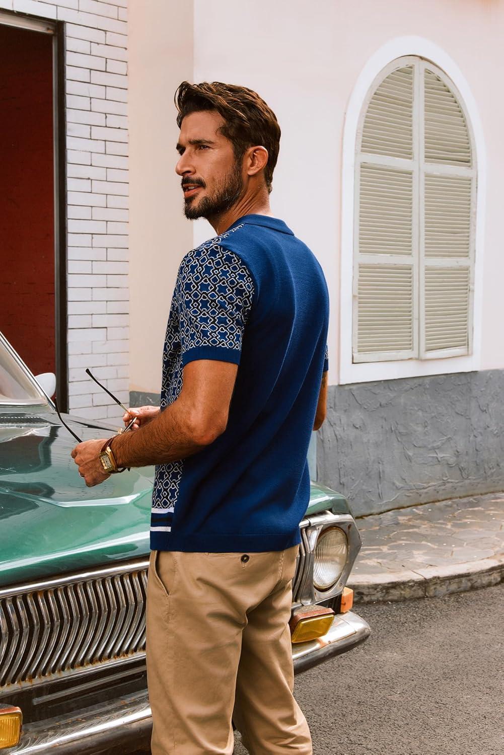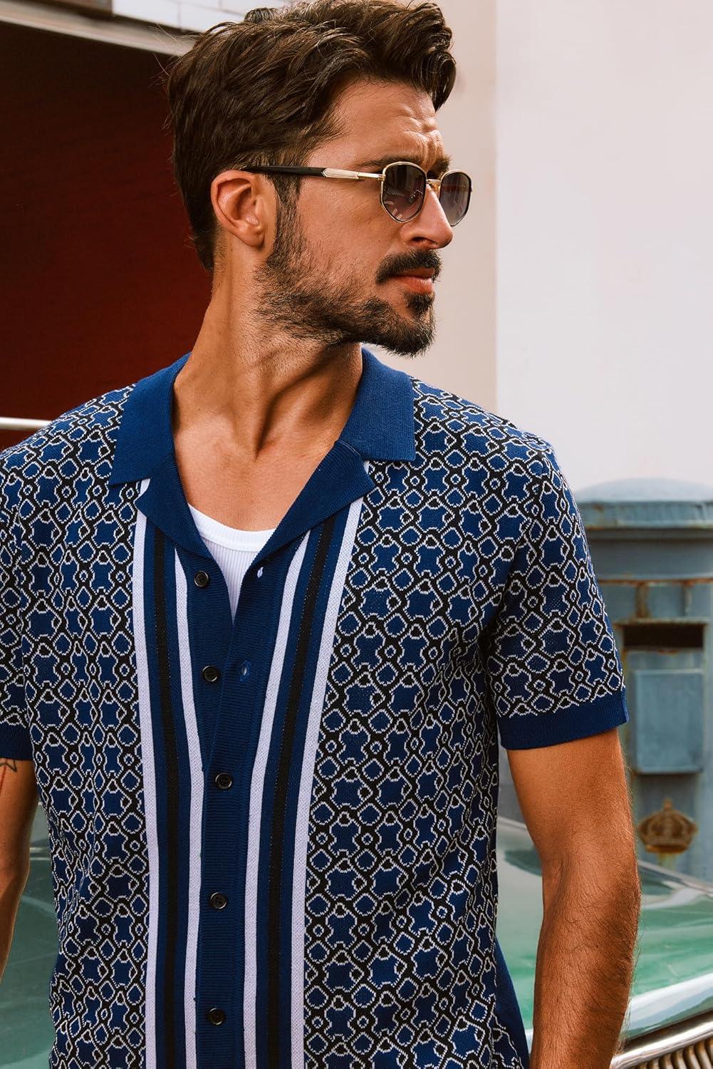 PJ PAUL JONES Mens 70S Shirts Vintage Shirts Button Down Cuban Collar Knitted Polo Shirt(Dark Blue)