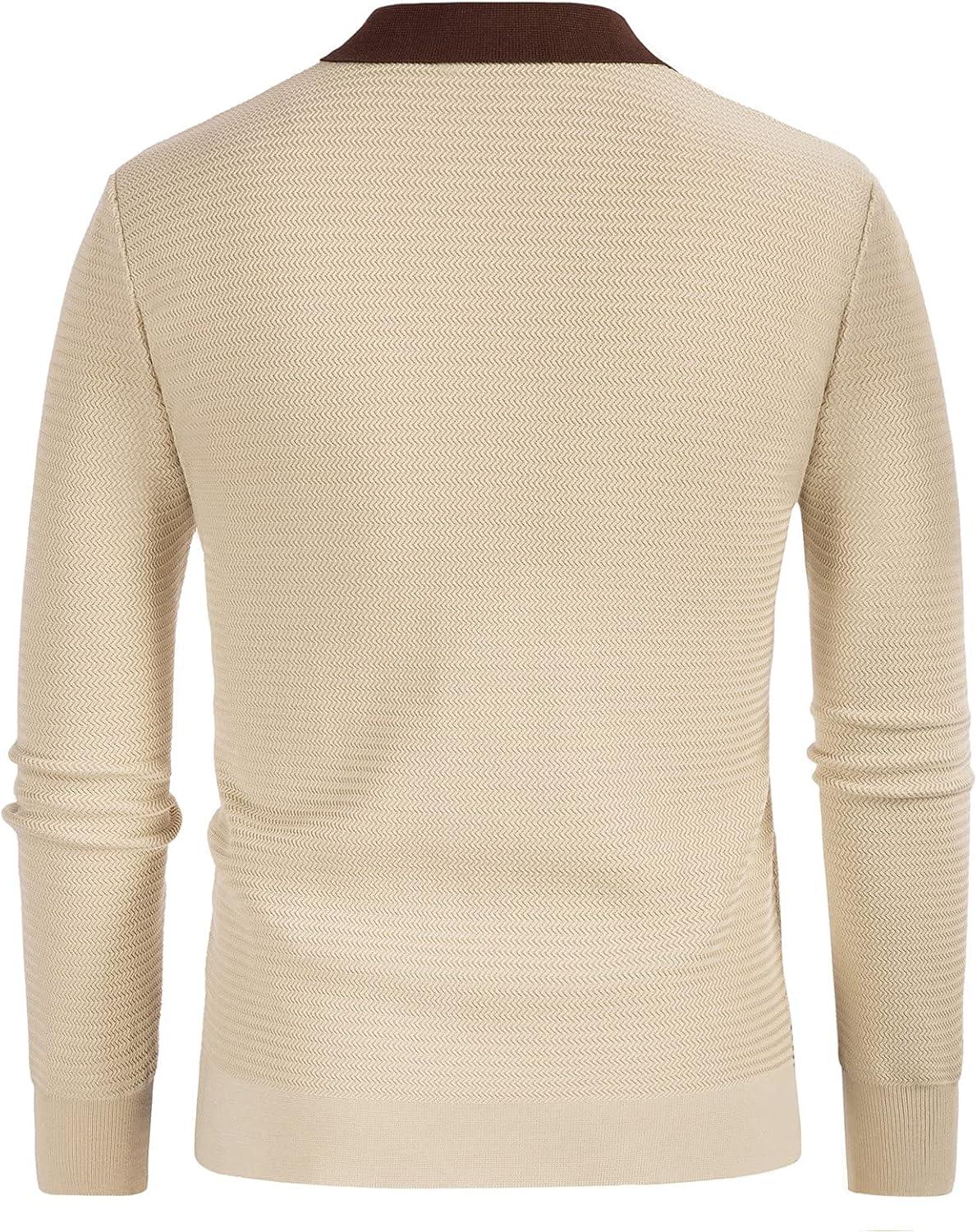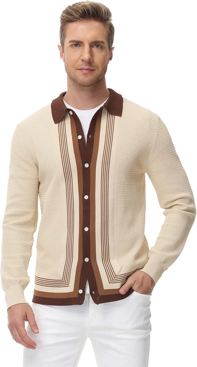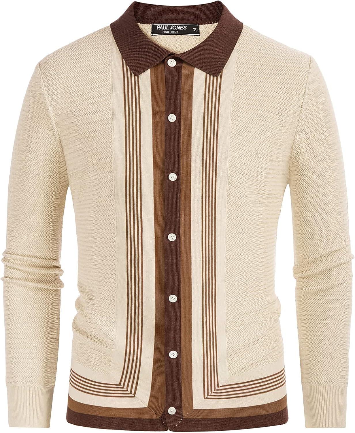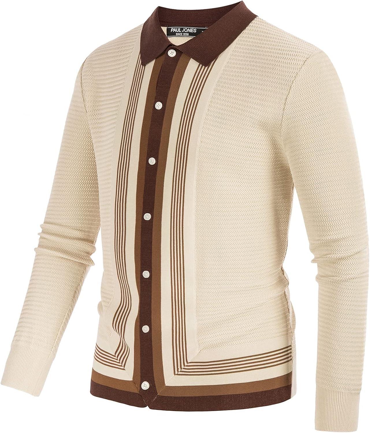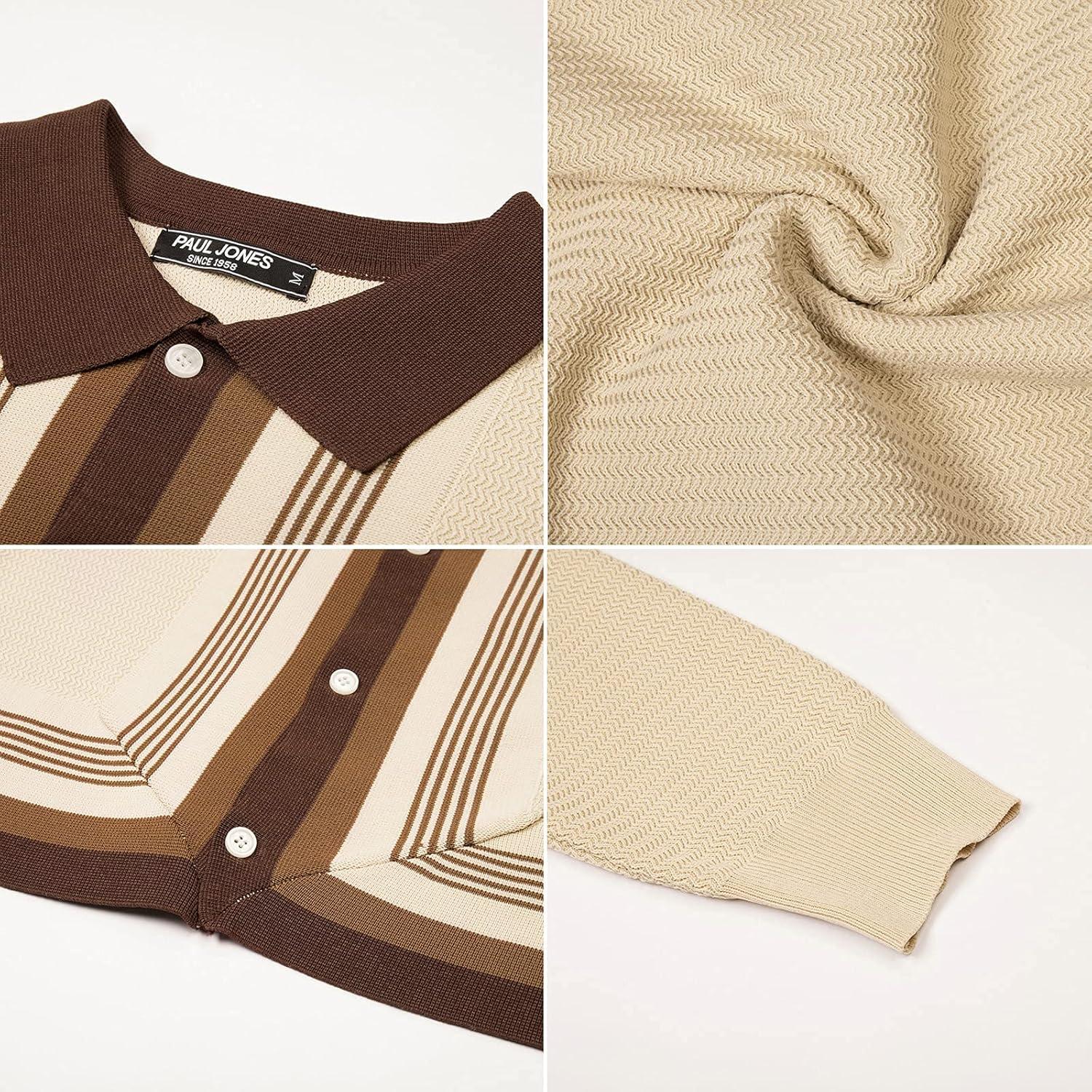 PJ PAUL JONES Men‘s Button Down Polo Shirts Striped Knitted Cardigan Sweaters(White Brown)