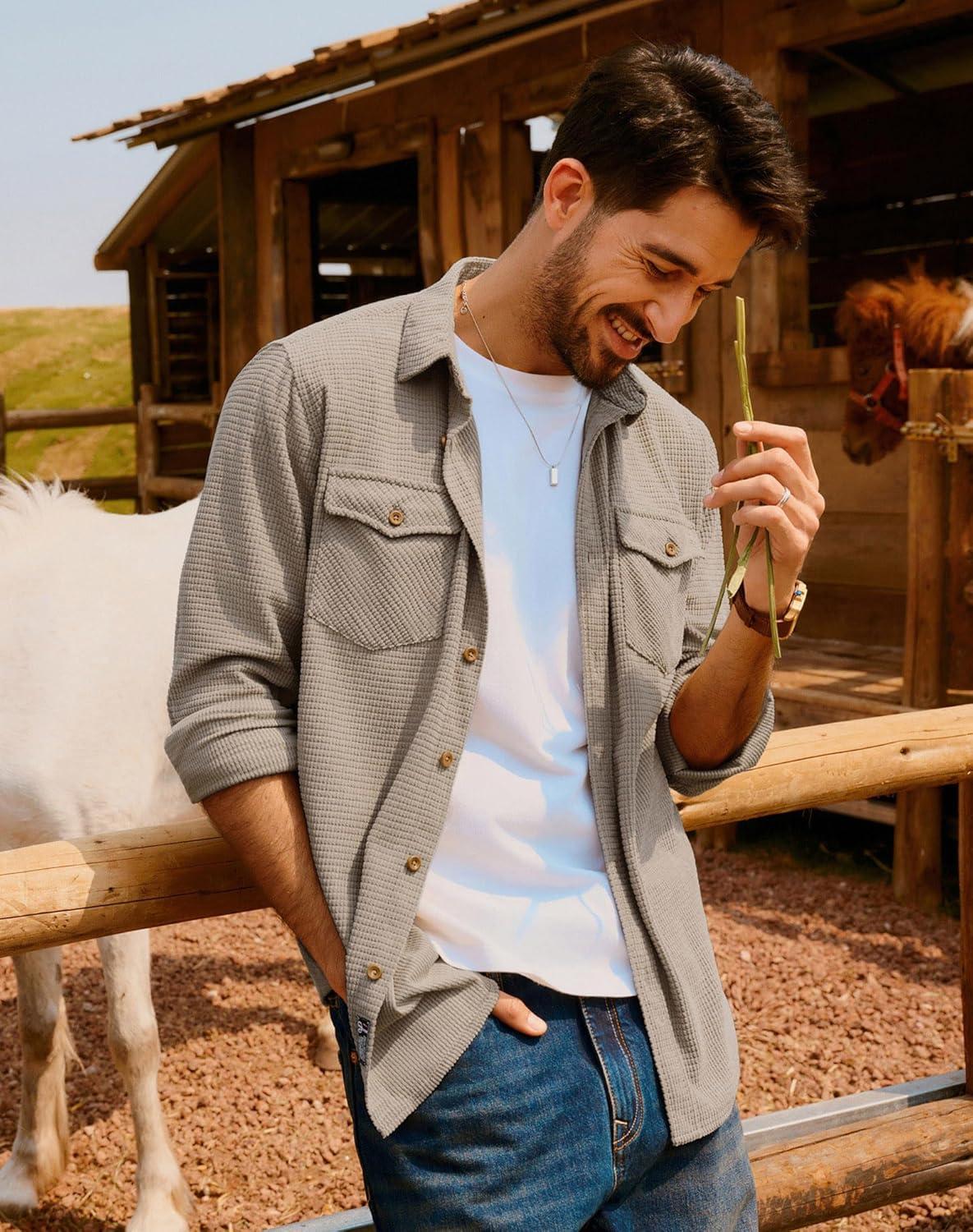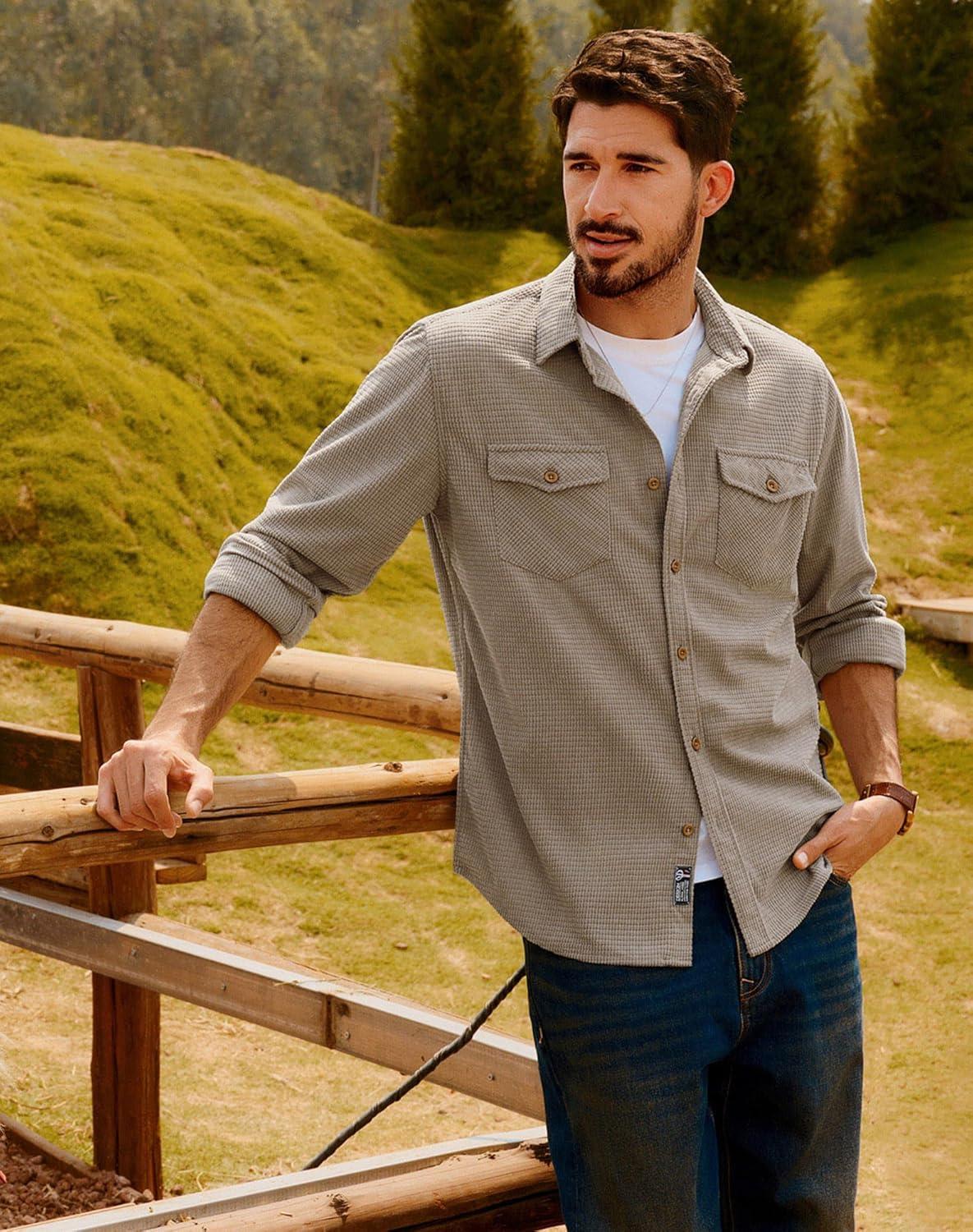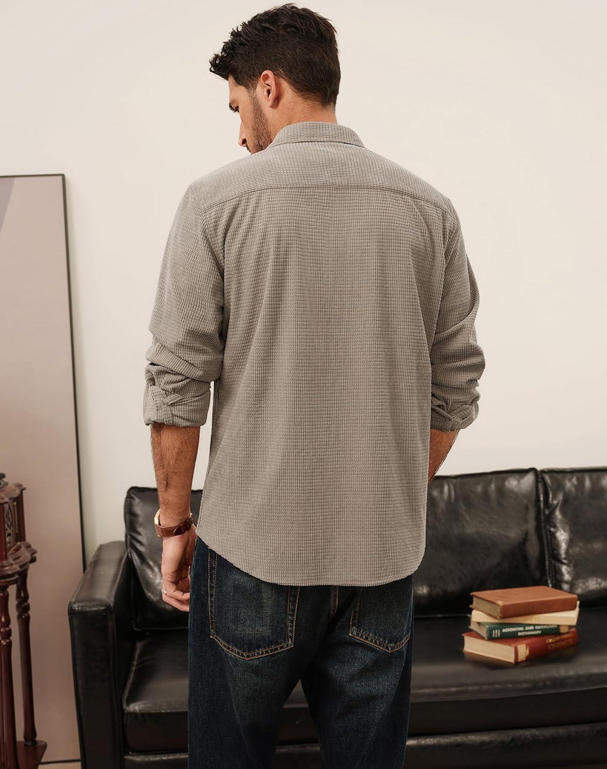 PJ PAUL JONES Men’s Button Down Waffle Textured Shirt Casual Long Sleeve Wrinkle Free Untucked Shirts with Flap Pockets(Khaki)