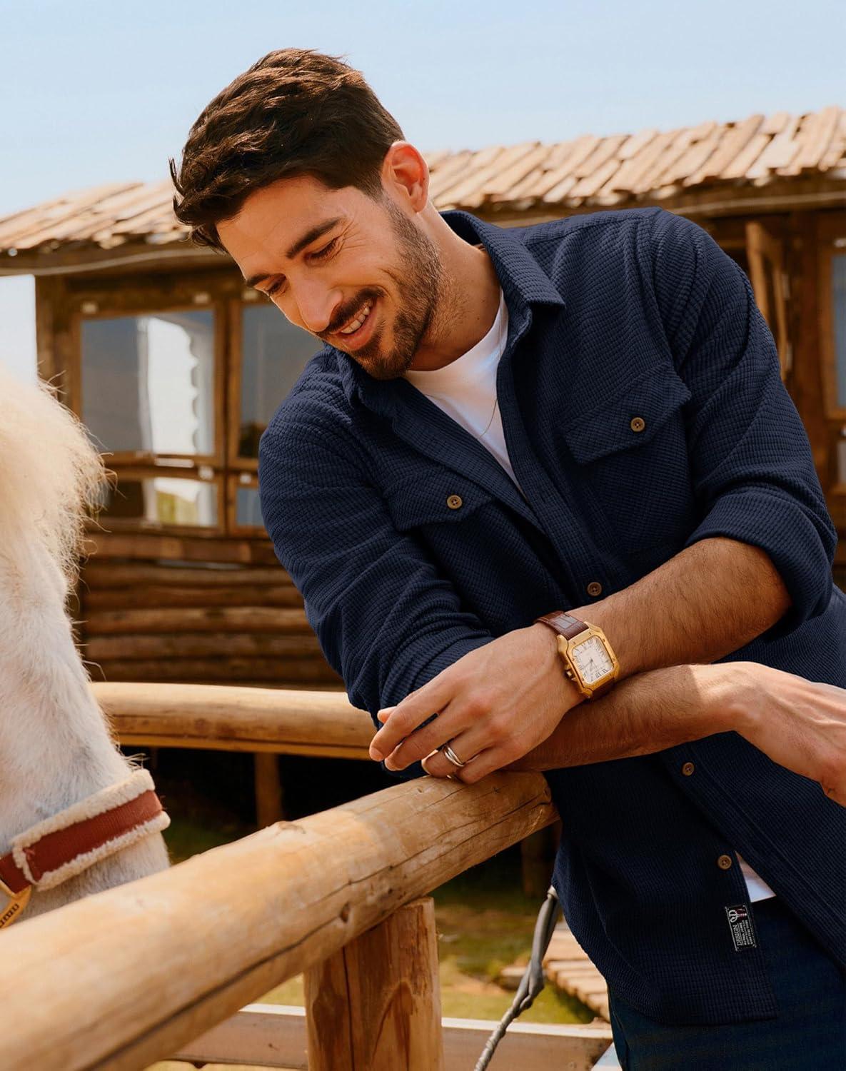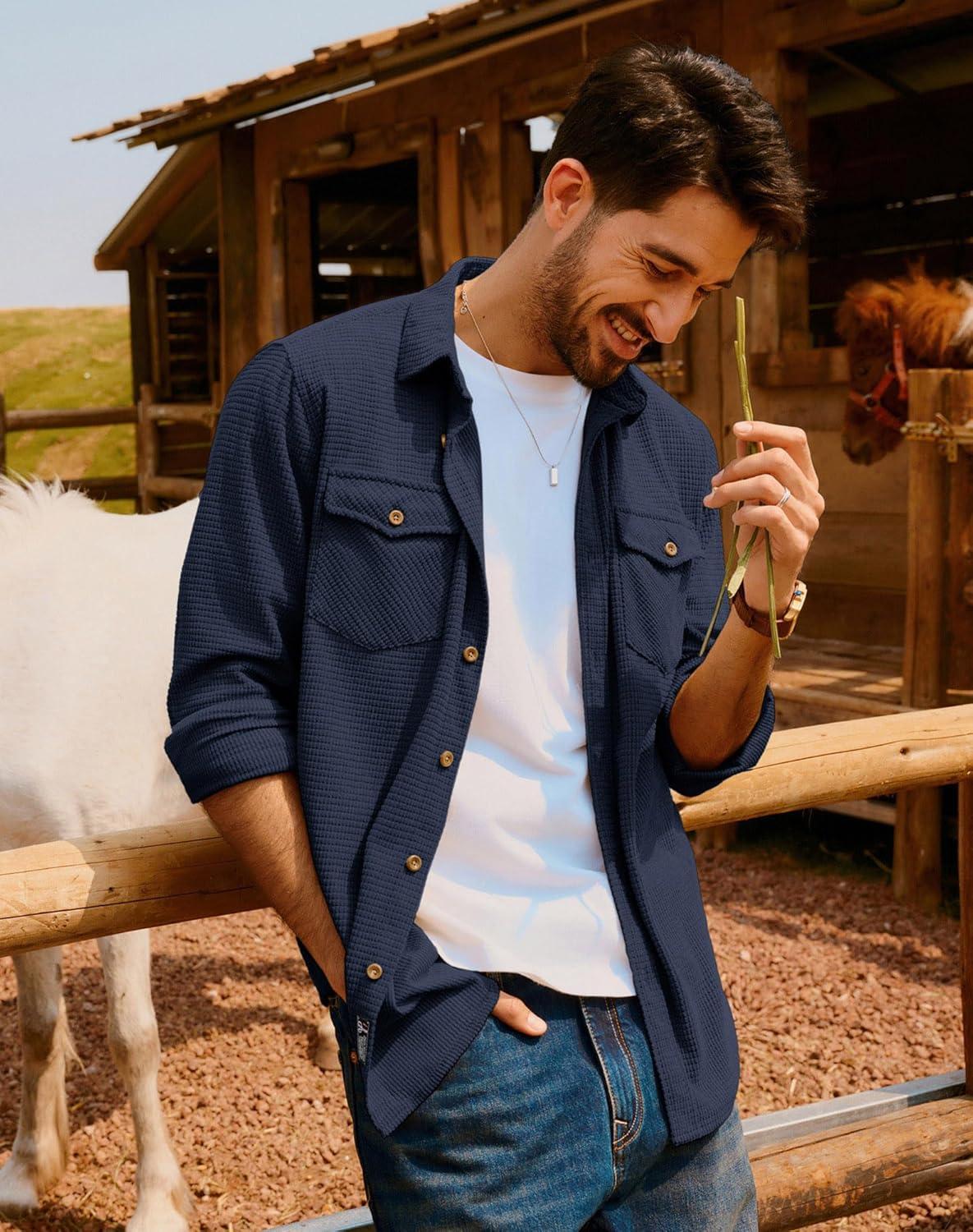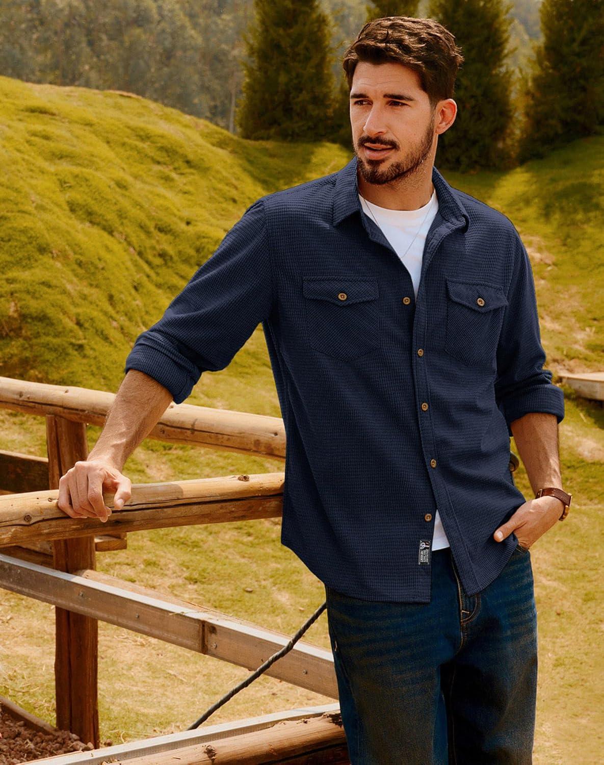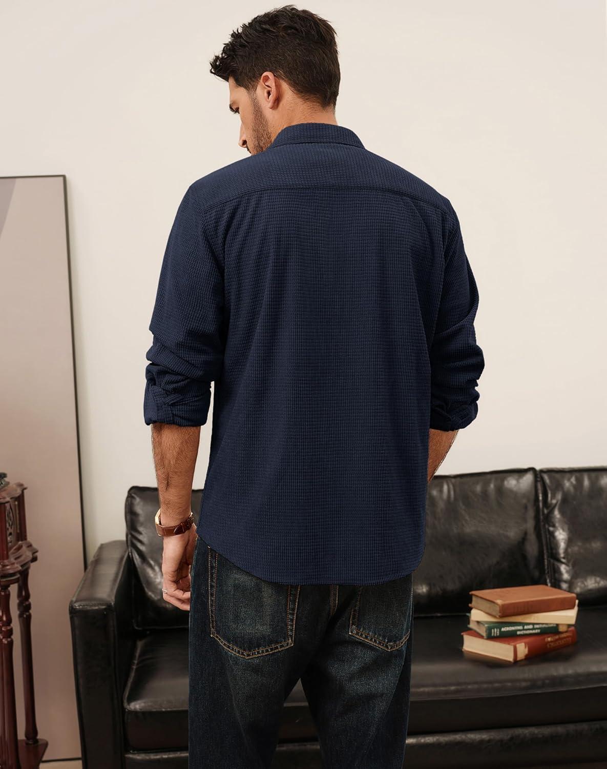 PJ PAUL JONES Men’s Button Down Waffle Textured Shirt Casual Long Sleeve Wrinkle Free Untucked Shirts with Flap Pockets(Navy Blue)