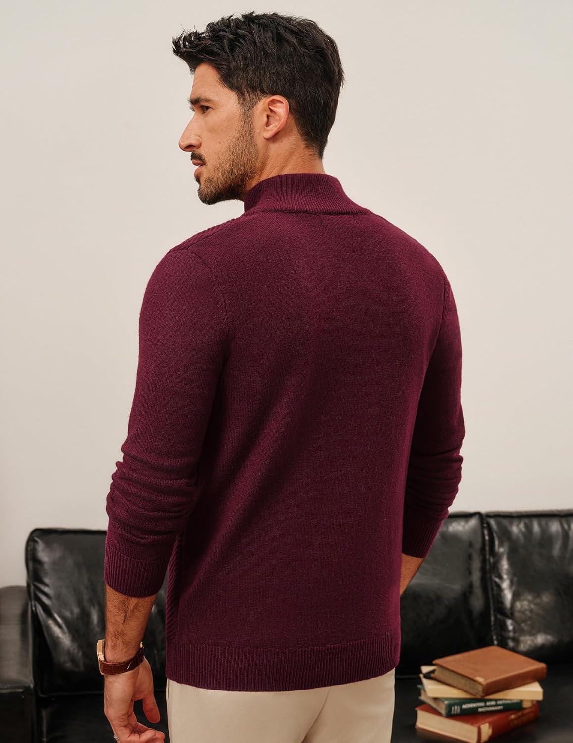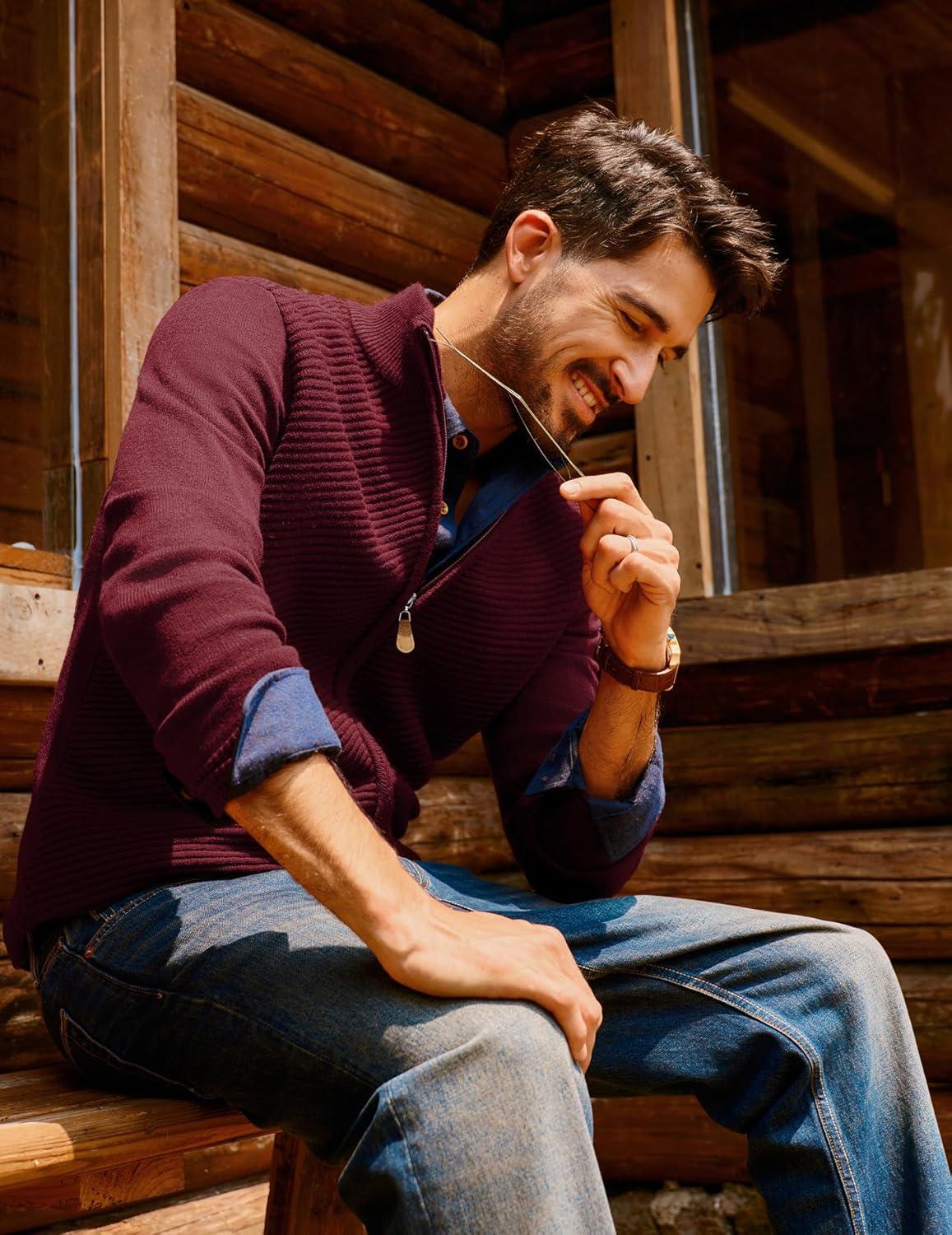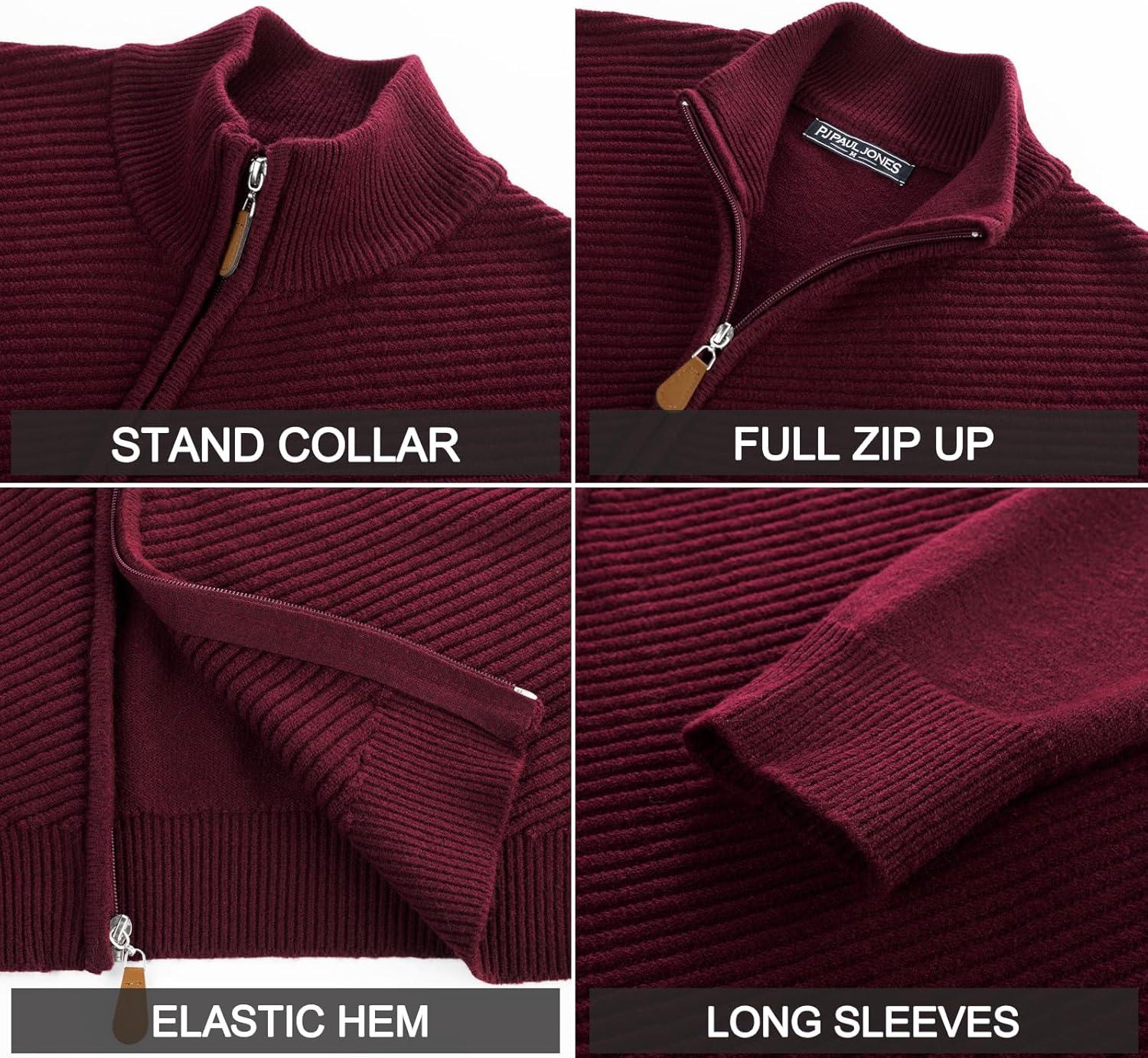 PJ PAUL JONES Mens Cardigan Sweater Full Zip Up Stand Collar Cardigans Fall Casual Knit Sweaters(Wine Red)