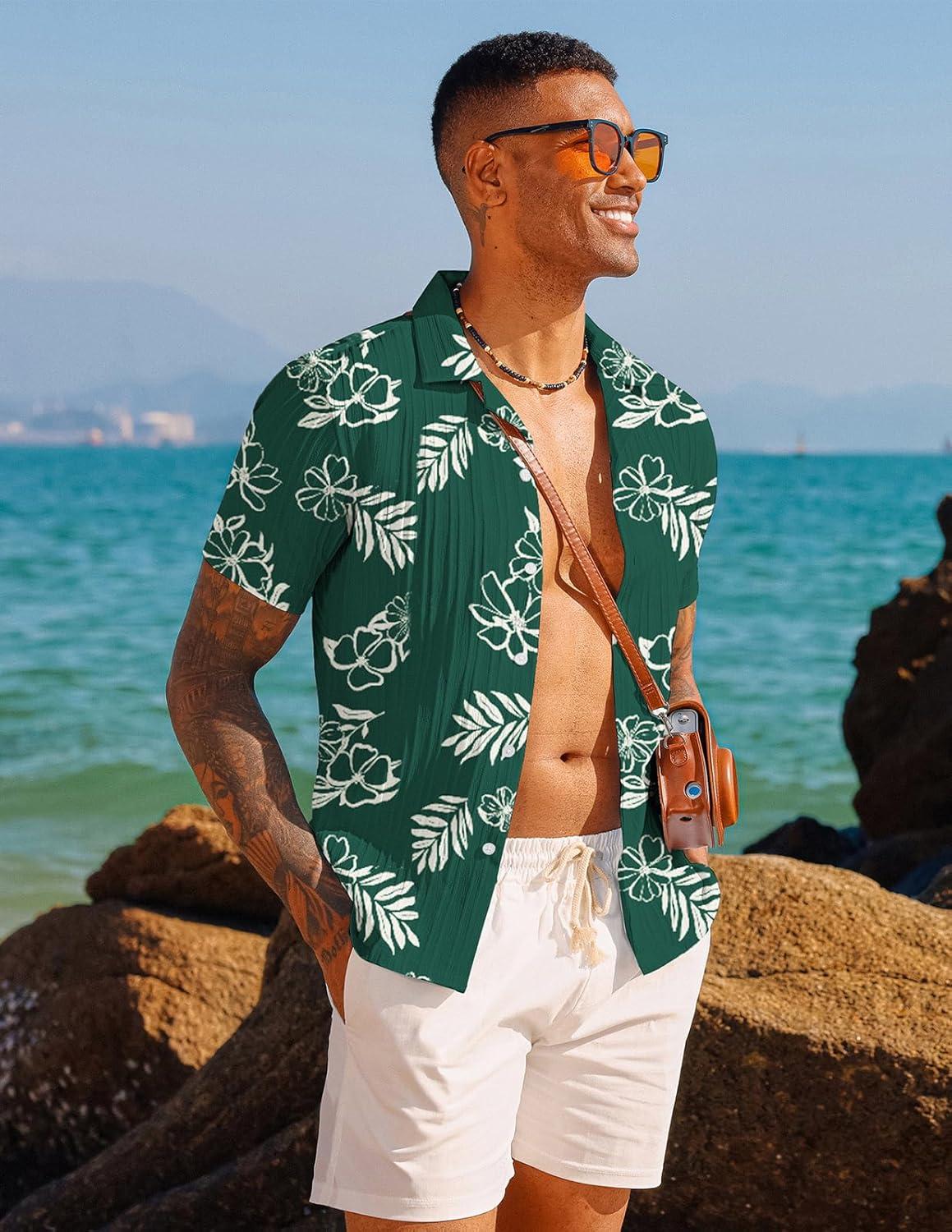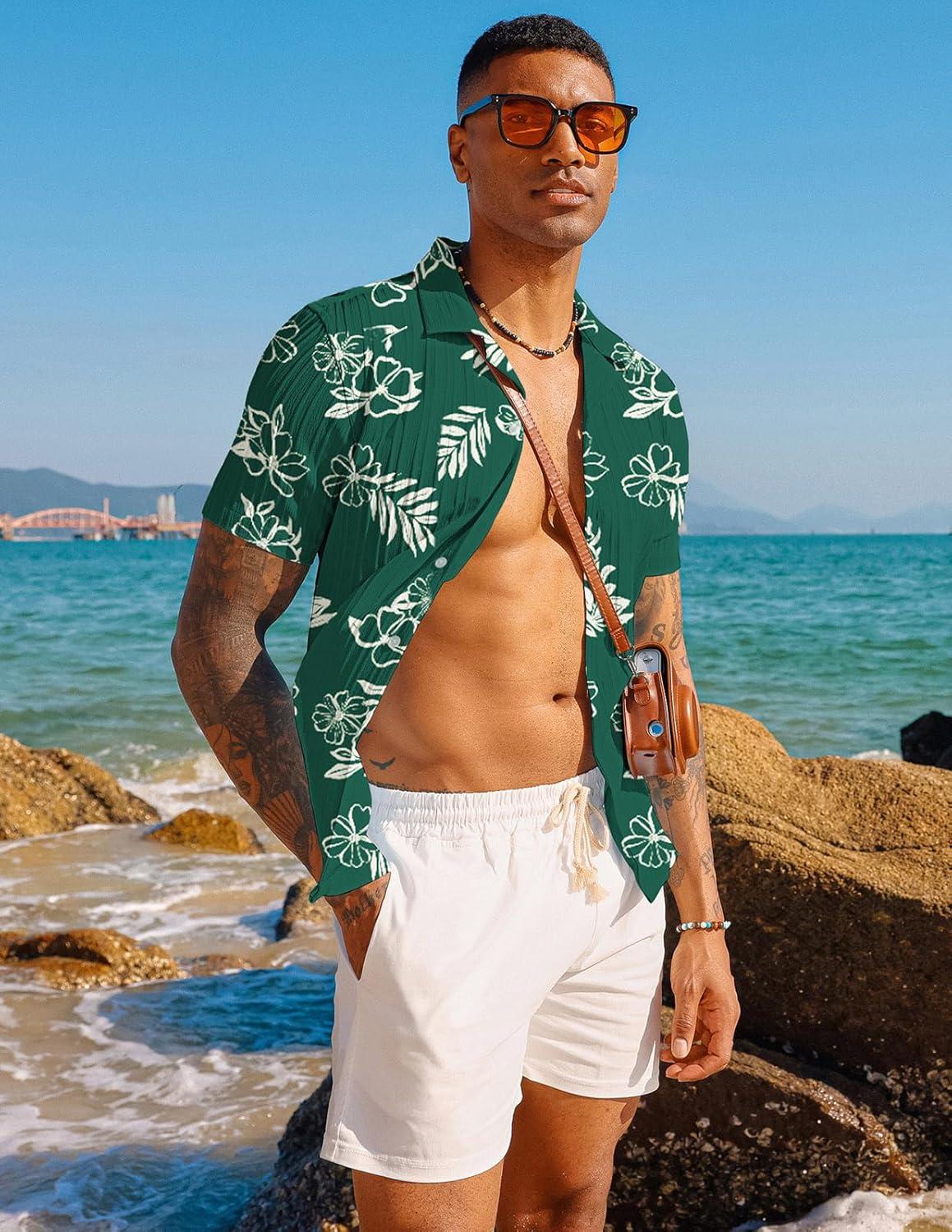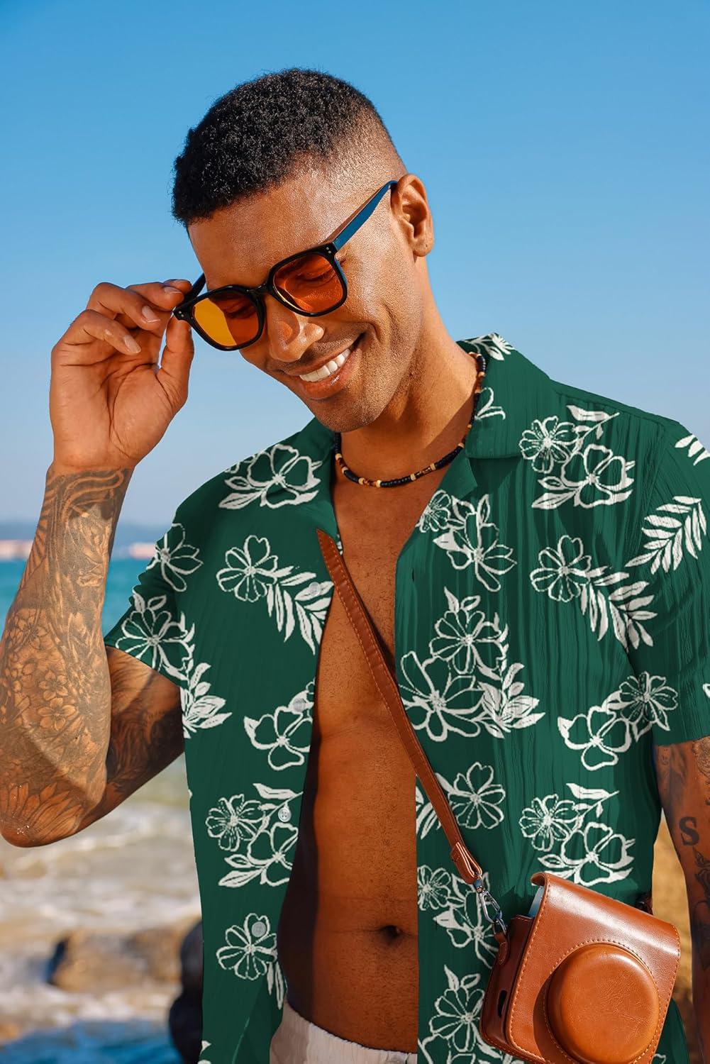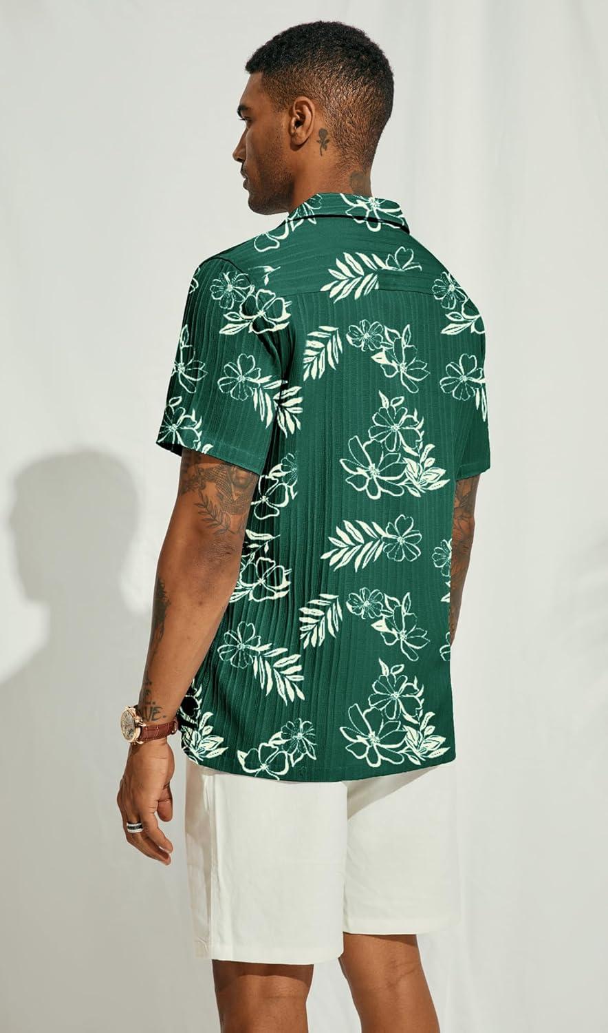 PJ PAUL JONES Men’s Casual Button Down Shirts – Short Sleeve Summer Textured Beach Wrinkle-Free Shirts(Dark Green-floral)