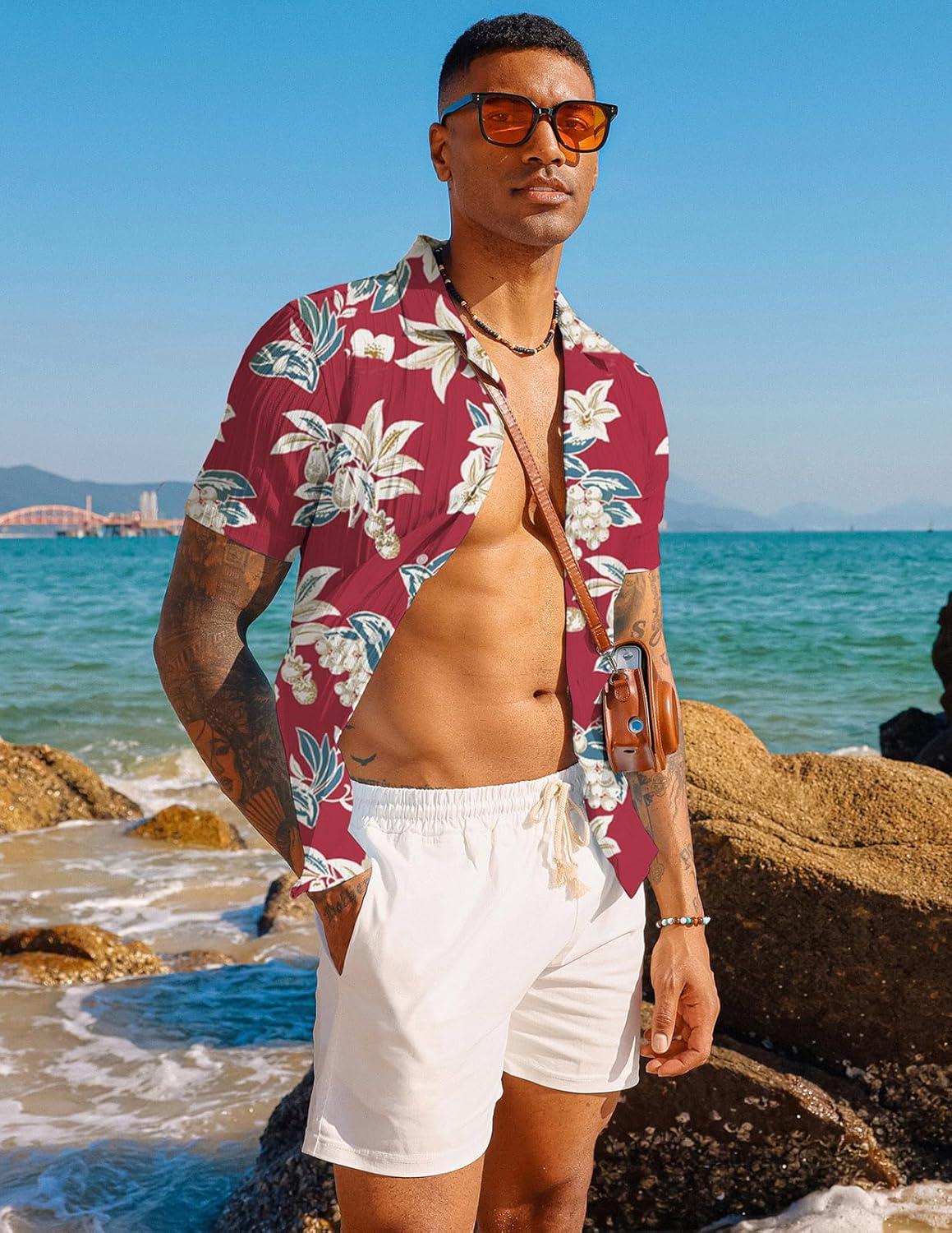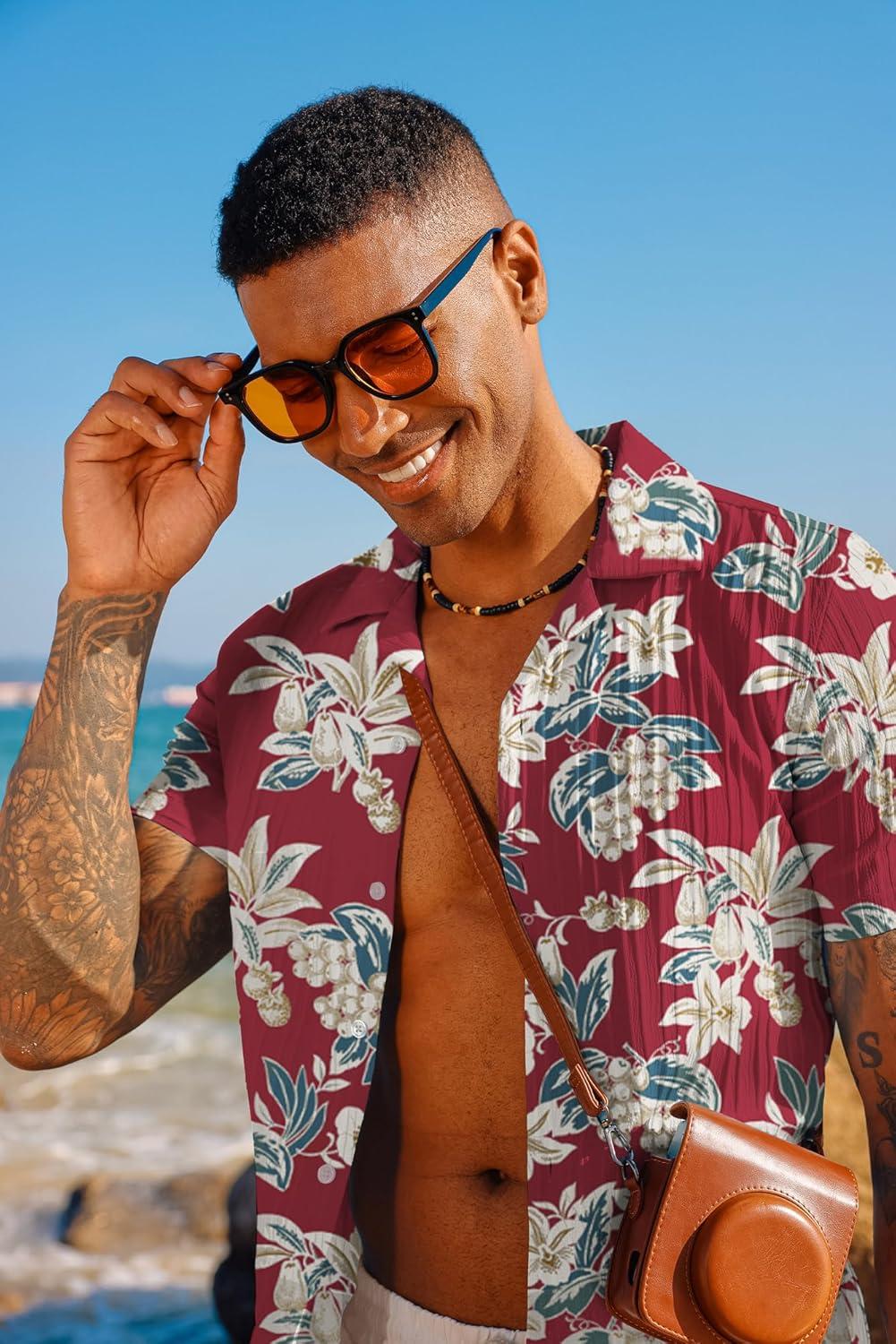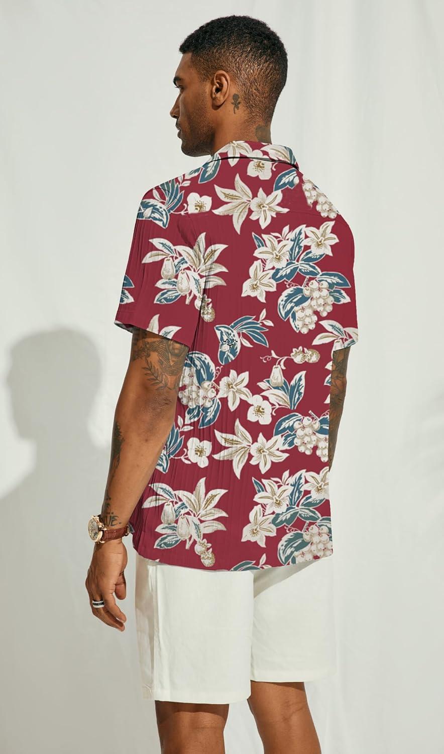 PJ PAUL JONES Men’s Casual Button Down Shirts – Short Sleeve Summer Textured Beach Wrinkle-Free Shirts(Red-floral)