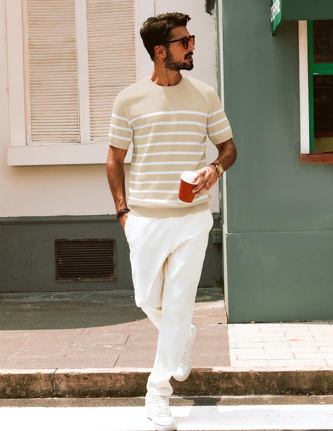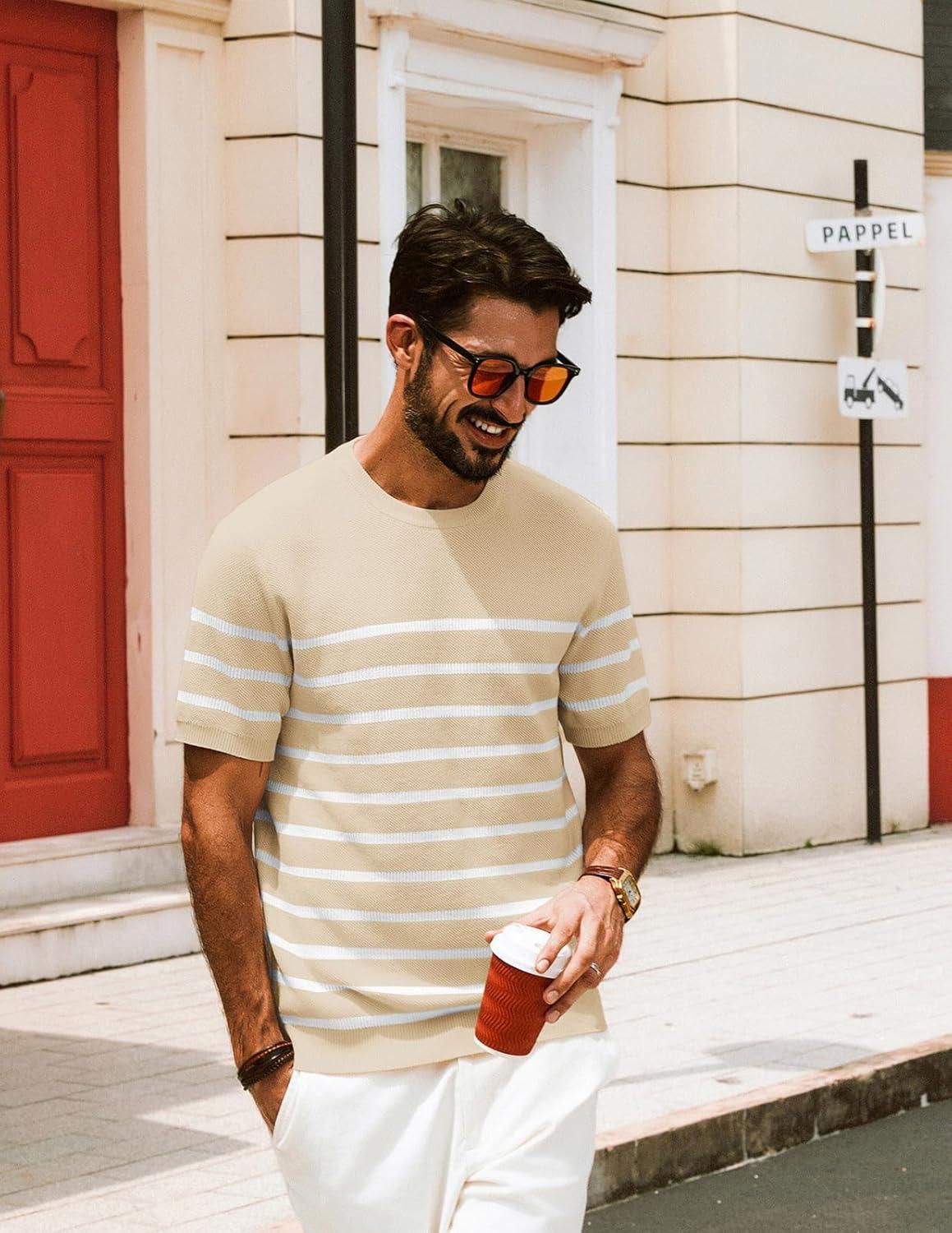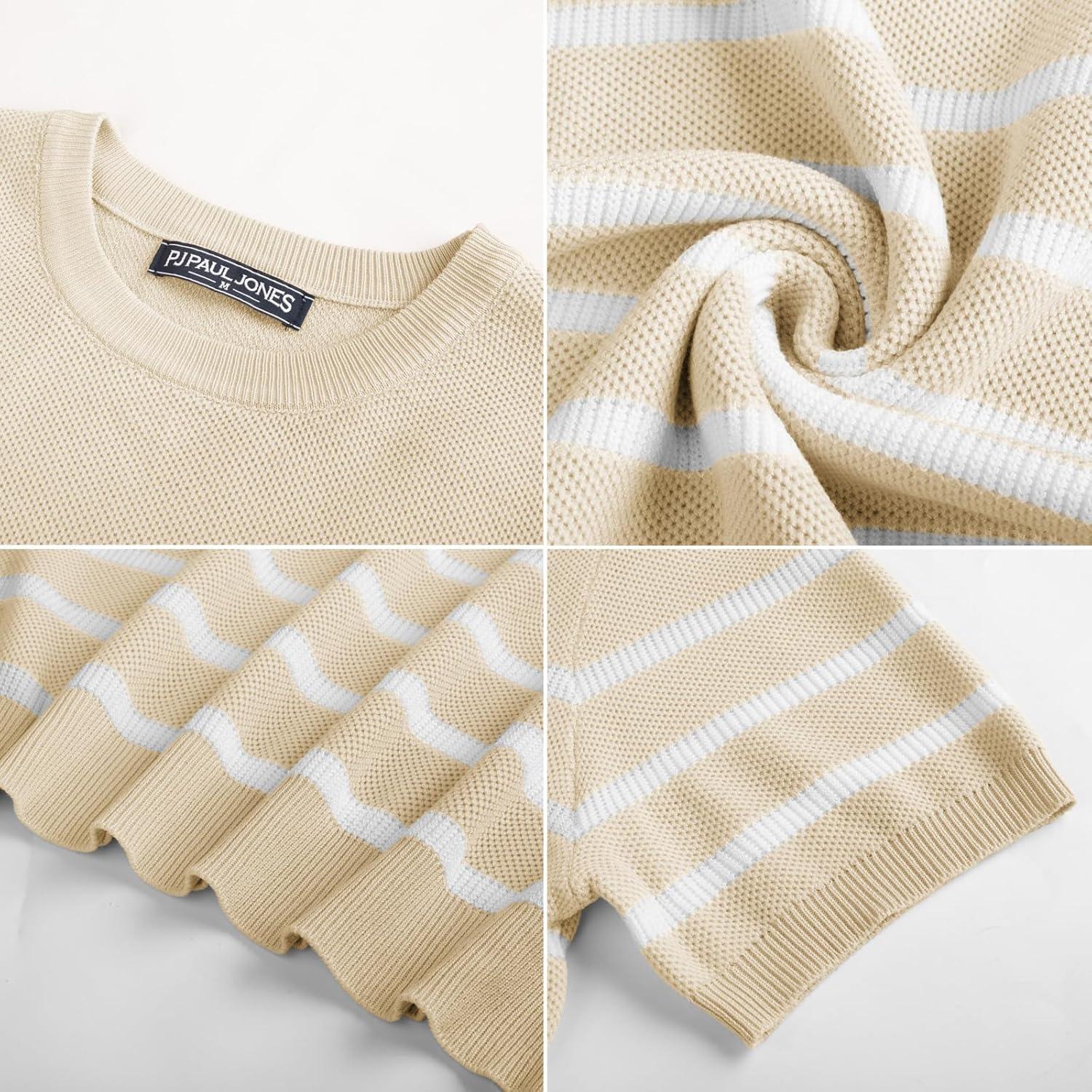 PJ PAUL JONES Mens Casual T-Shirts Classic Short Sleeve Knit Tees Crewneck Solid Tee Shirts(Apricot-striped)