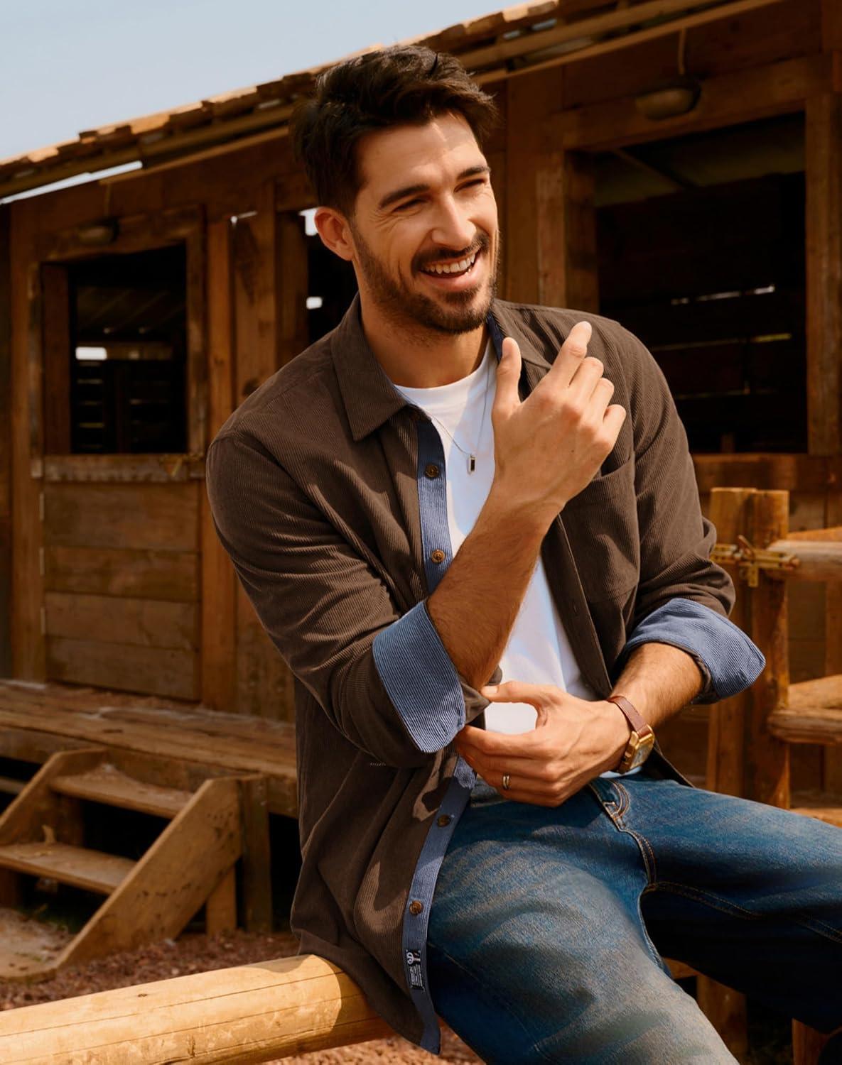 PJ PAUL JONES Men’s Corduroy Button Down Shirt Long Sleeve Casual Collared Wrinkle Free Untucked Shirts with Pocket(Brown)