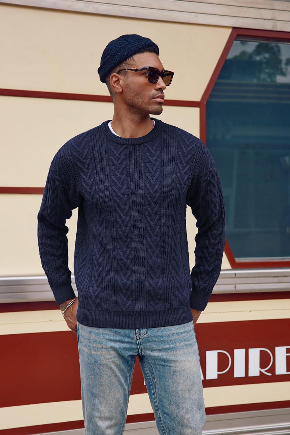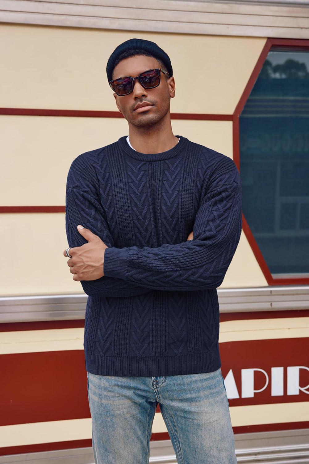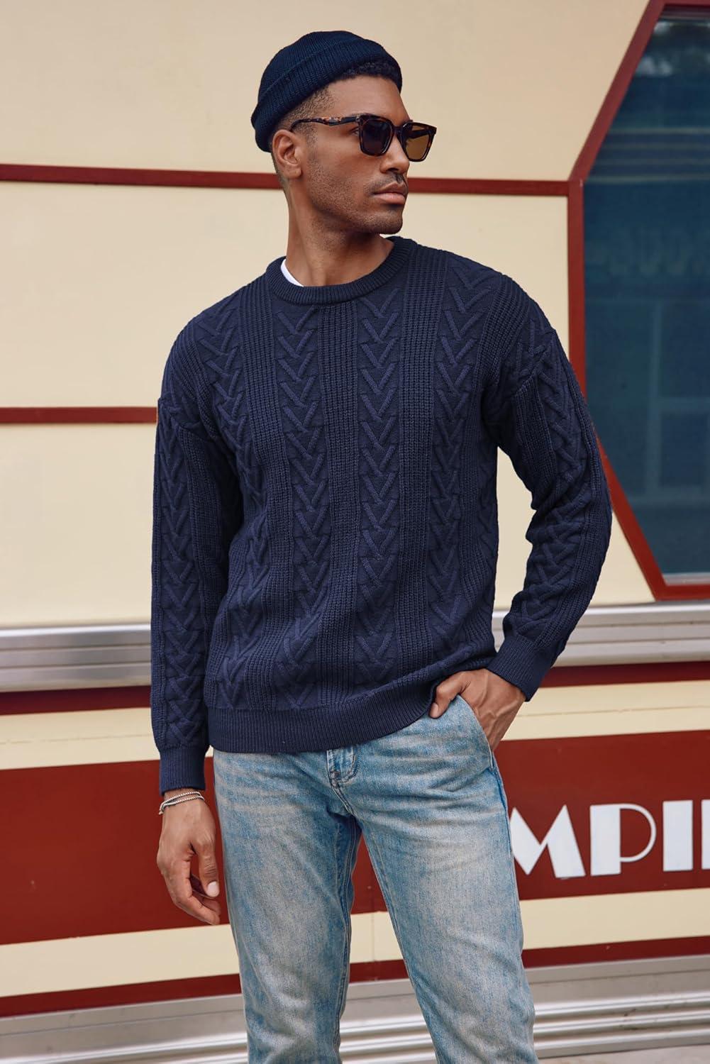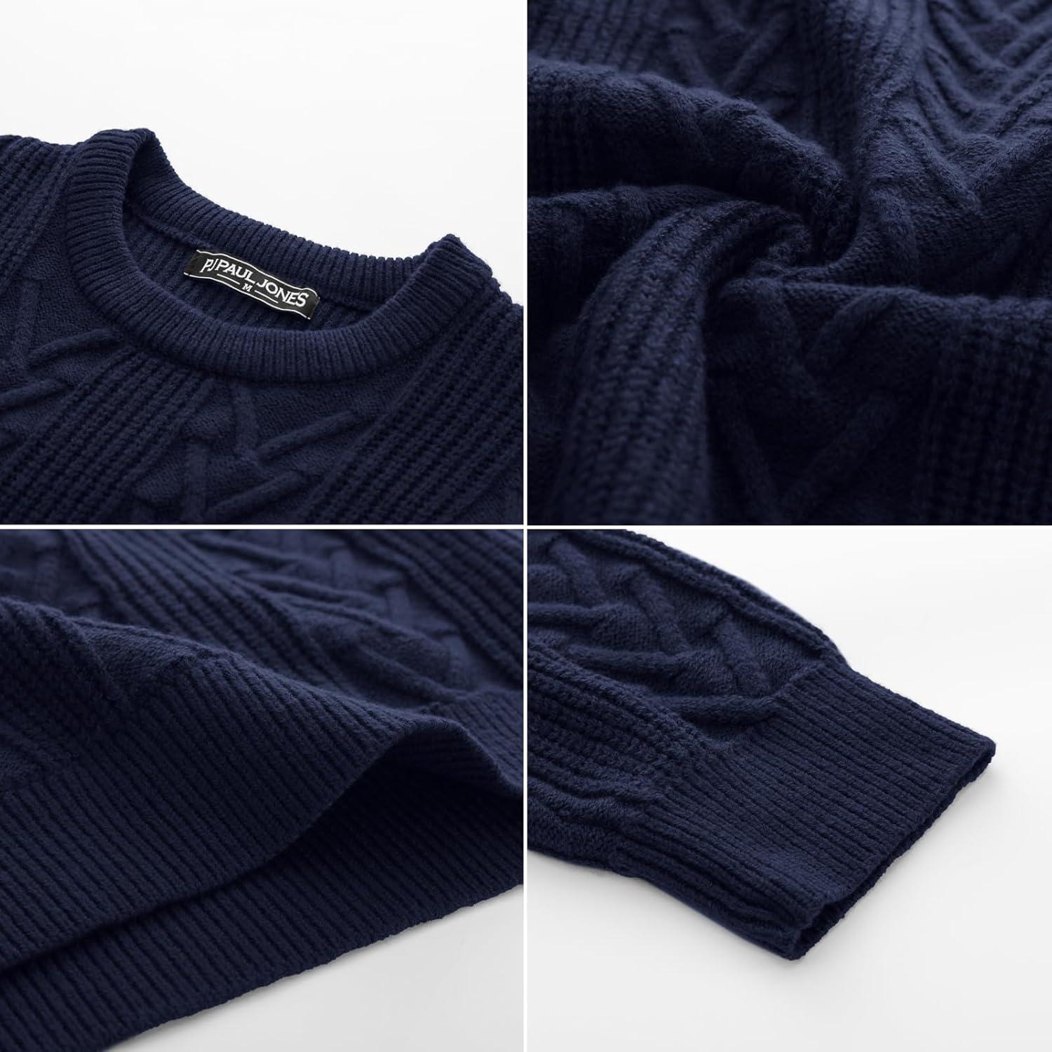 PJ PAUL JONES Mens Crewneck Sweater Casual Cable Knit Pullover Sweater Drop Shoulder Solid Knitted Sweaters(Navy Blue)