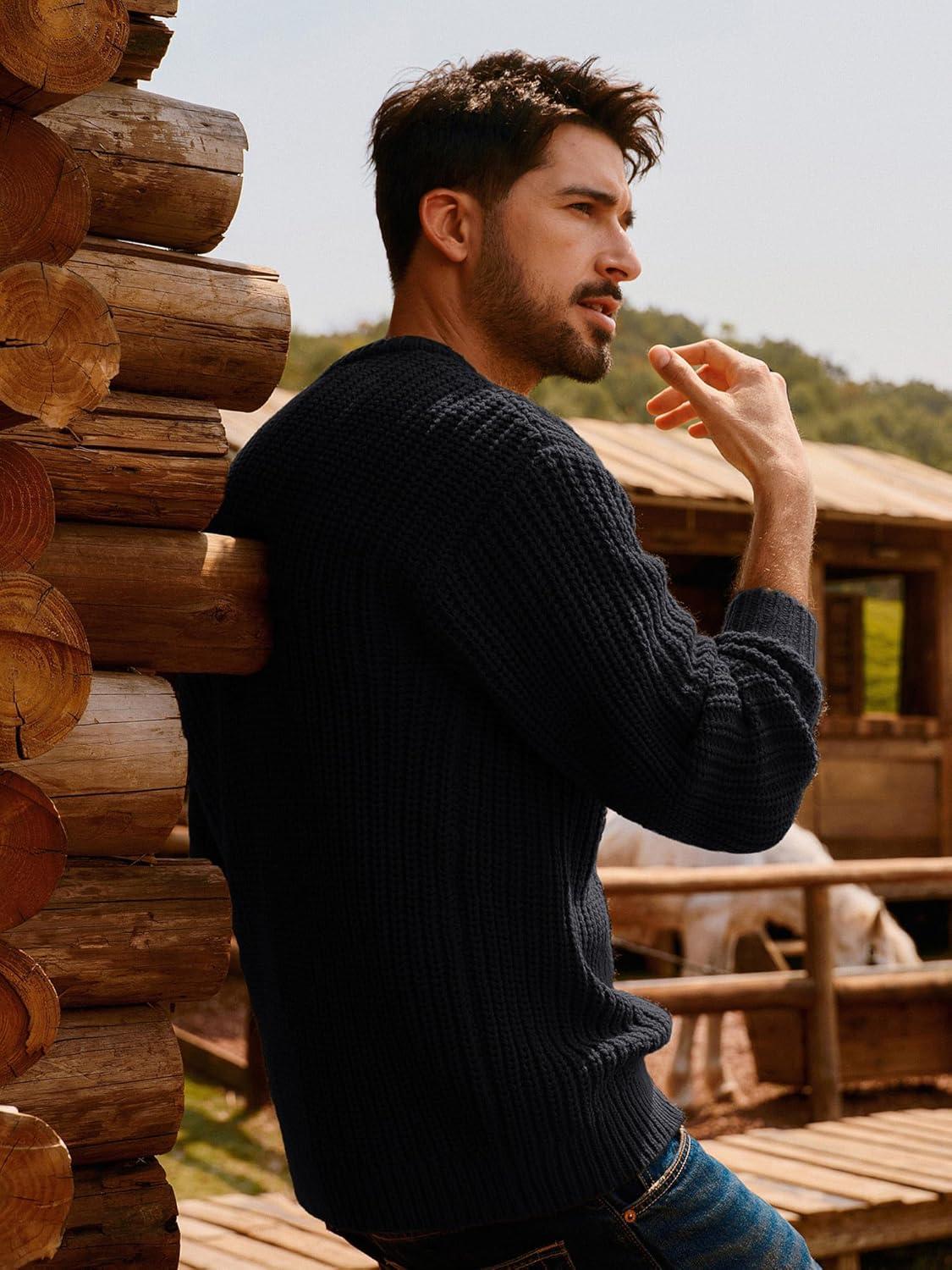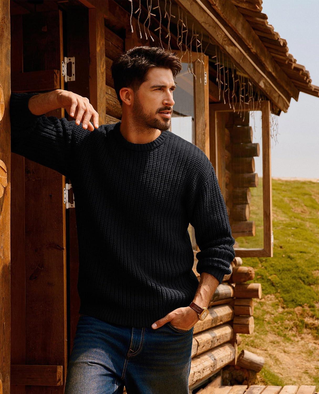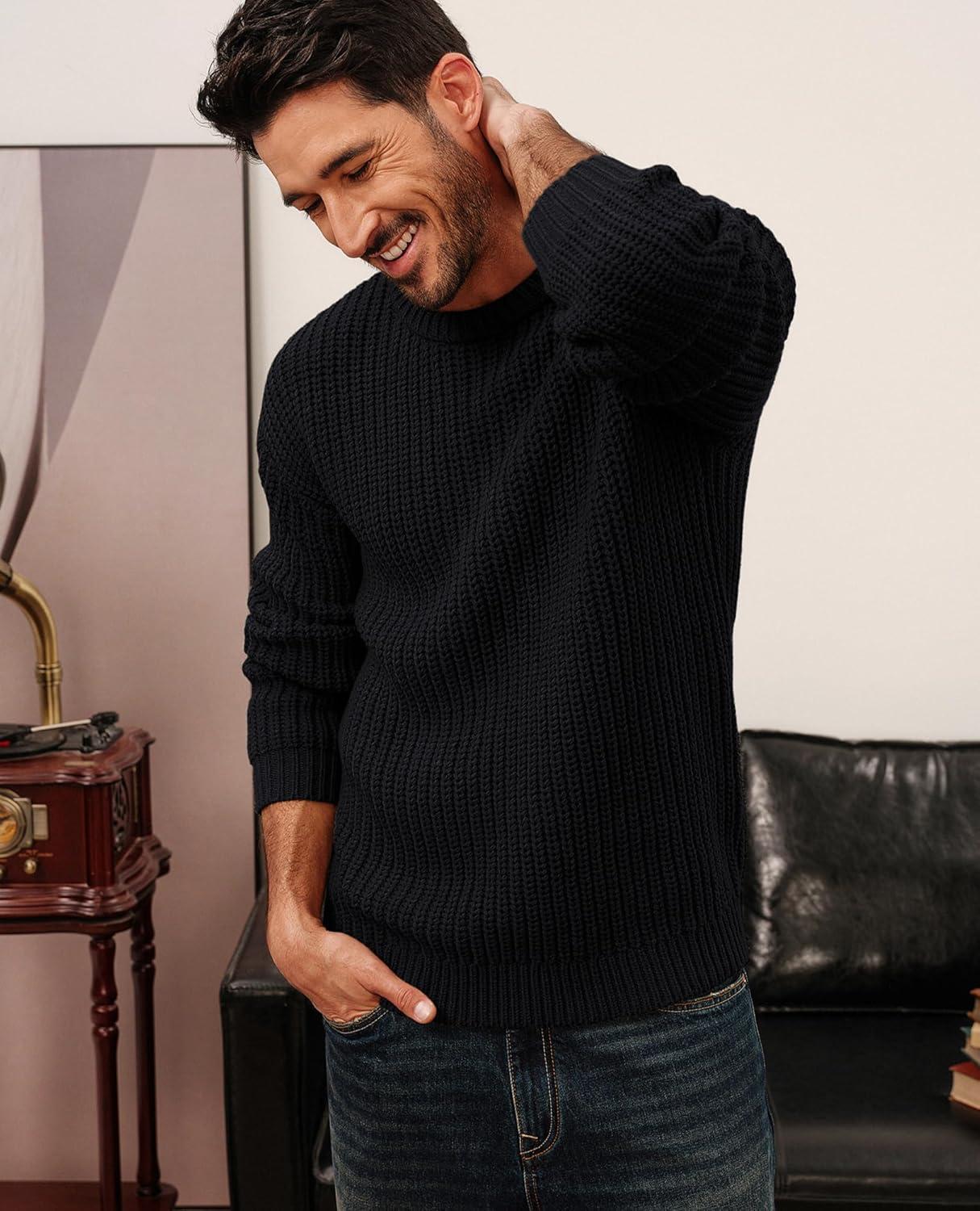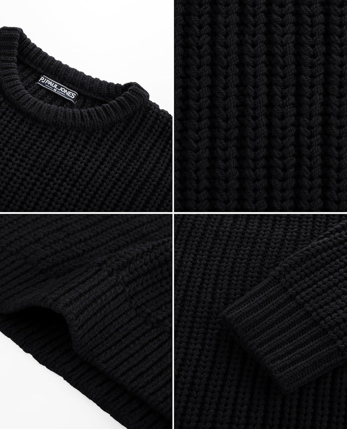 PJ PAUL JONES Men‘s Crewneck Sweater Knitted Textured Casual Pullover for Winter(Black)