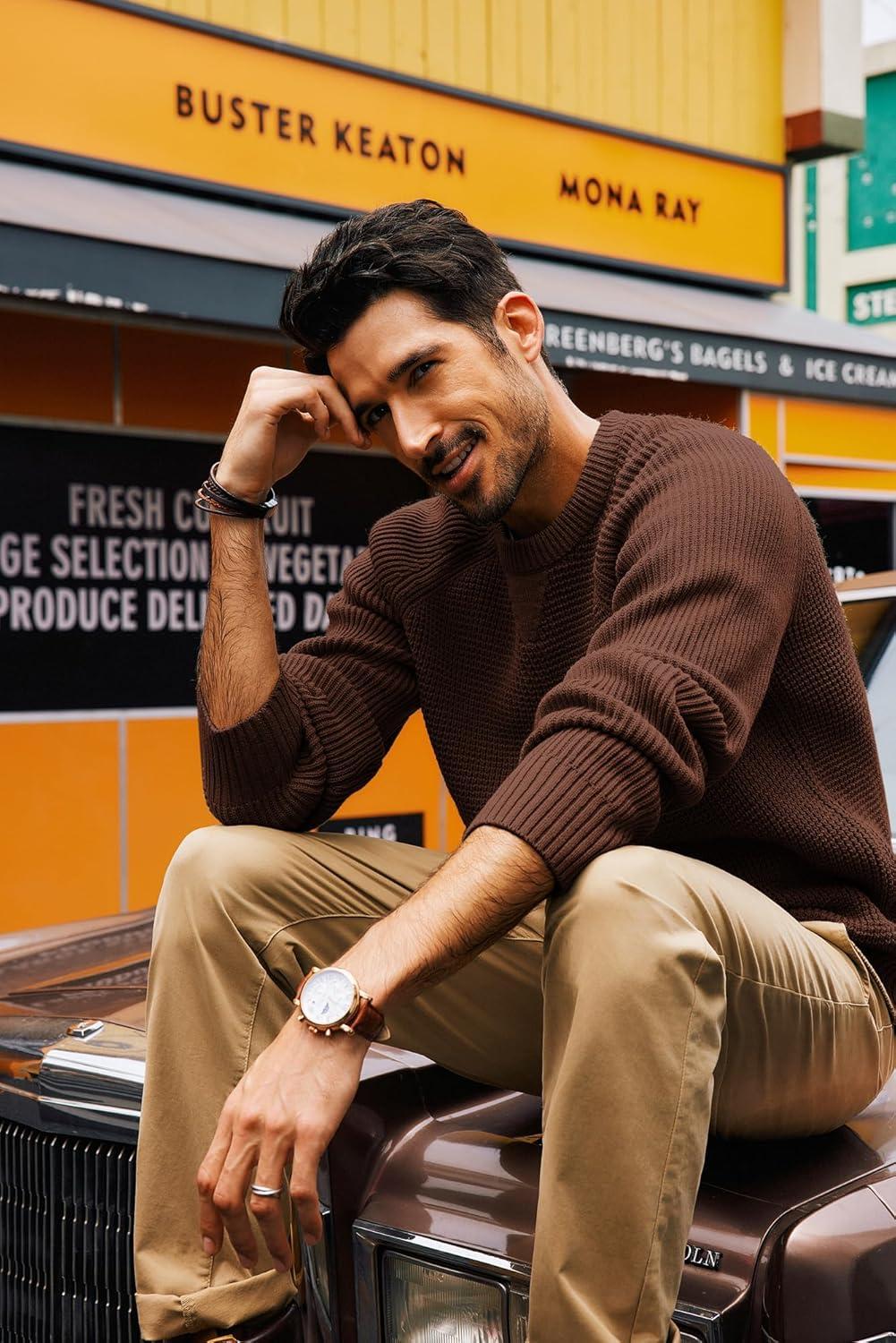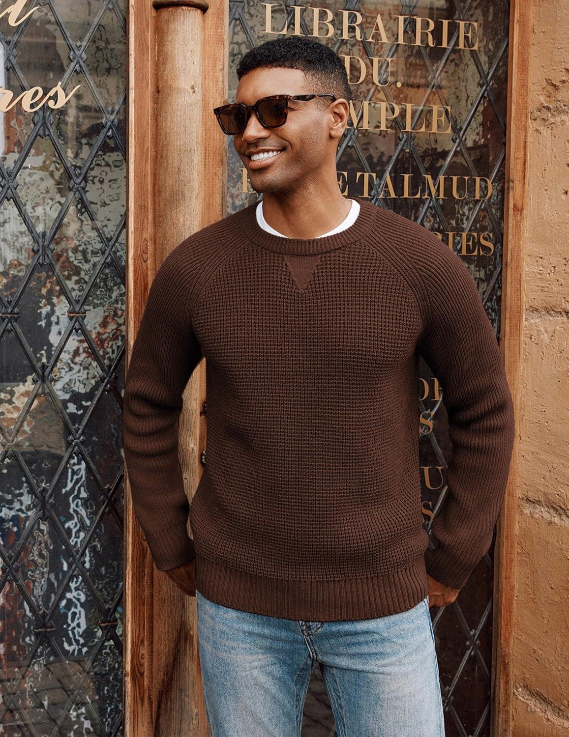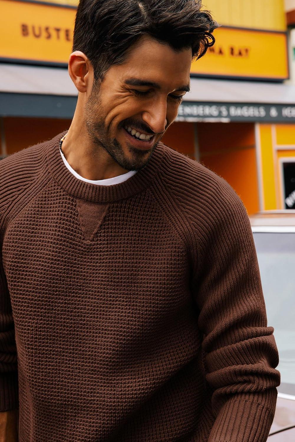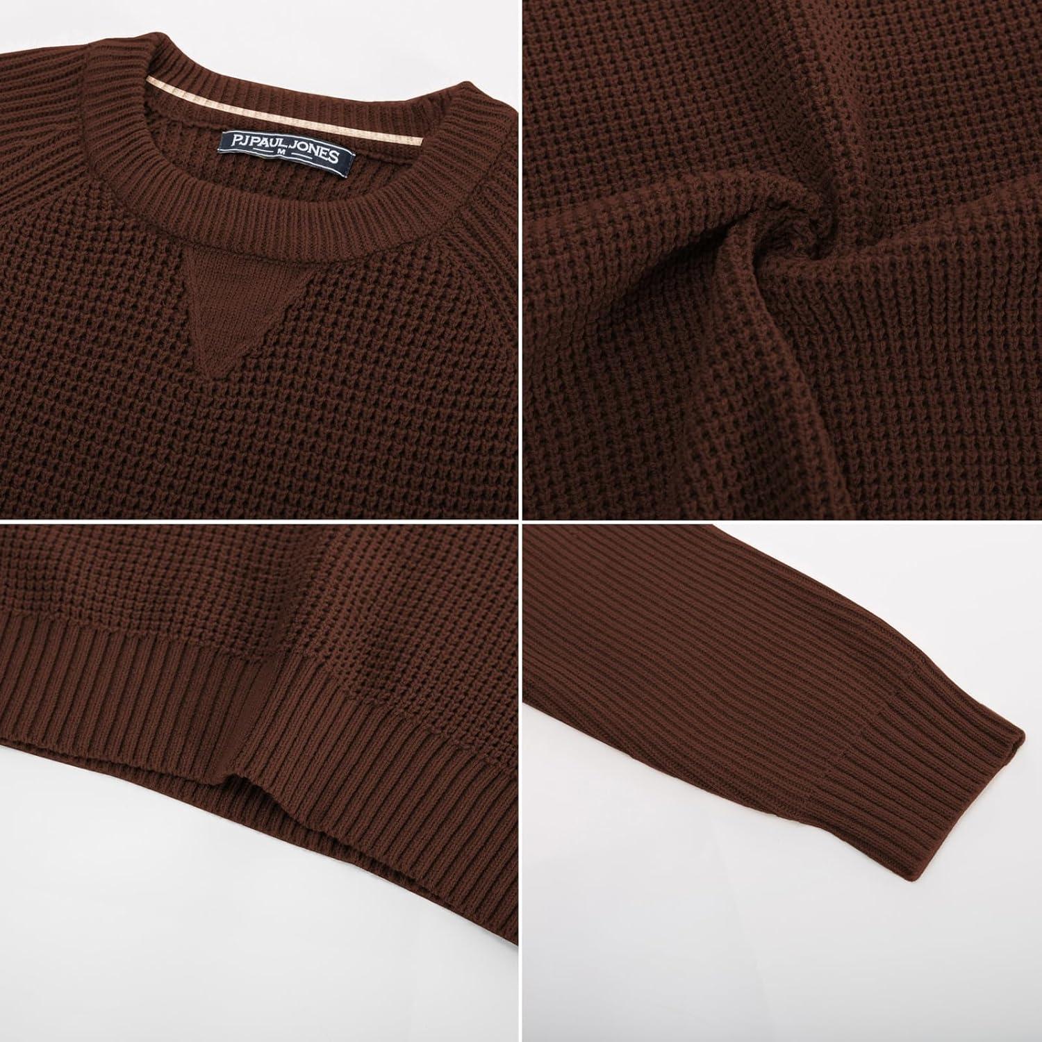 PJ PAUL JONES Mens Crewneck Sweater Waffle Knitted Pullover Sweaters Raglan Sleeve Knitwear Sweaters(Coffee)