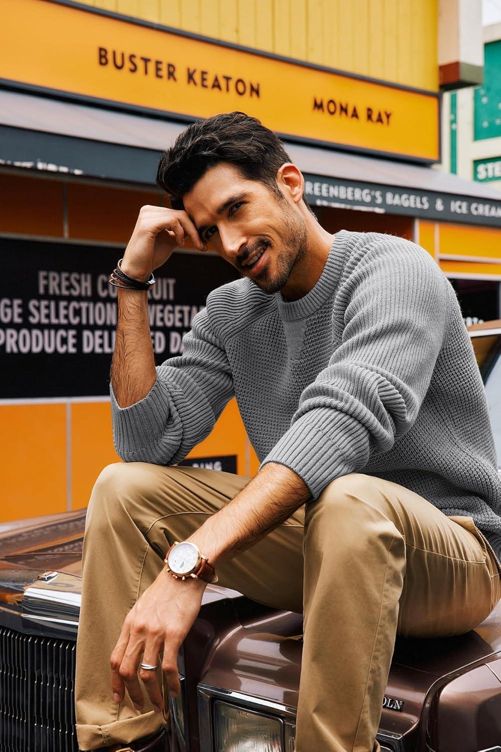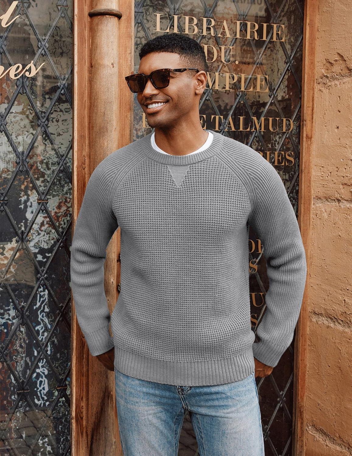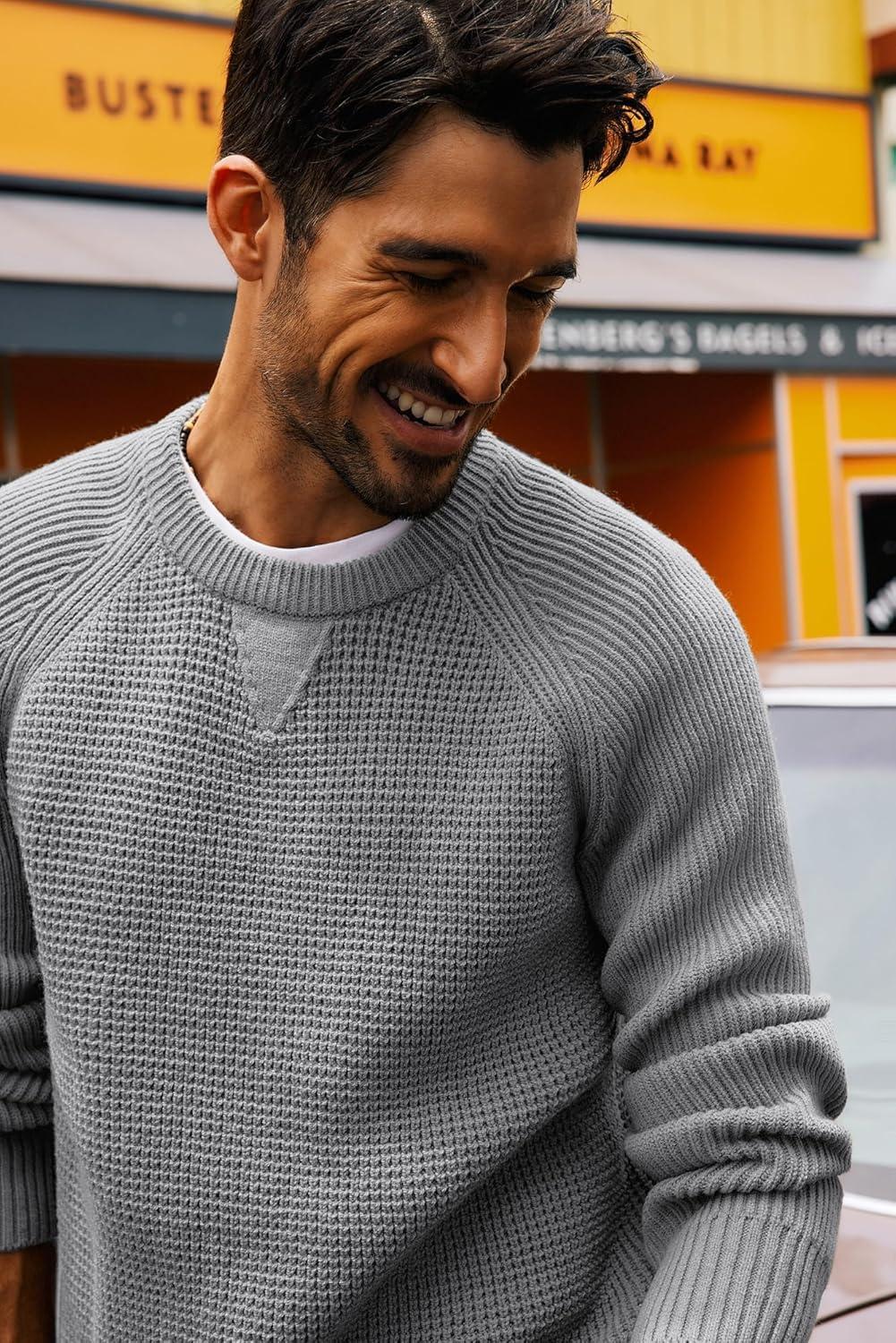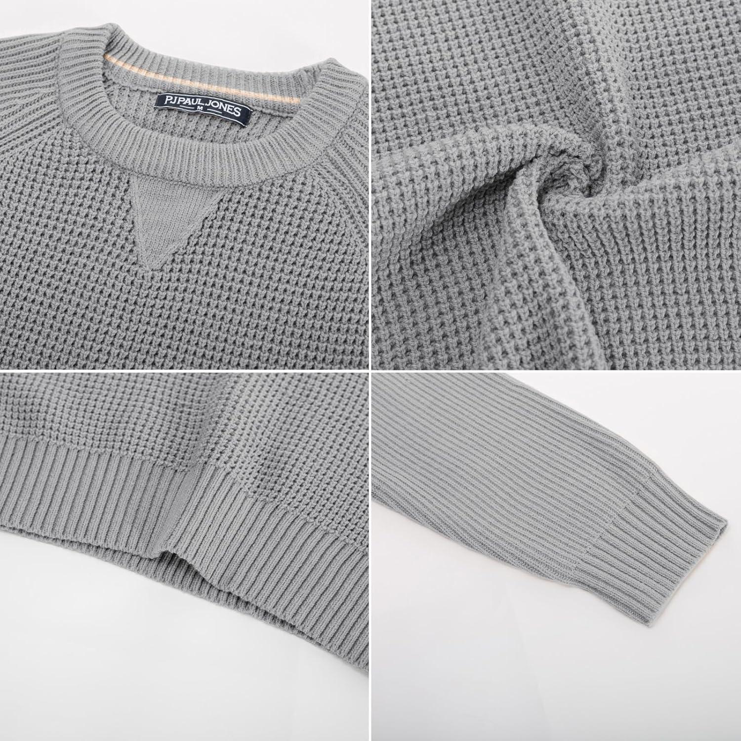 PJ PAUL JONES Mens Crewneck Sweater Waffle Knitted Pullover Sweaters Raglan Sleeve Knitwear Sweaters(Grey)