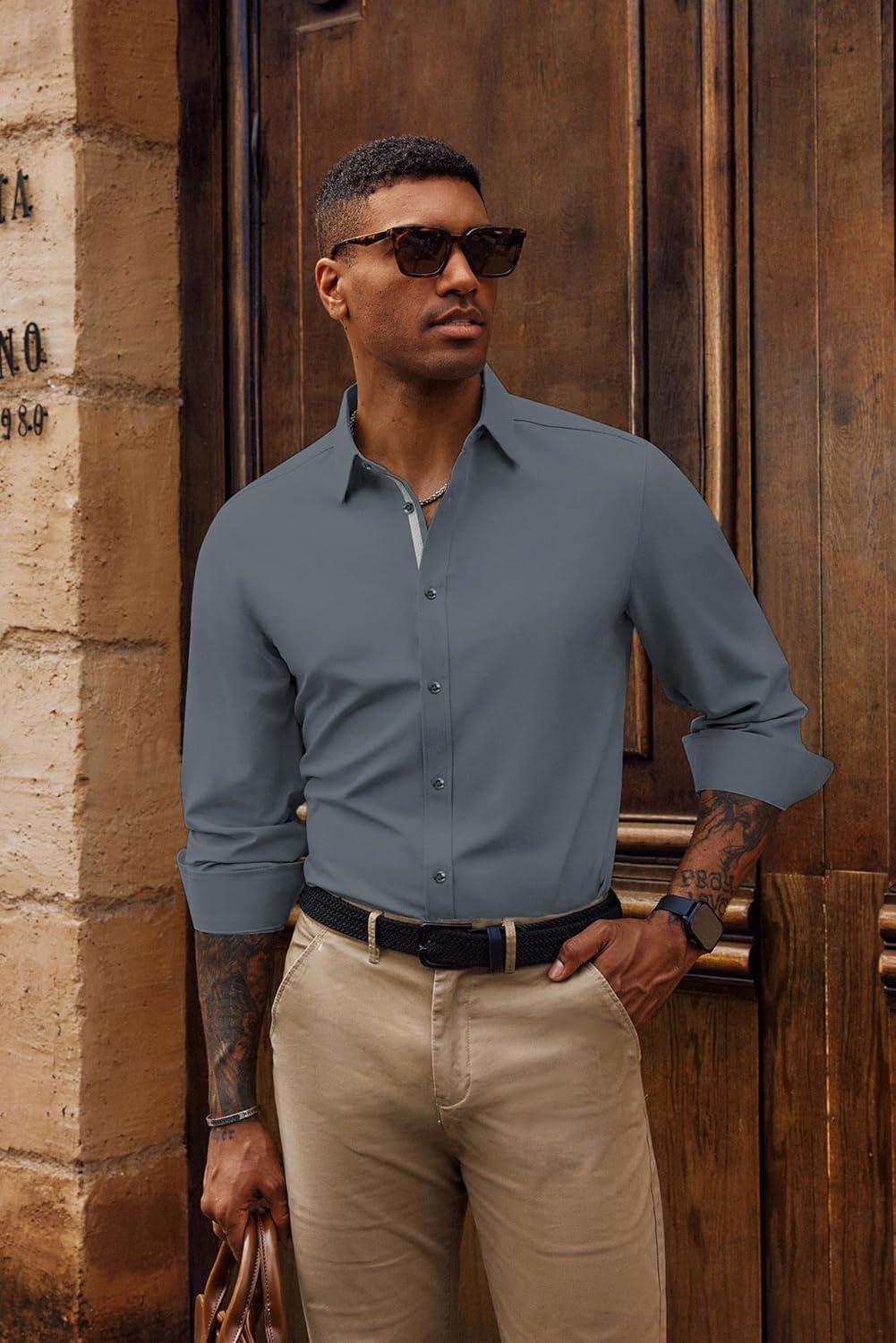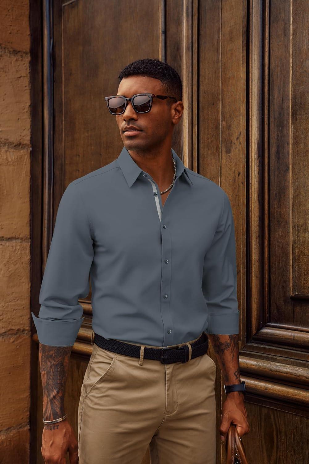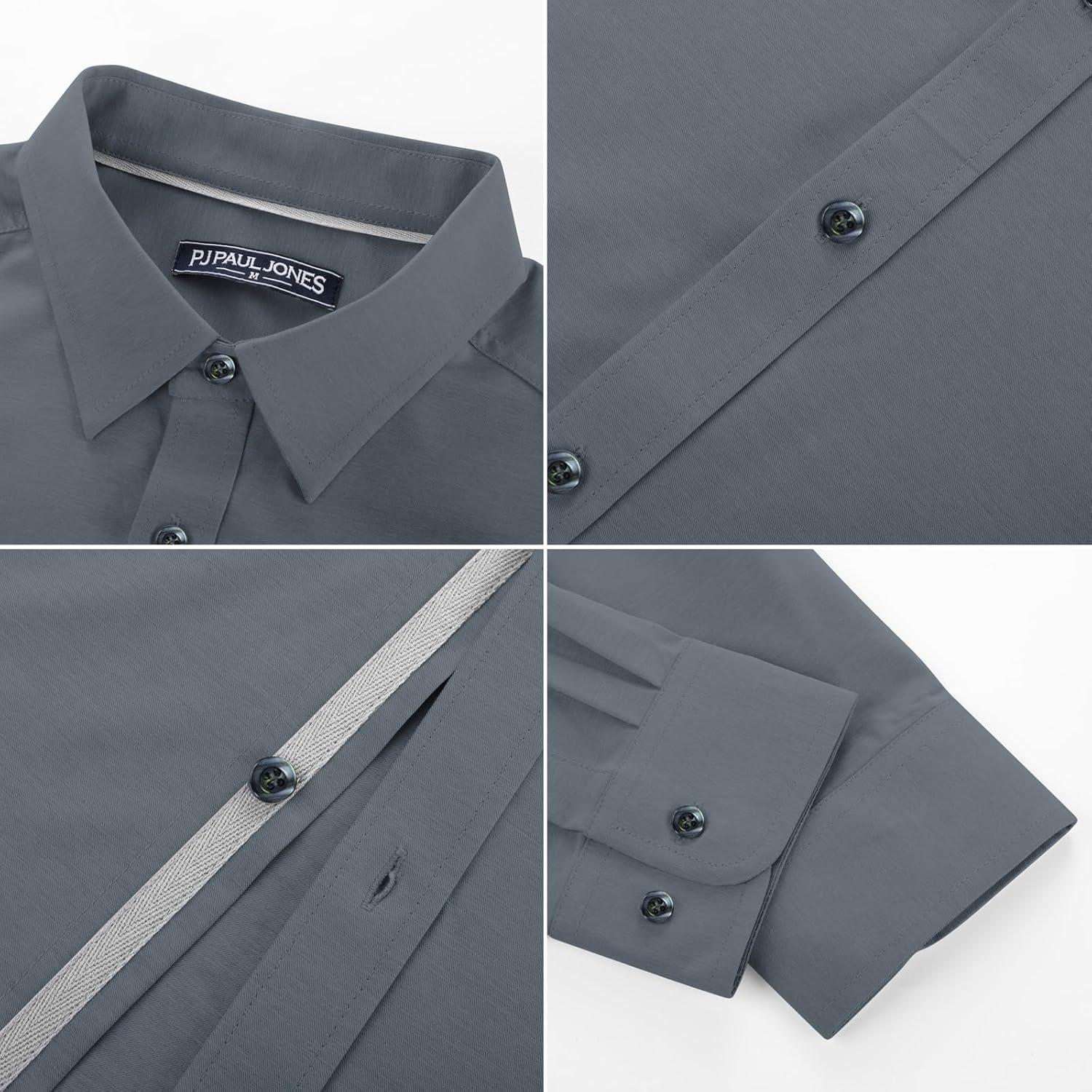 PJ PAUL JONES Mens Dress Shirts Wrinkle Free Stretch Button Down Shirt Casual Long Sleeve Business Shirts(Blue Gray)