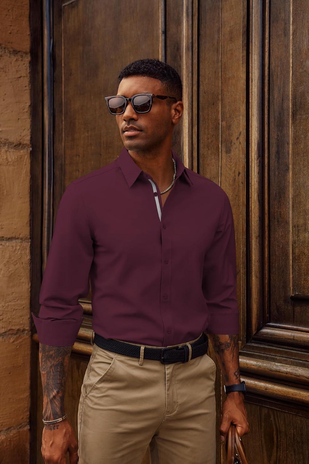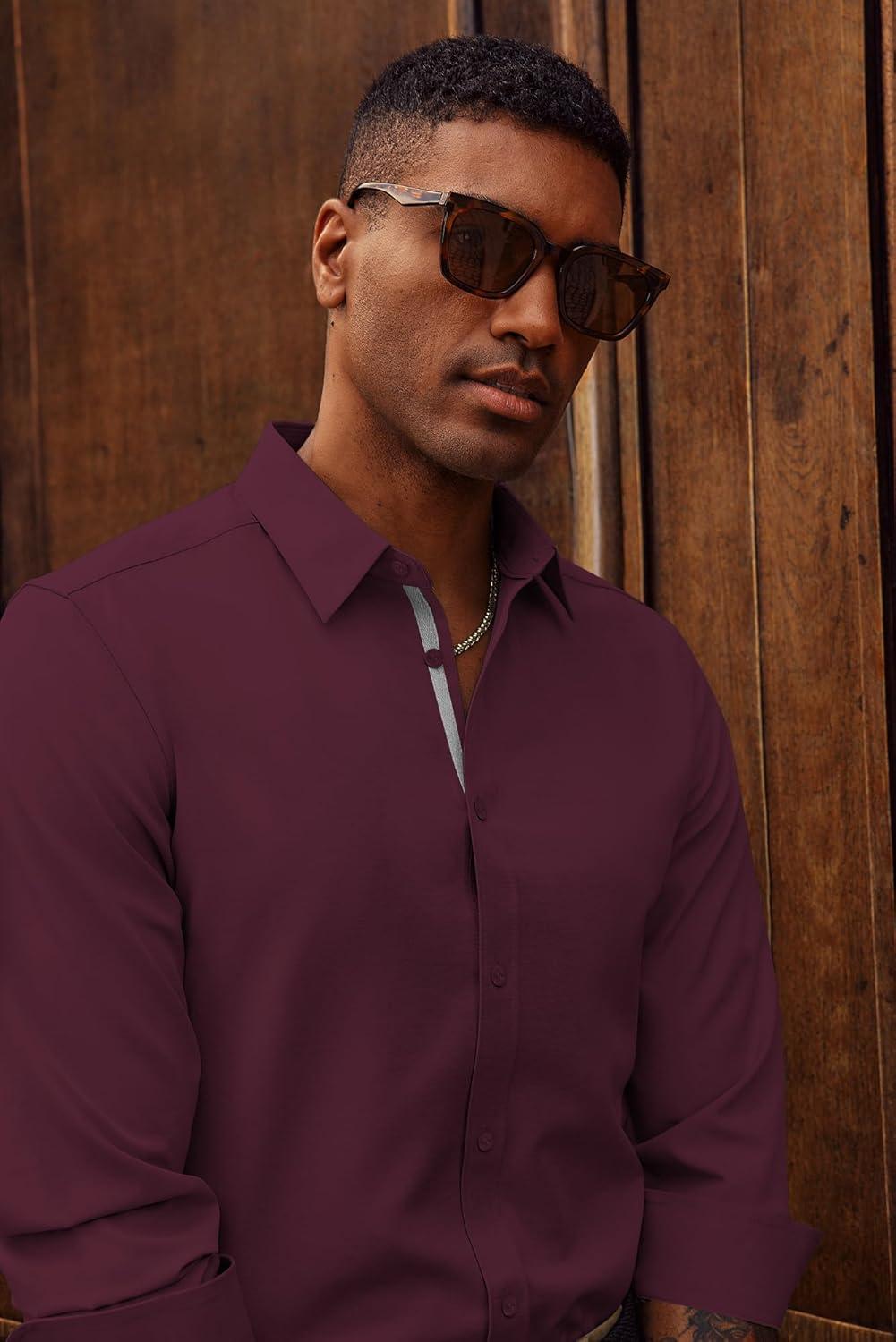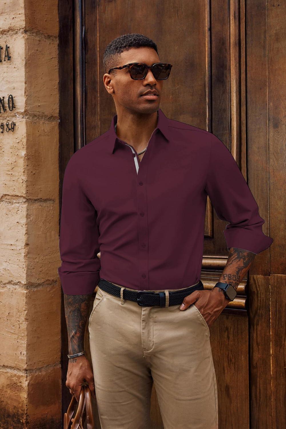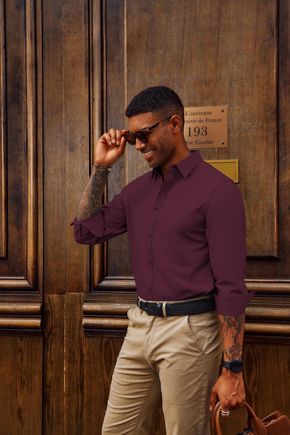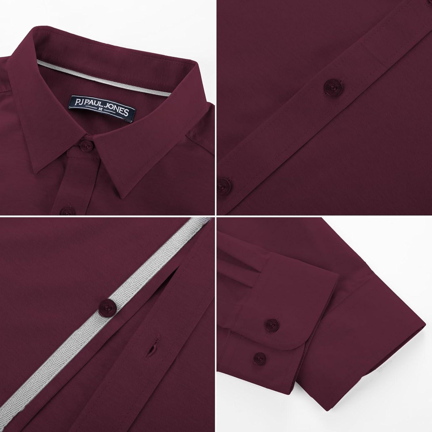 PJ PAUL JONES Mens Dress Shirts Wrinkle Free Stretch Button Down Shirt Casual Long Sleeve Business Shirts(Burgundy)
