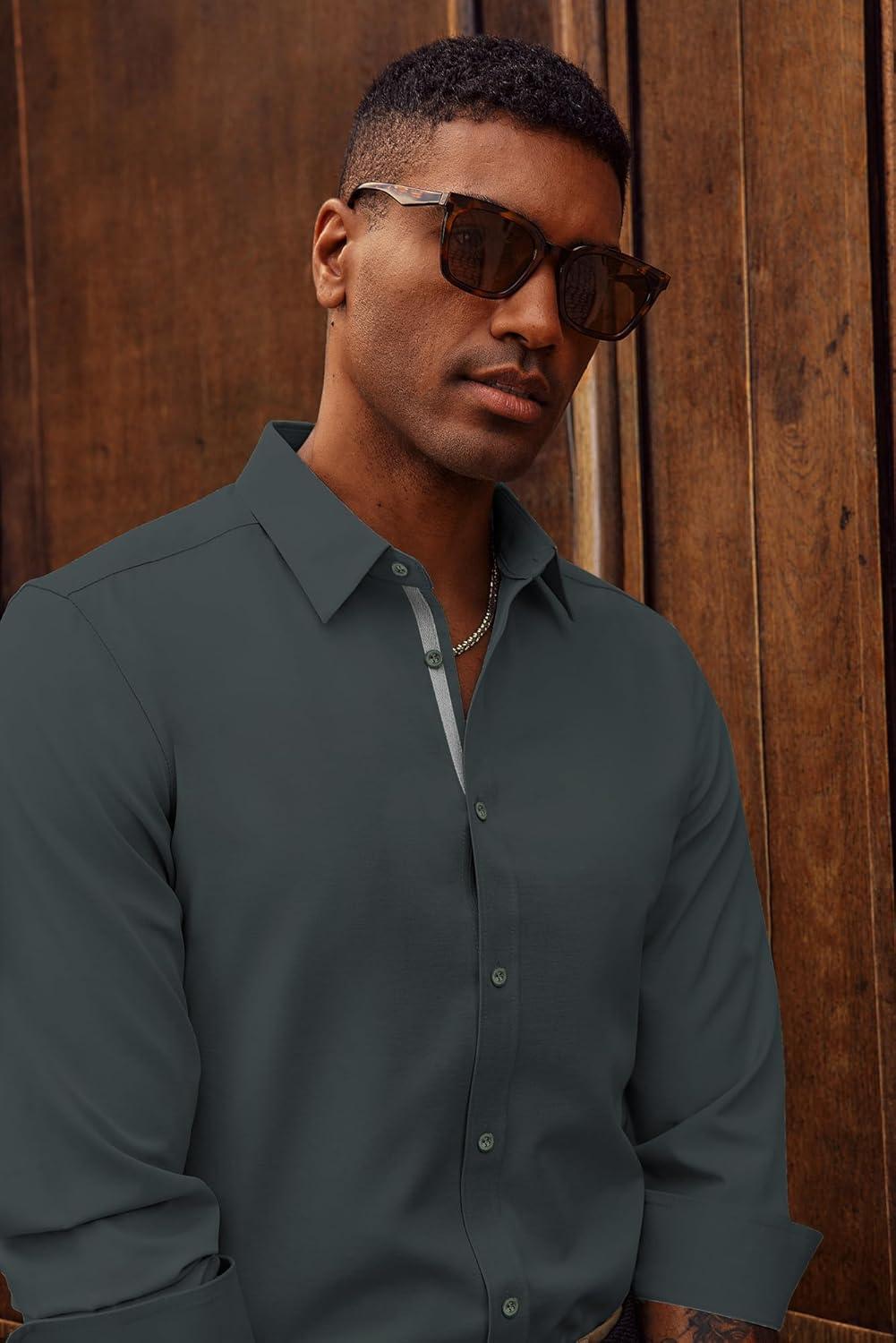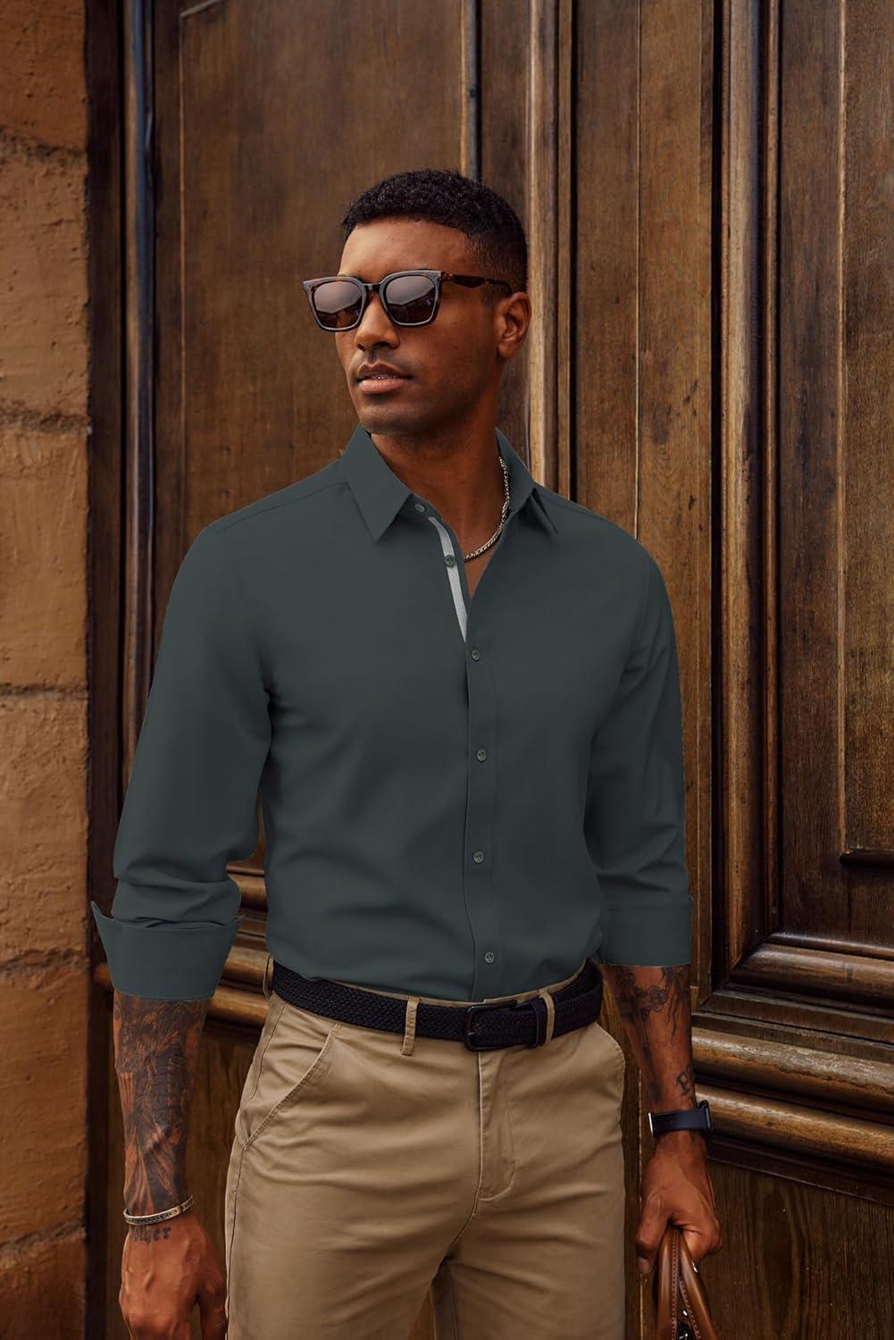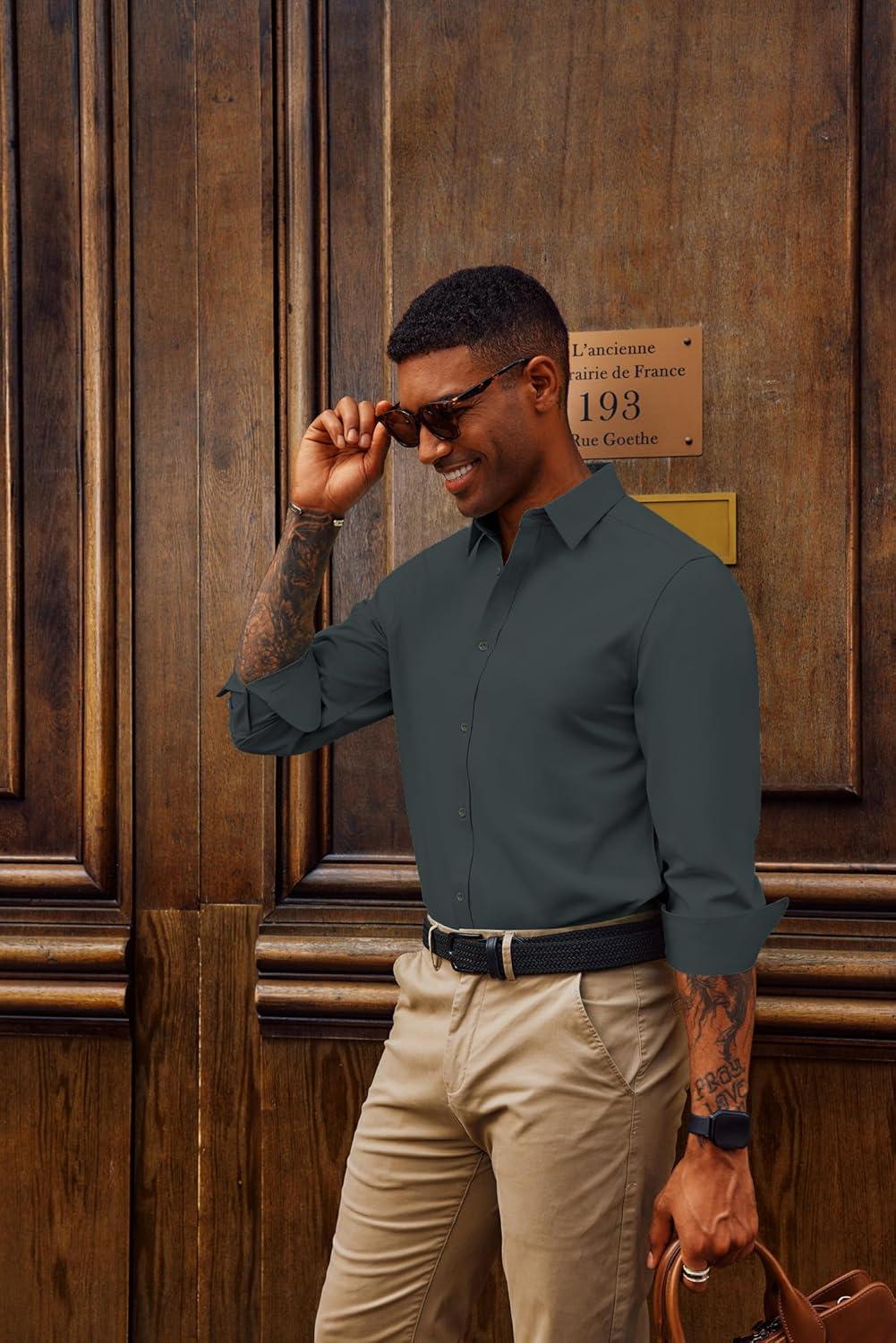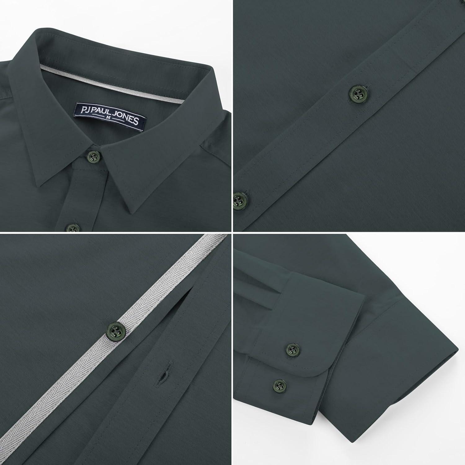 PJ PAUL JONES Mens Dress Shirts Wrinkle Free Stretch Button Down Shirt Casual Long Sleeve Business Shirts(Green Gray)