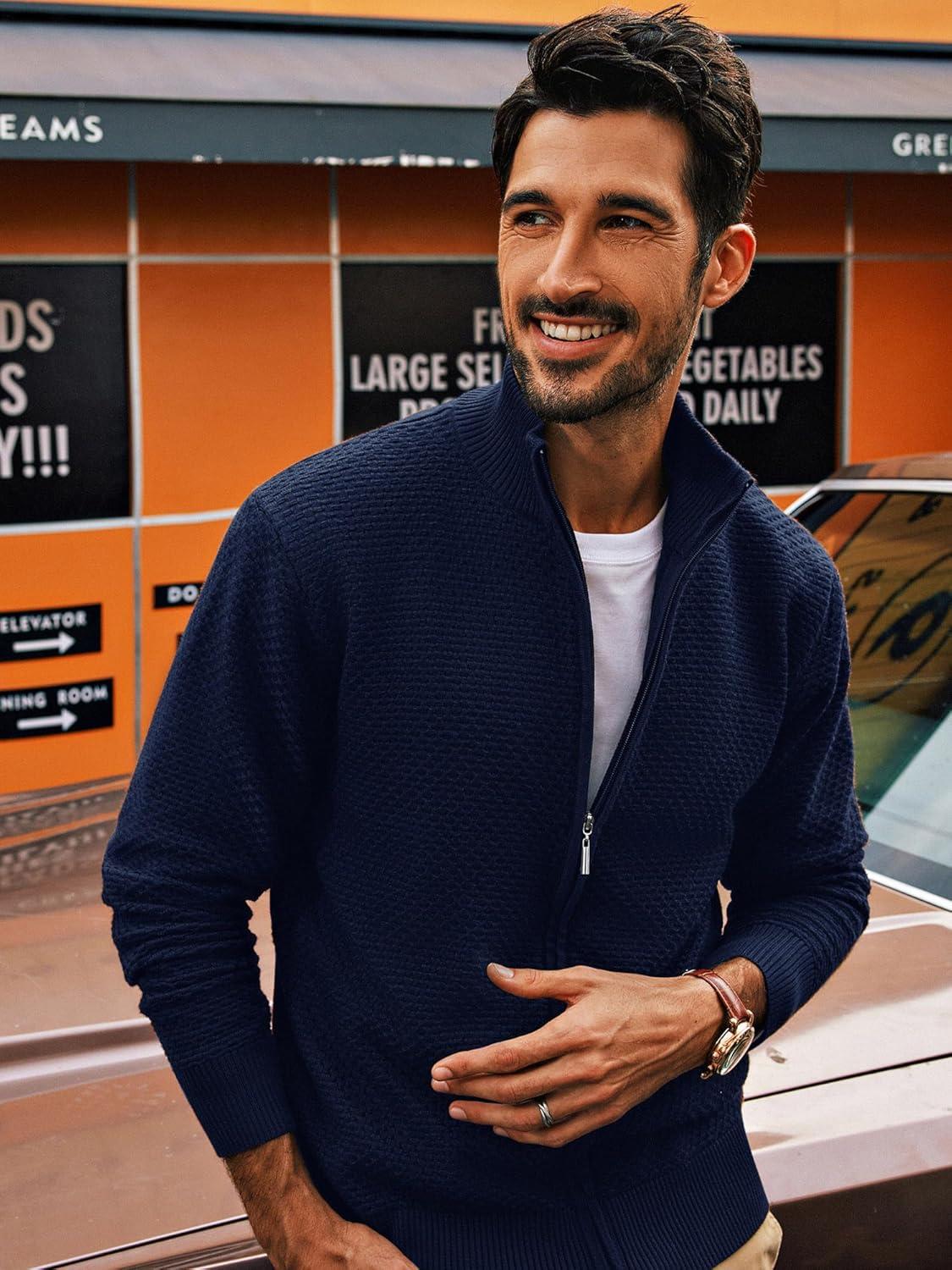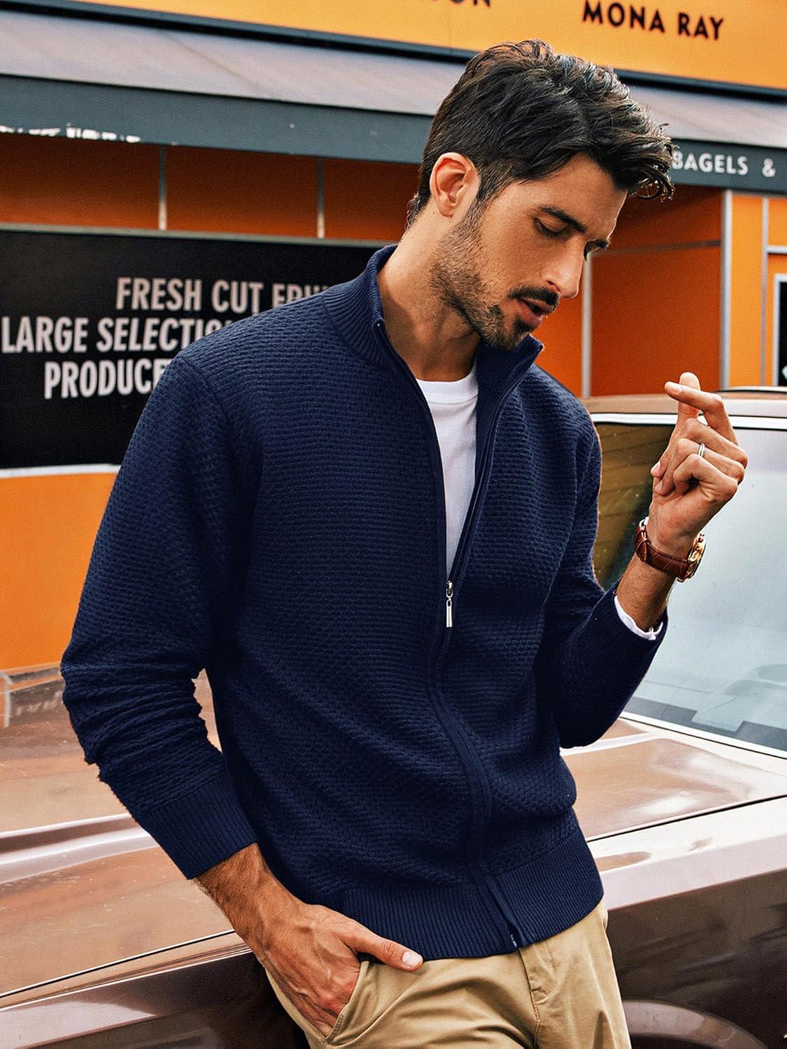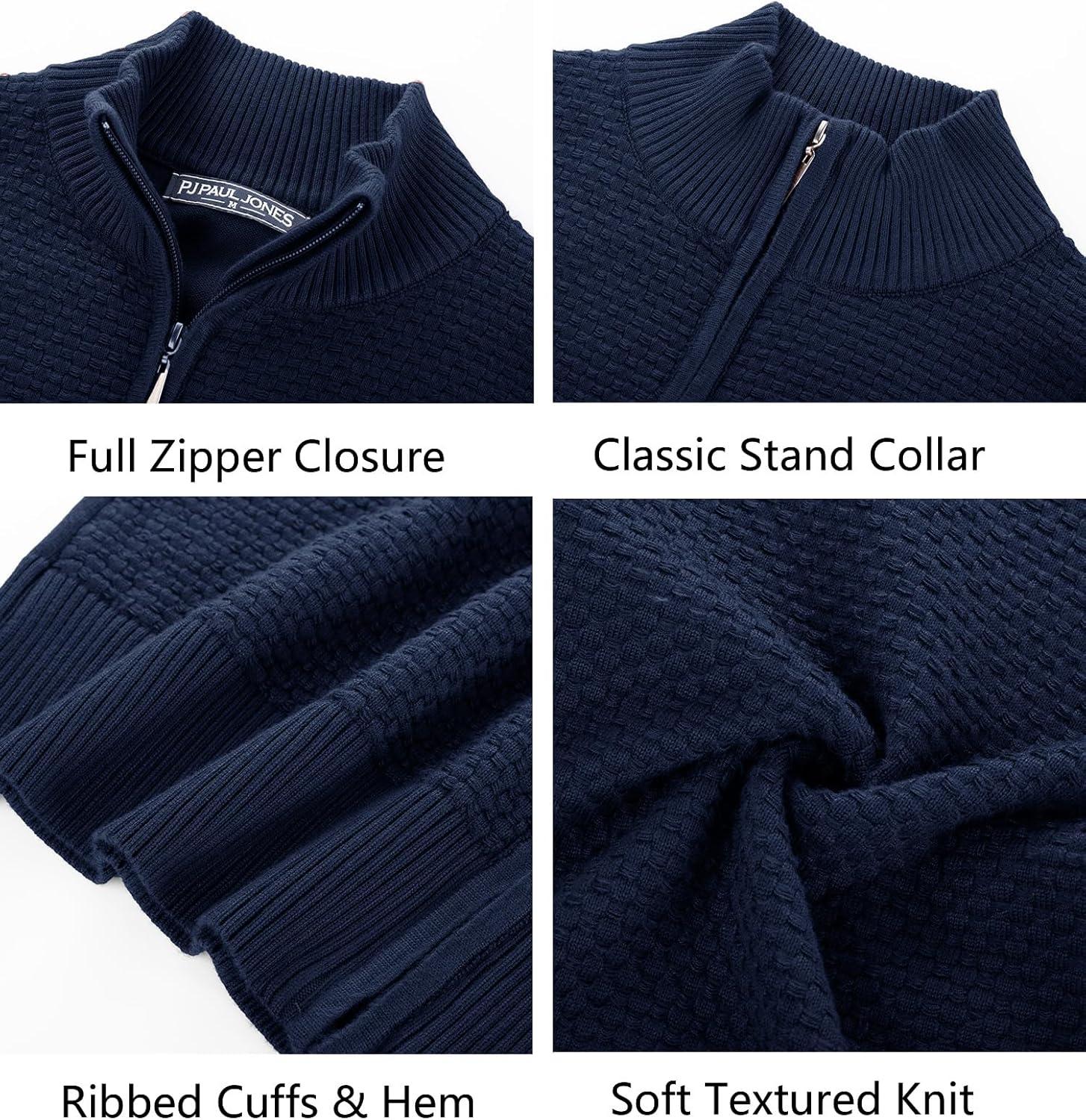 PJ PAUL JONES Men’s Full Zip Cardigan Sweaters Casual Stand Collar Cardigan Slim Fit Knitted Sweater(Navy Blue)