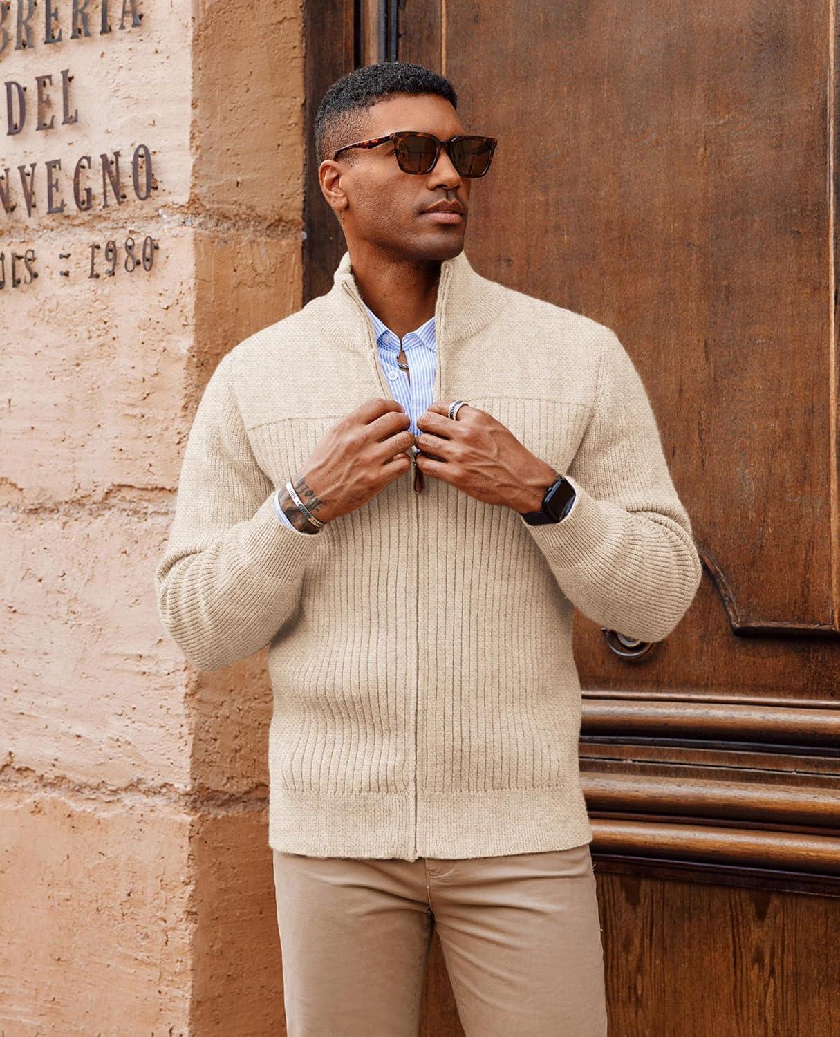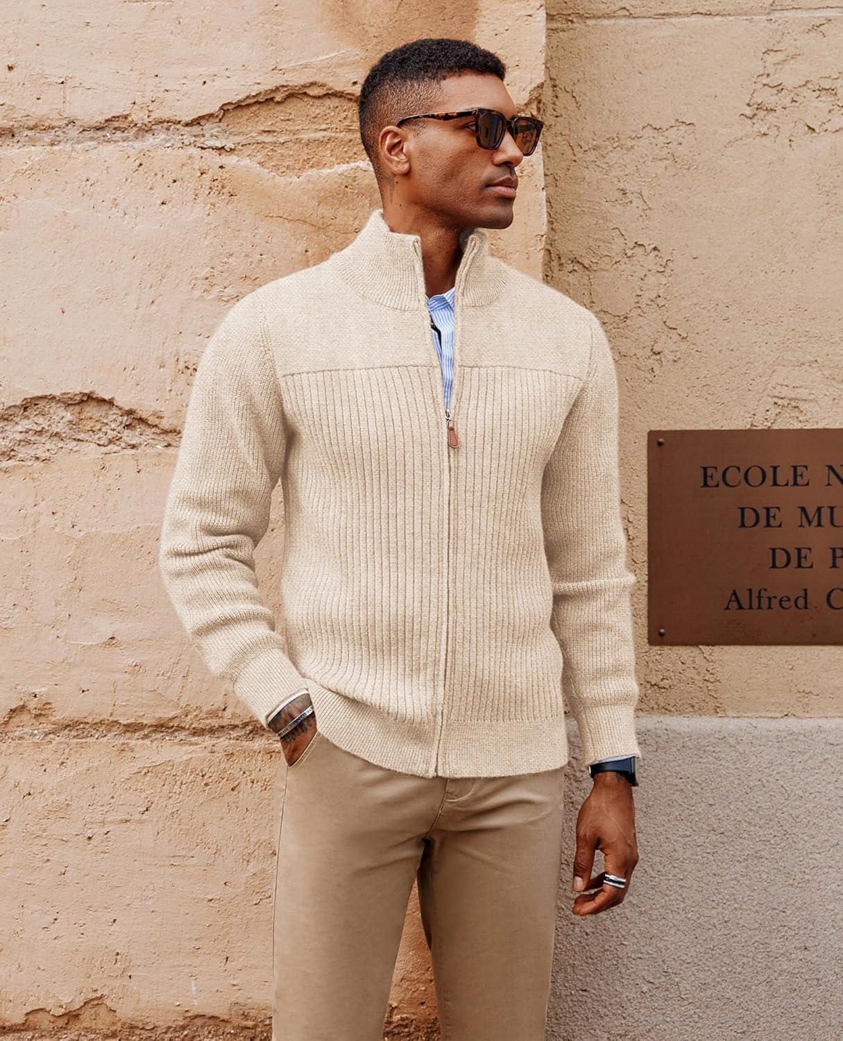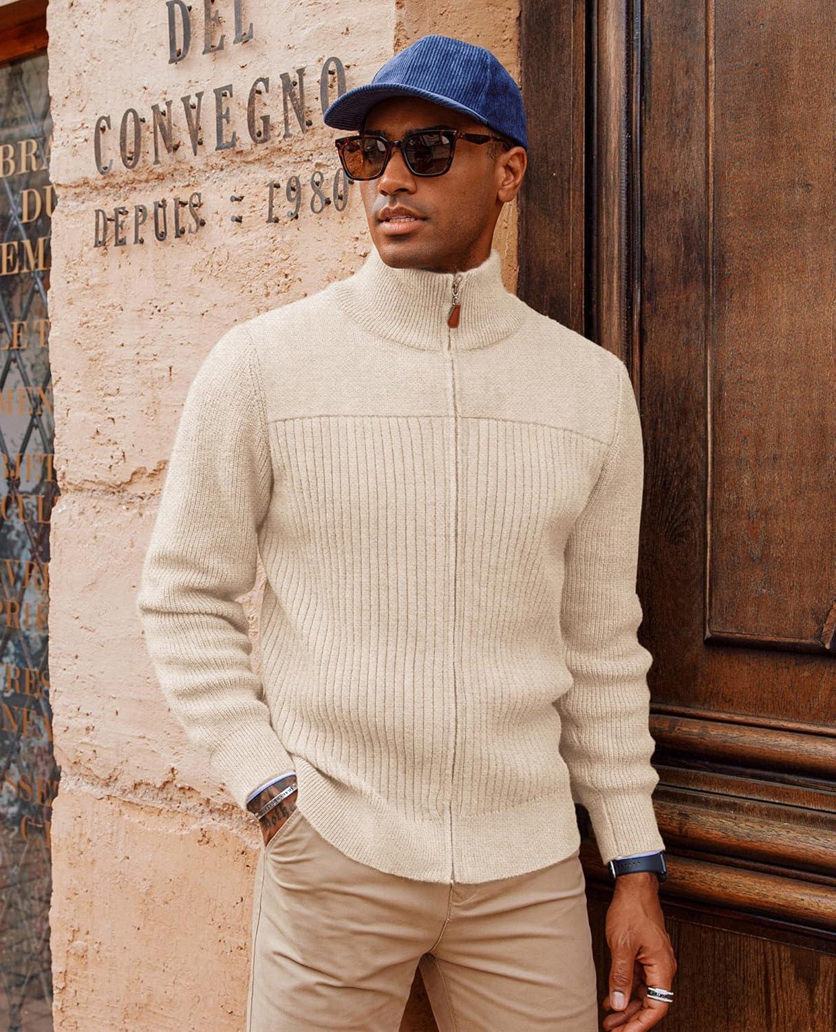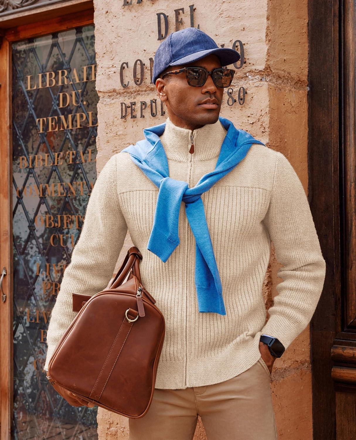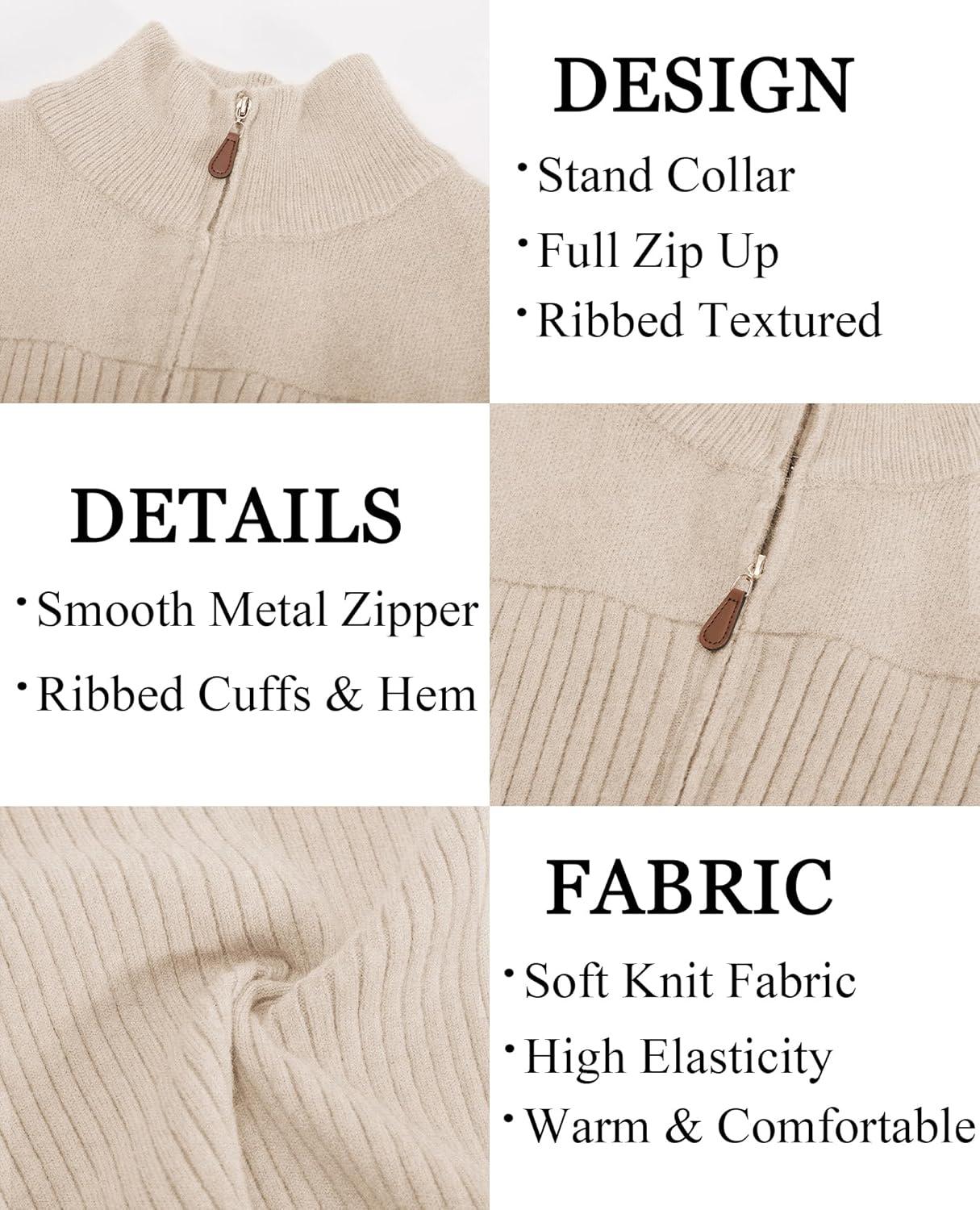PJ PAUL JONES Men’s Full Zipper Cardigan Casual Stand Collar Cardigan Sweater Ribbed Knit Long Sleeve Sweater(Apricot)