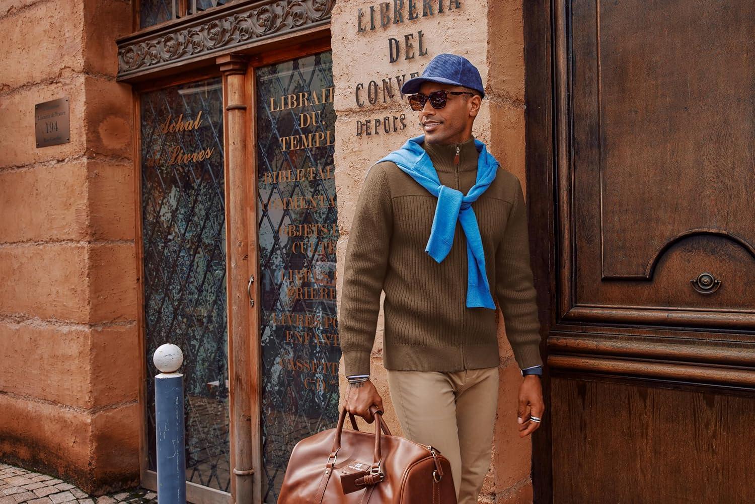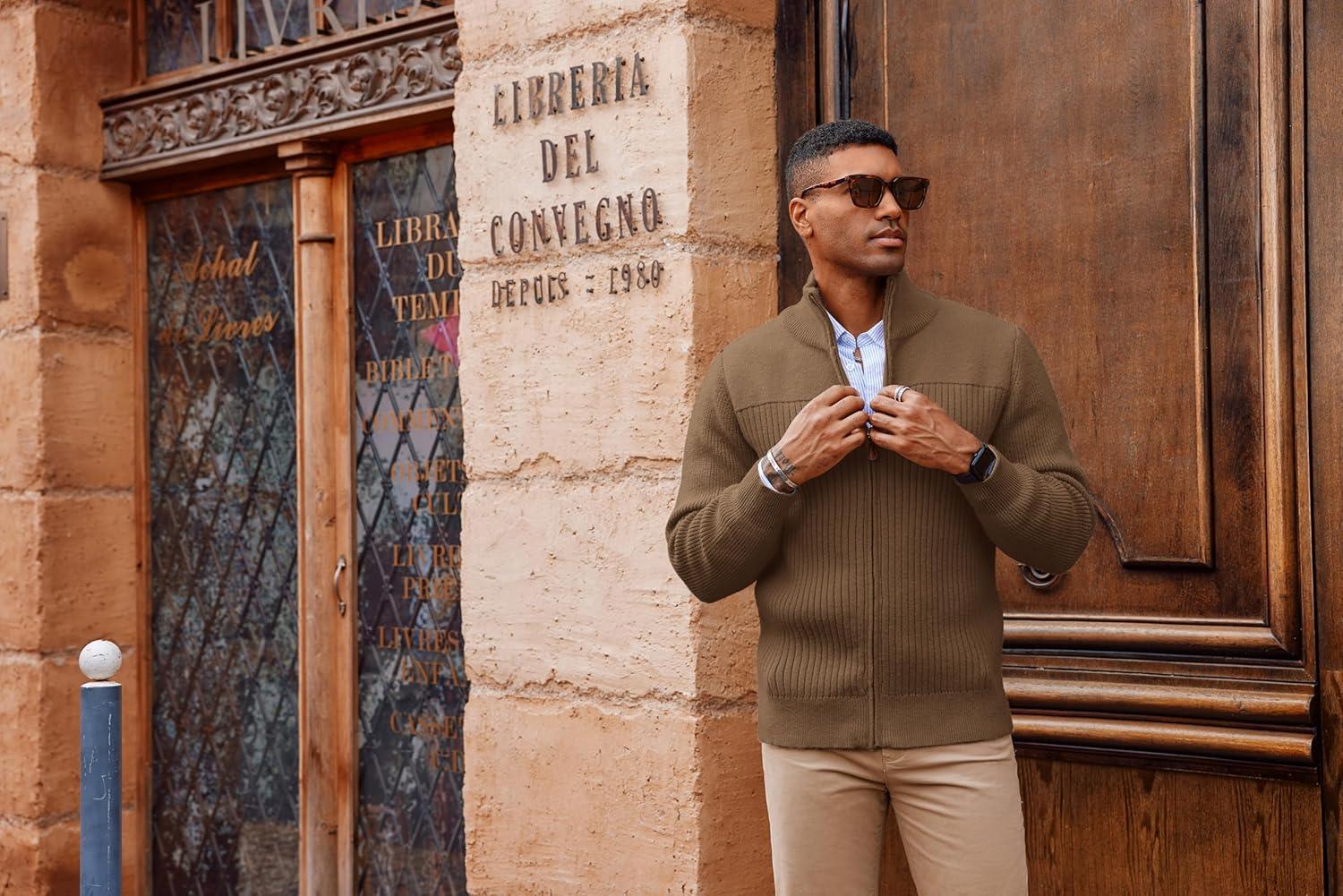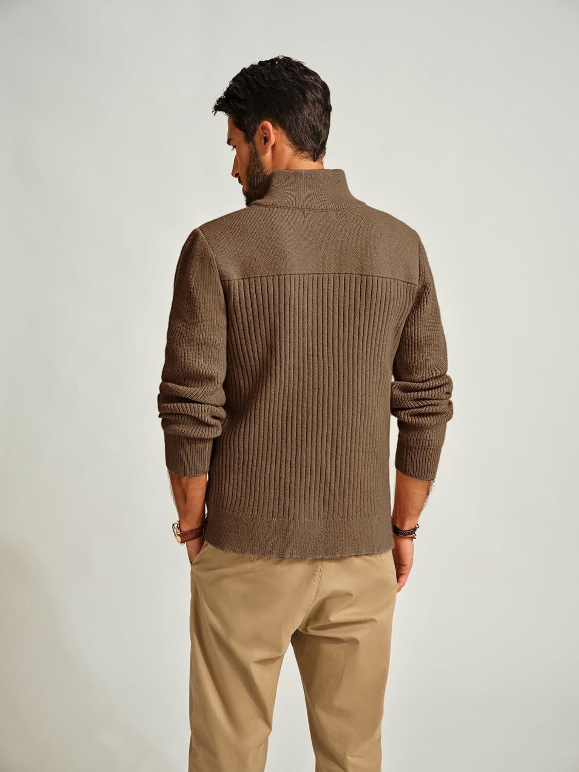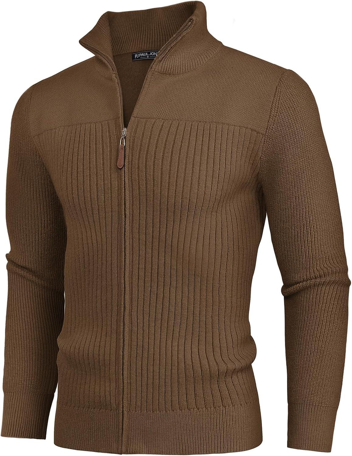 PJ PAUL JONES Men’s Full Zipper Cardigan Casual Stand Collar Cardigan Sweater Ribbed Knit Long Sleeve Sweater(Coffee)