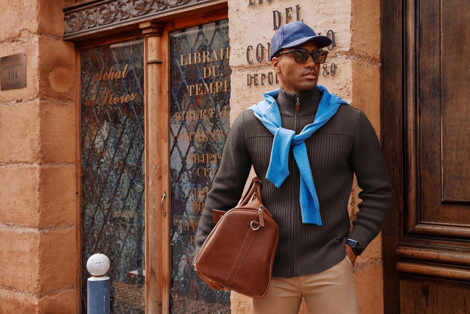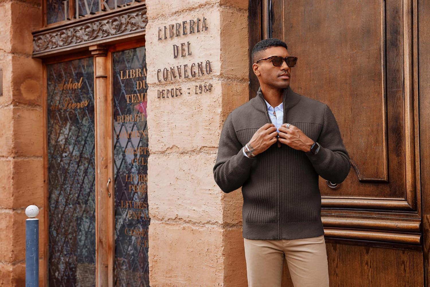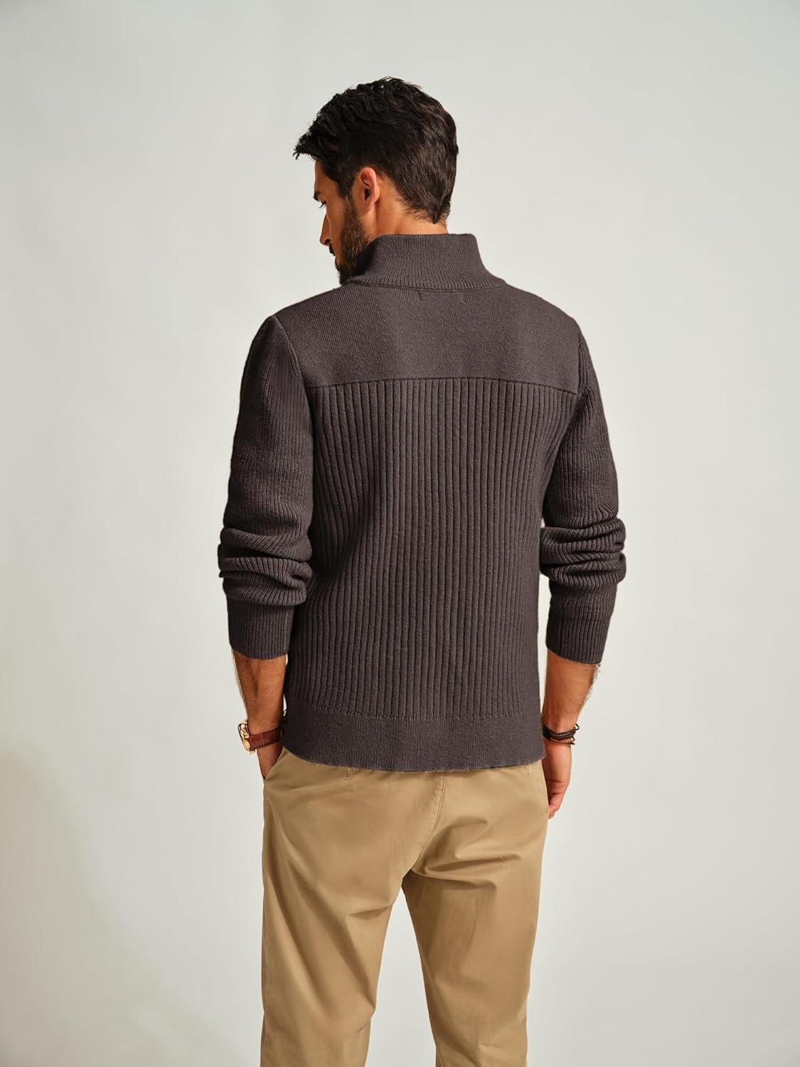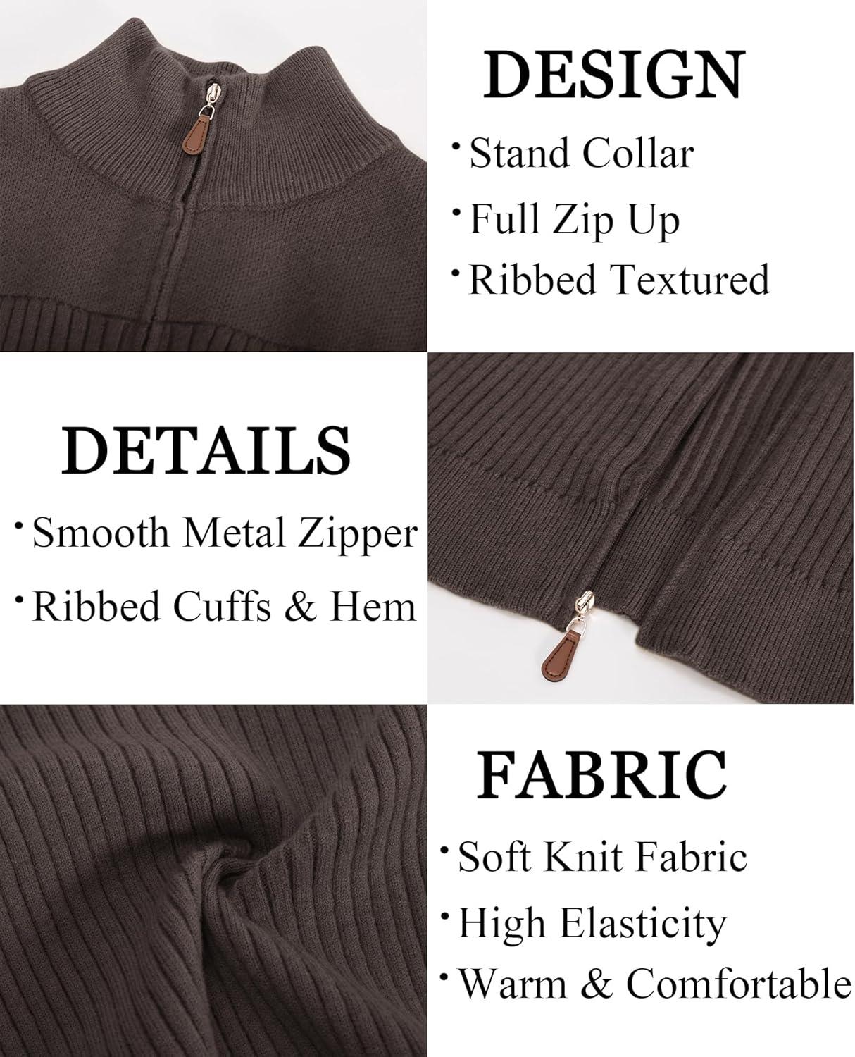 PJ PAUL JONES Men’s Full Zipper Cardigan Casual Stand Collar Cardigan Sweater Ribbed Knit Long Sleeve Sweater(Dark Coffee)