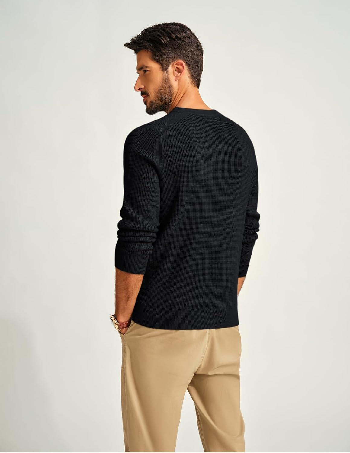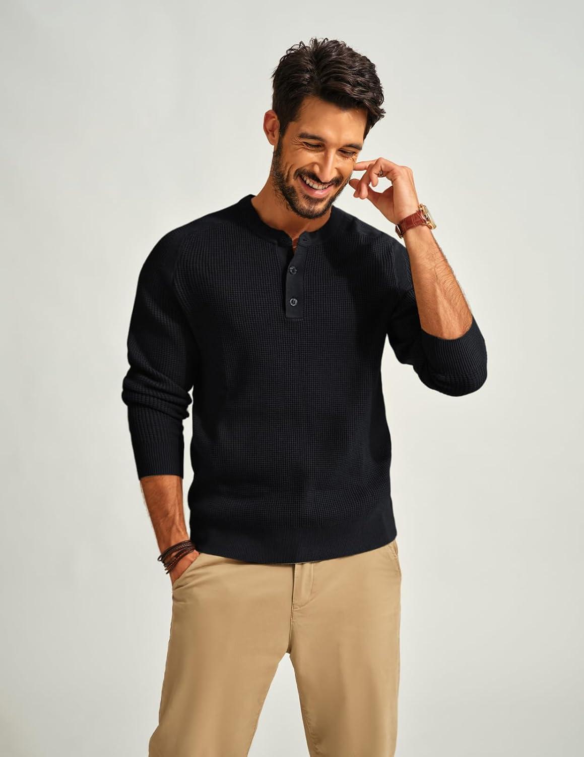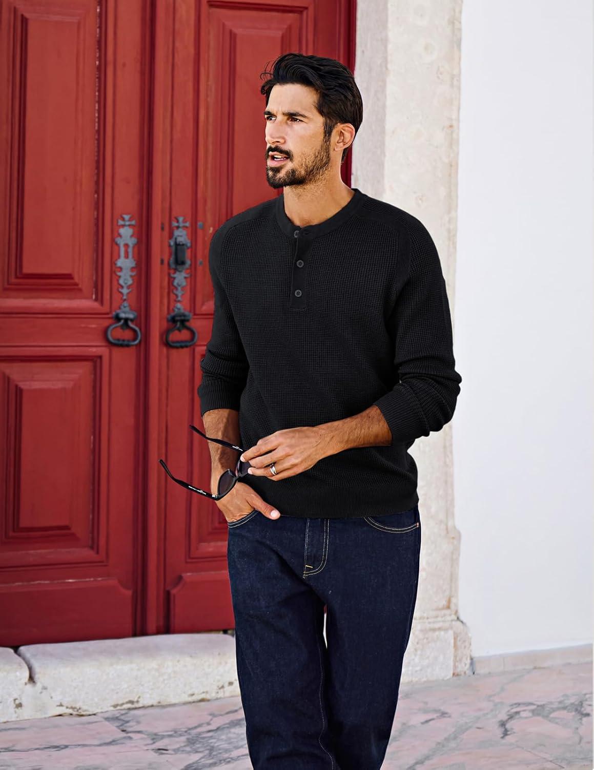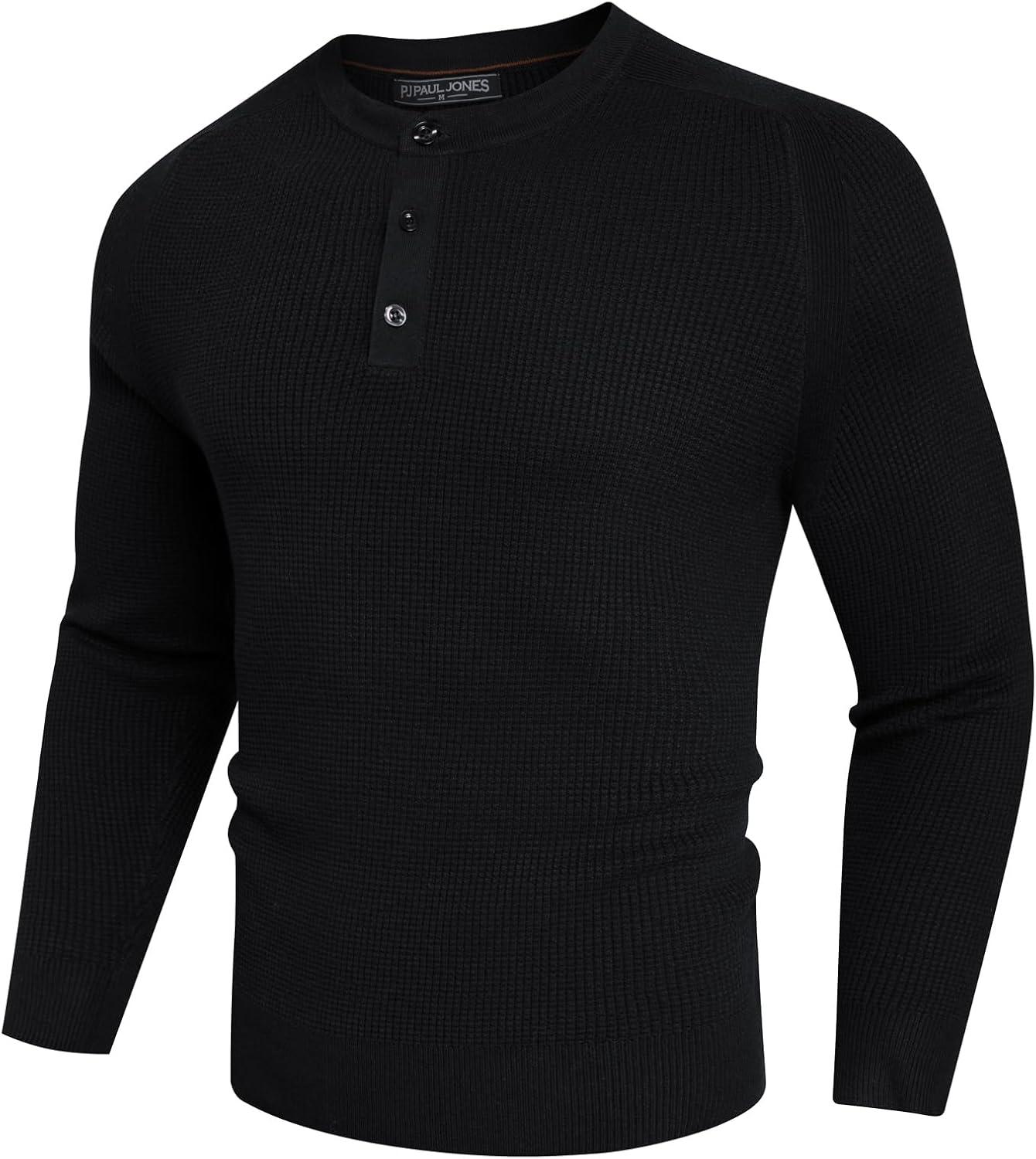 PJ PAUL JONES Men’s Henley Long Sleeve Sweaters Solid Color Soft Warm Pullover Sweaters(Black)