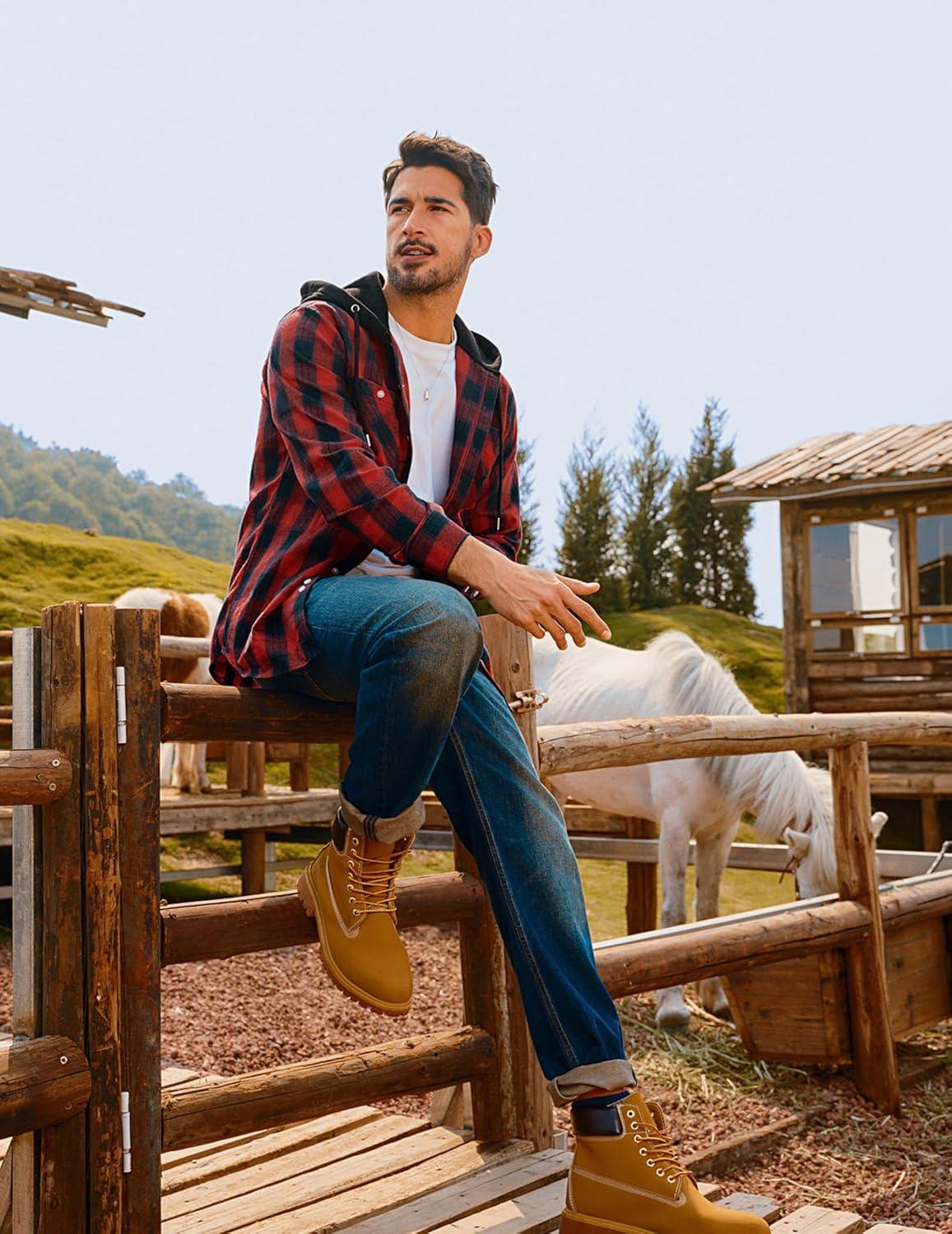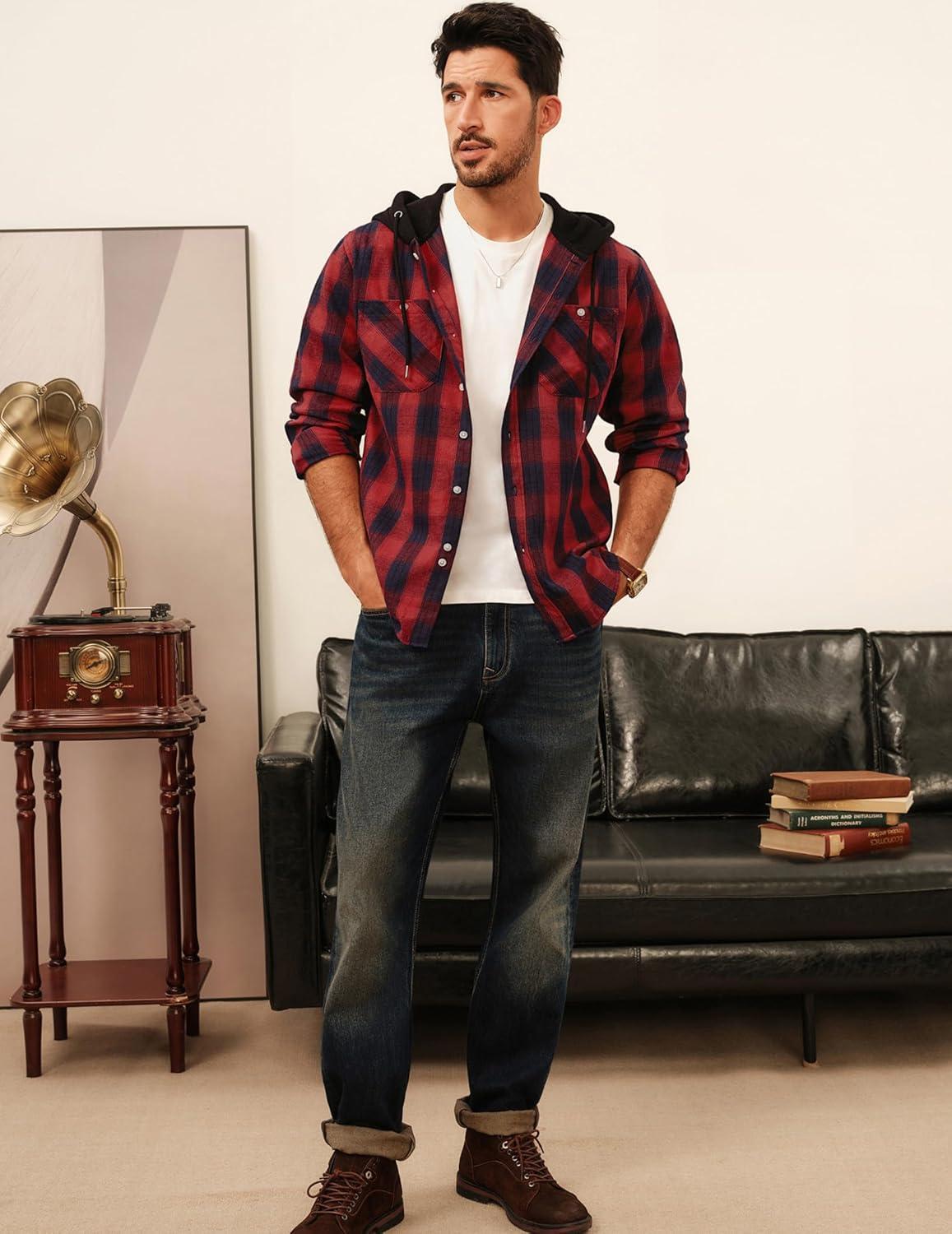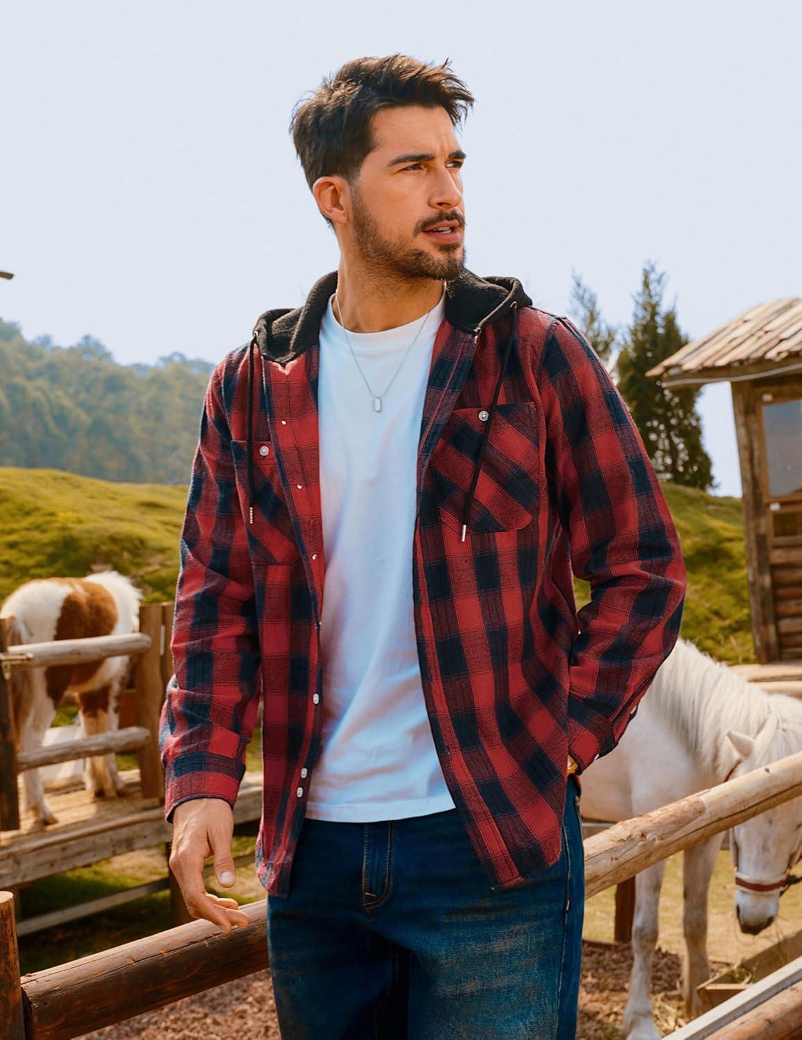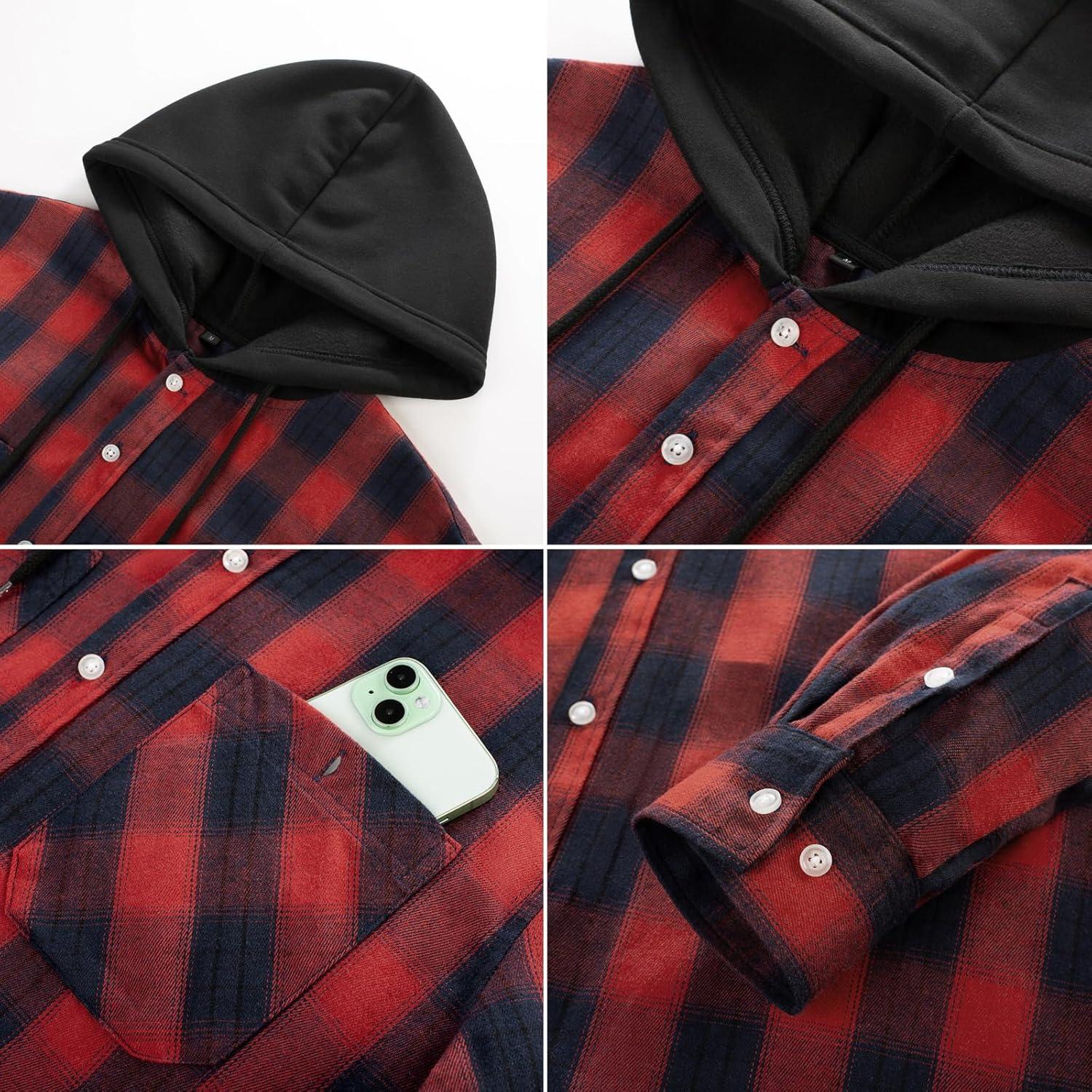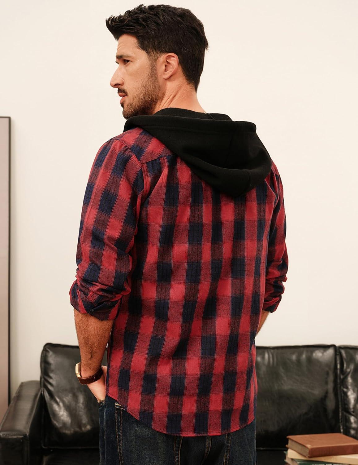 PJ PAUL JONES Mens Hooded Flannel Shirt Long Sleeve Plaid Shirts Hoodie Jackets(Hooded Red Black)