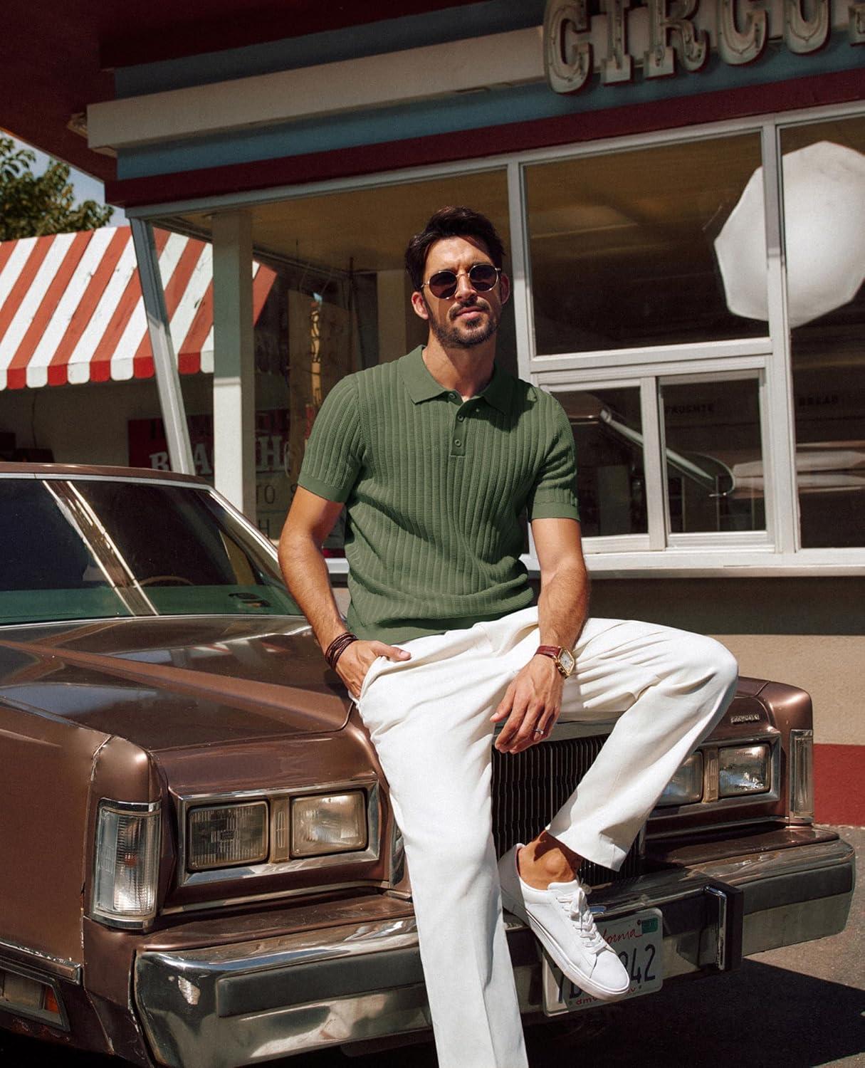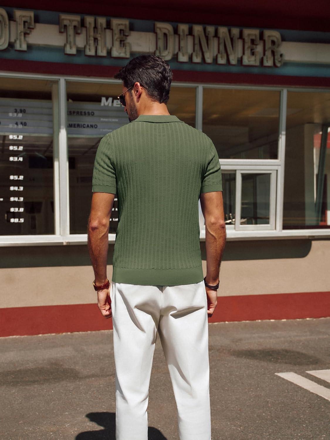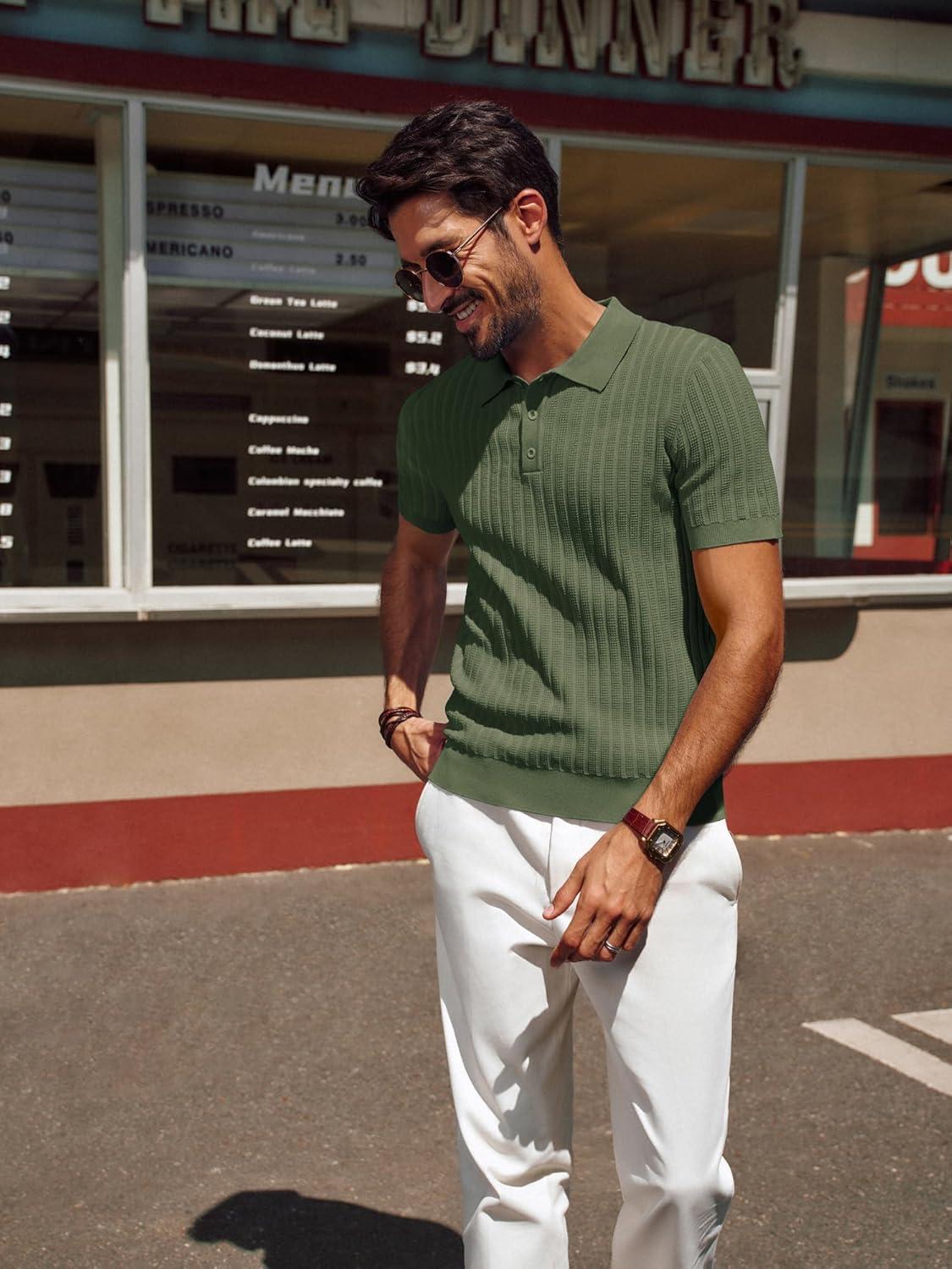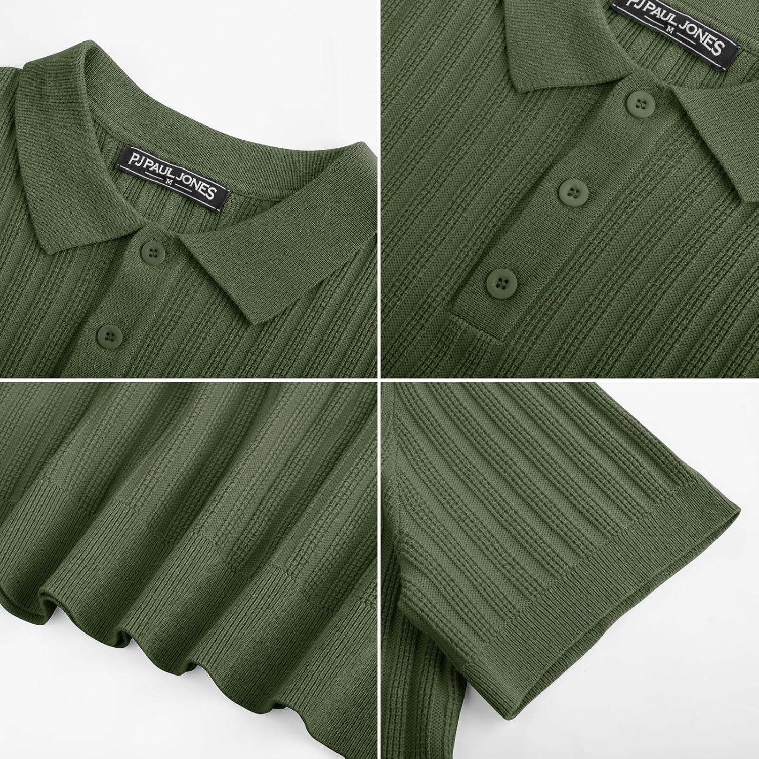 PJ PAUL JONES Mens Knit Polo Shirt Short Sleeve Textured Polo Shirts Casual Summer Collared Polo T Shirt(Army Green)