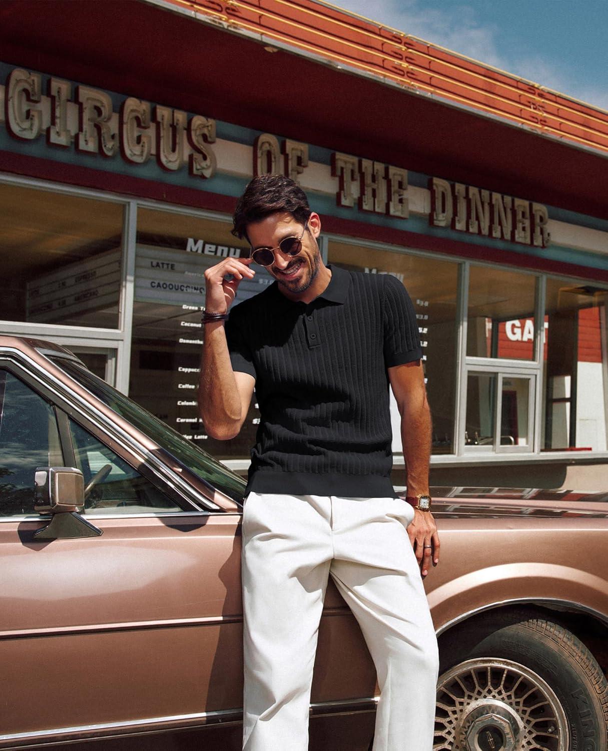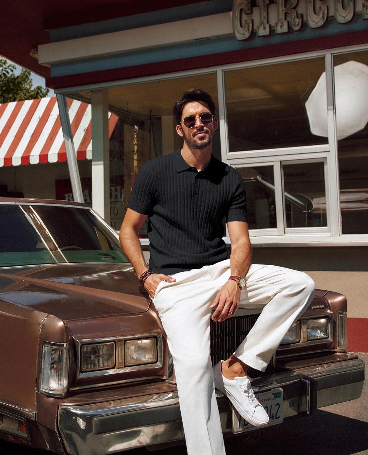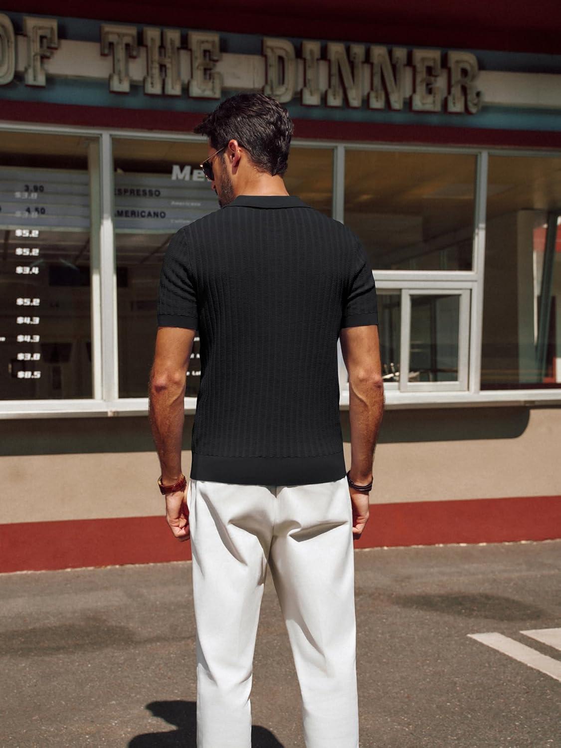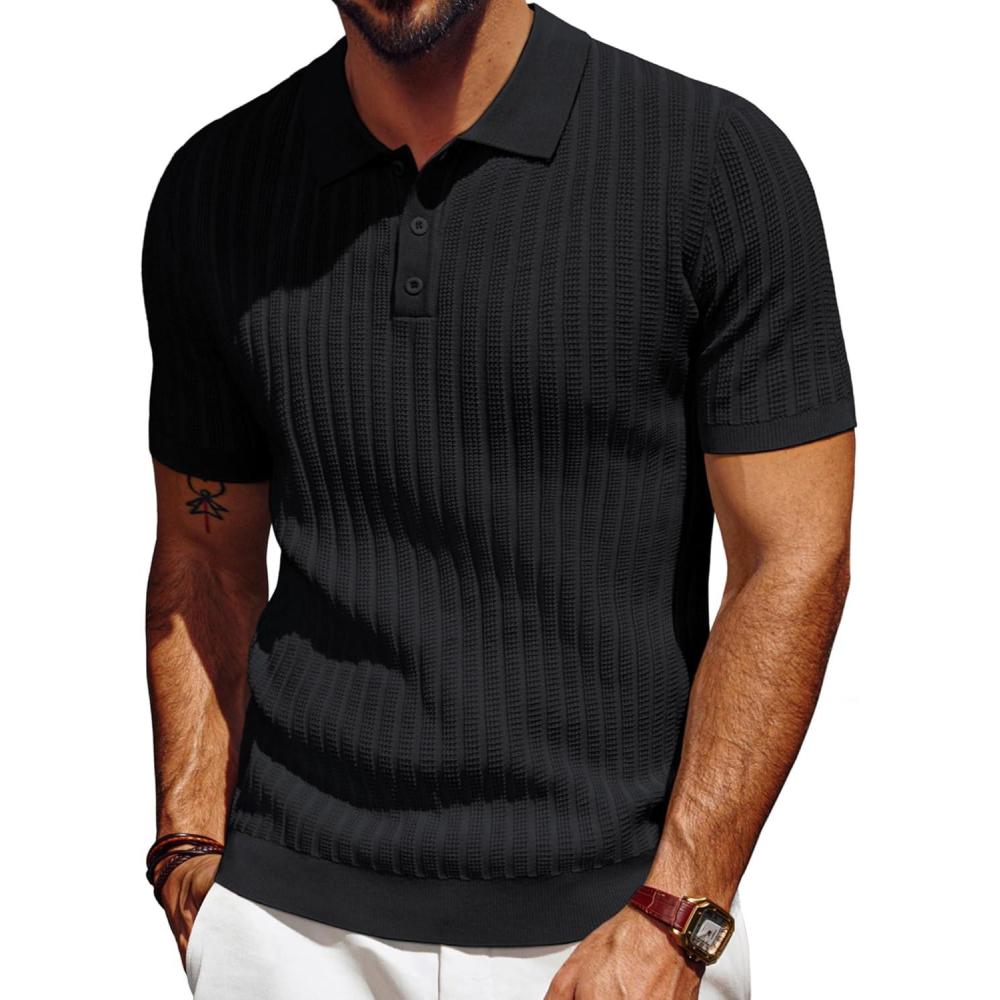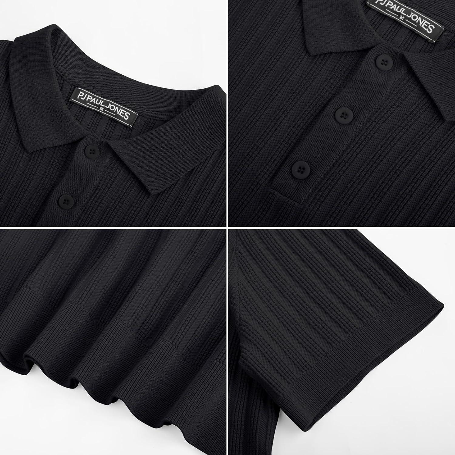 PJ PAUL JONES Mens Knit Polo Shirt Short Sleeve Textured Polo Shirts Casual Summer Collared Polo T Shirt(Black)