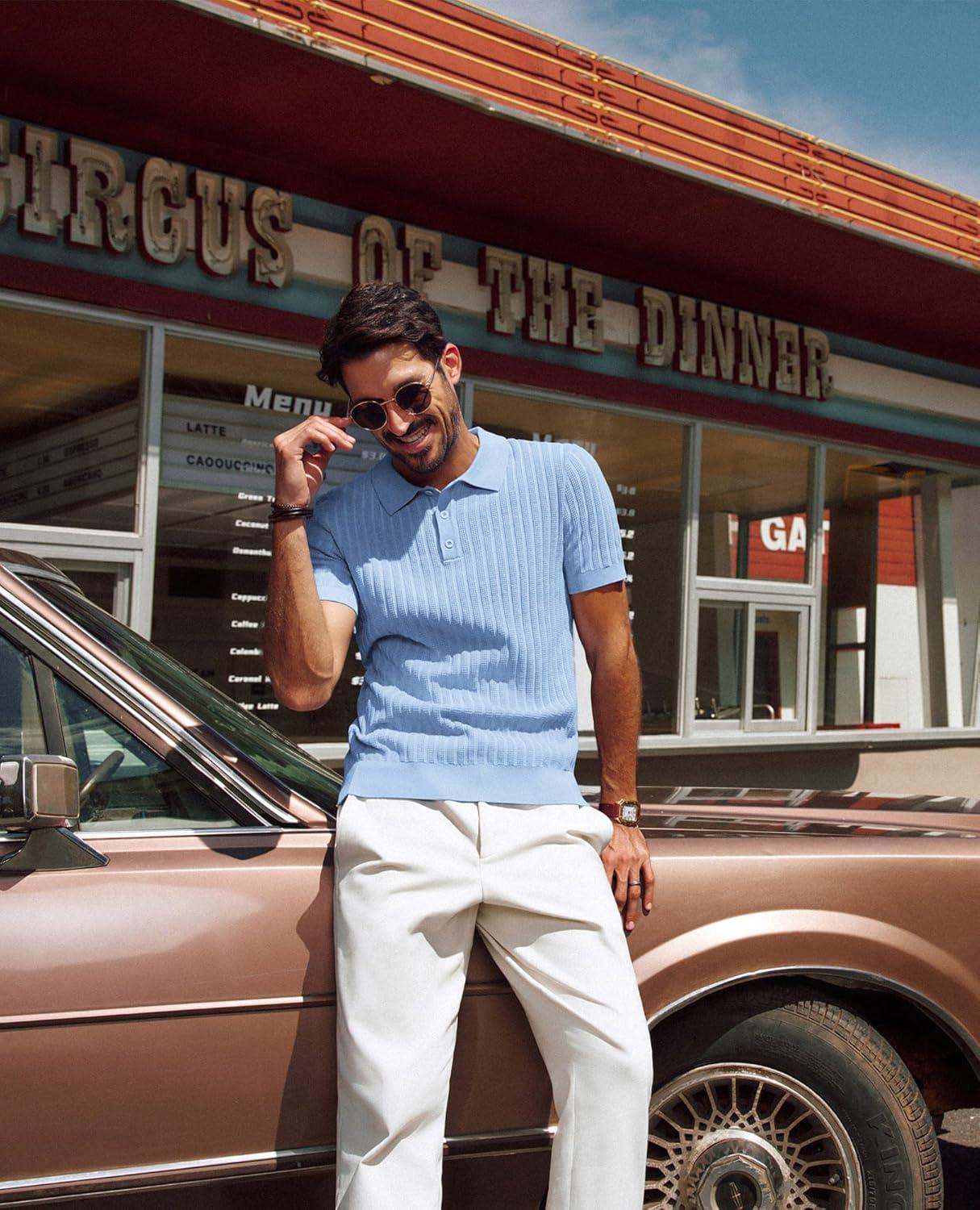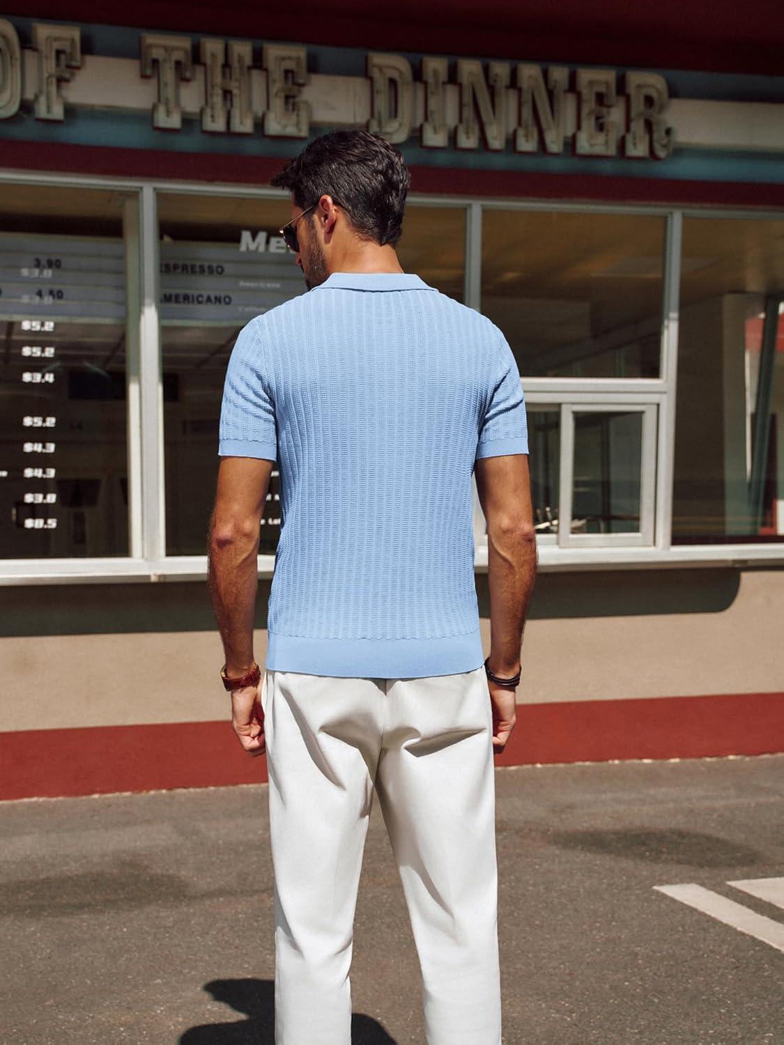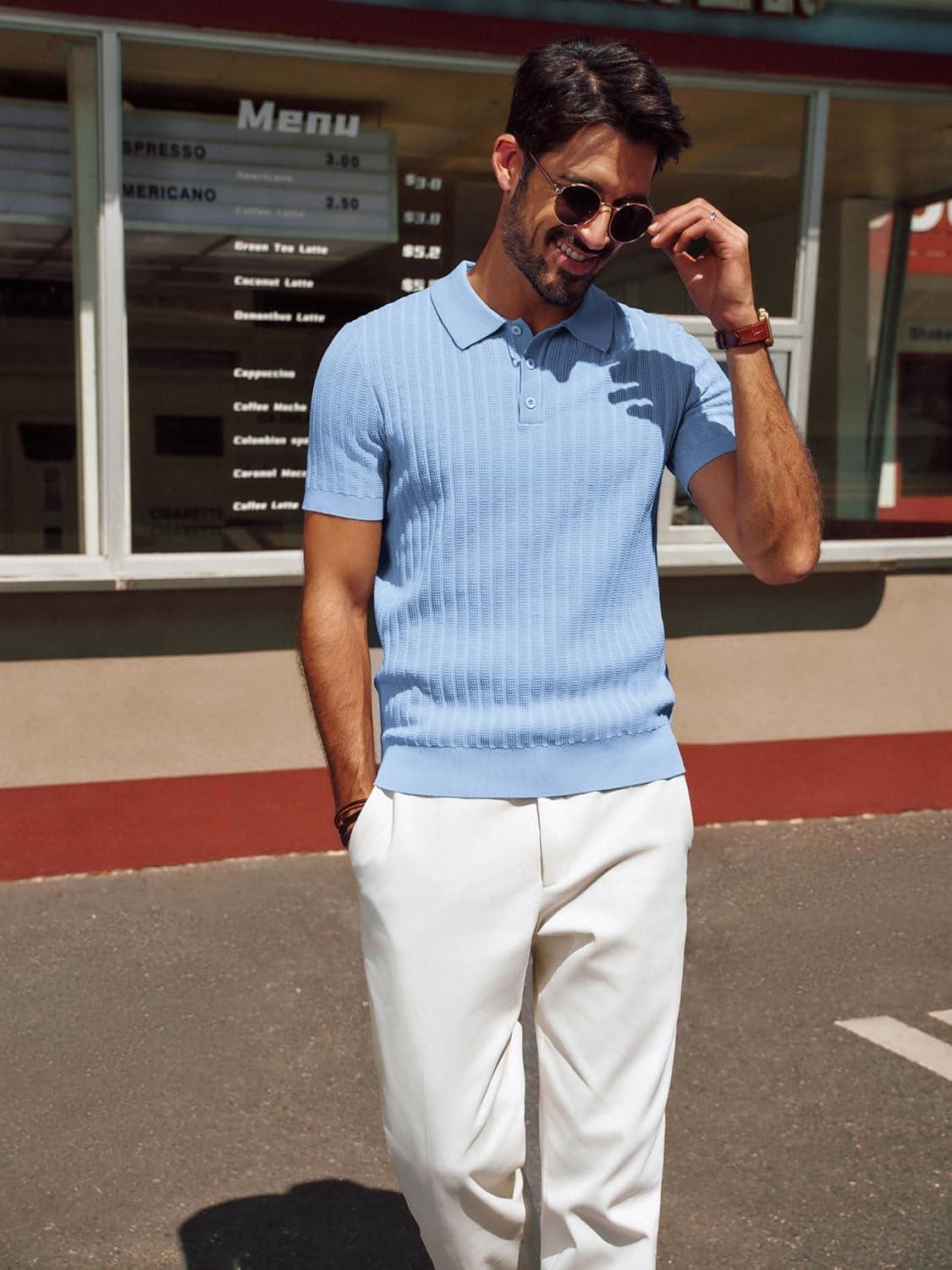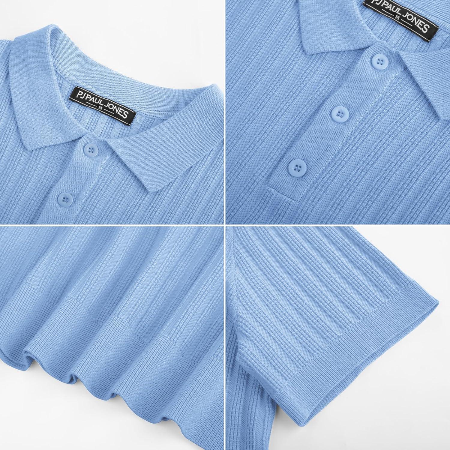 PJ PAUL JONES Mens Knit Polo Shirt Short Sleeve Textured Polo Shirts Casual Summer Collared Polo T Shirt(Light Blue)
