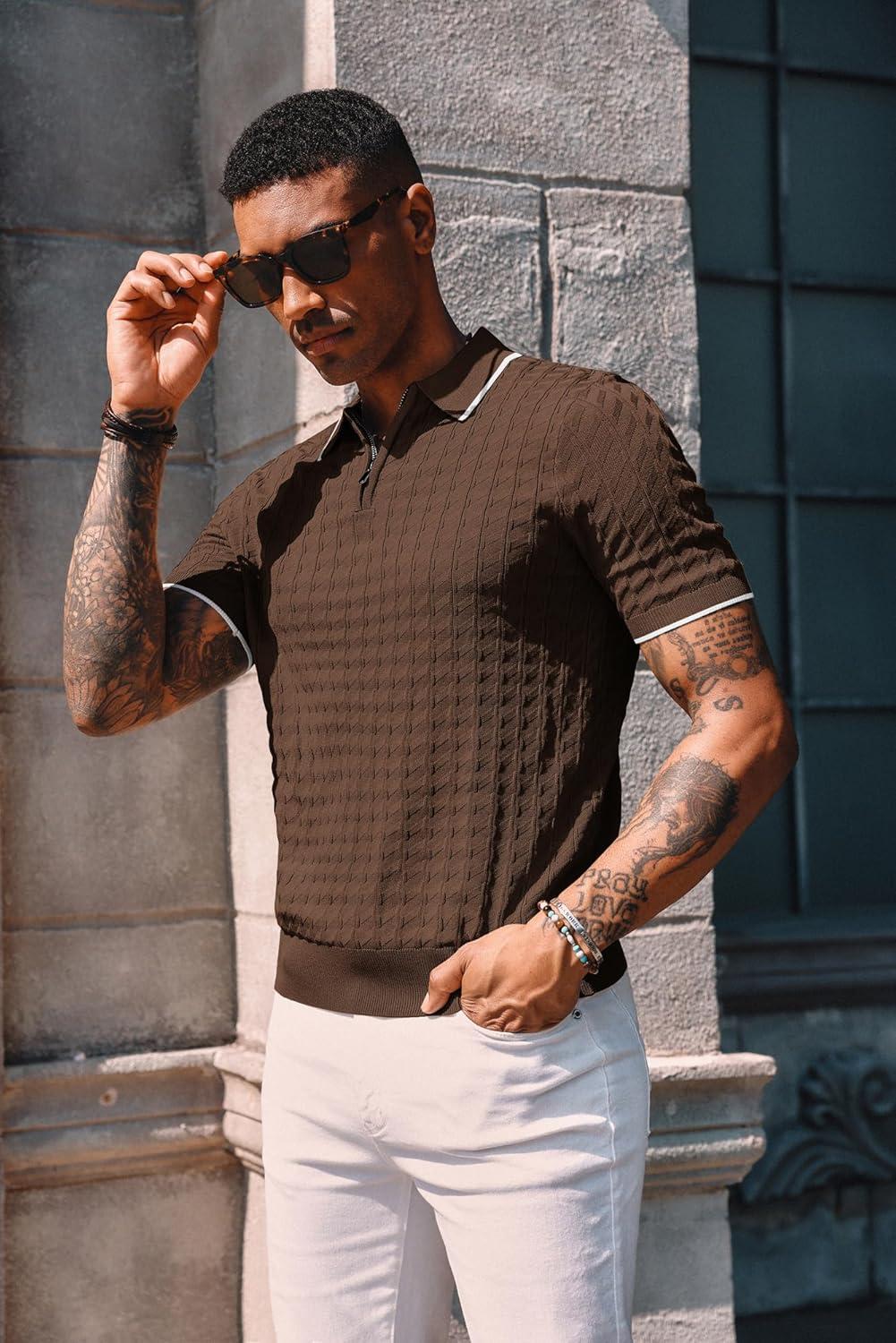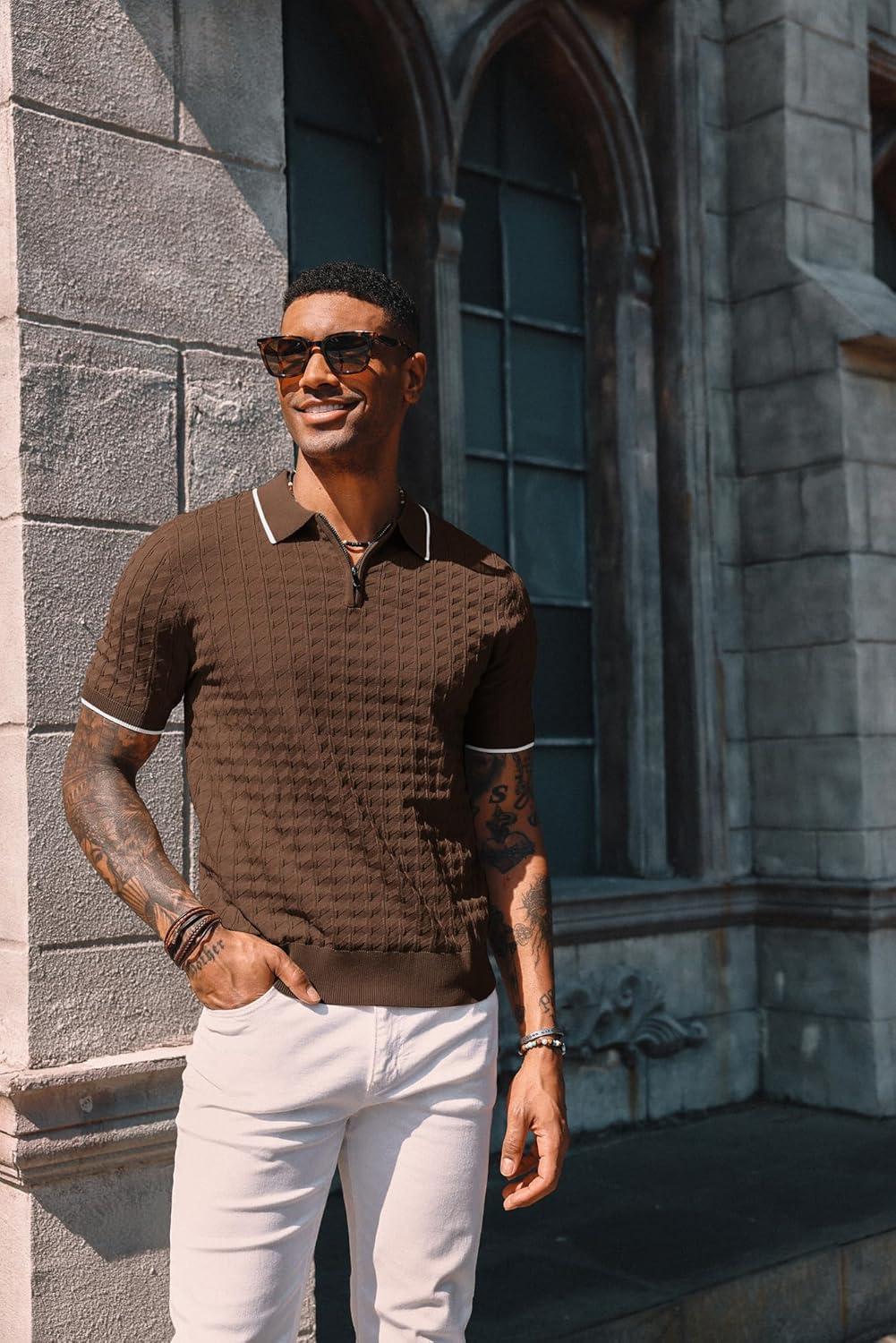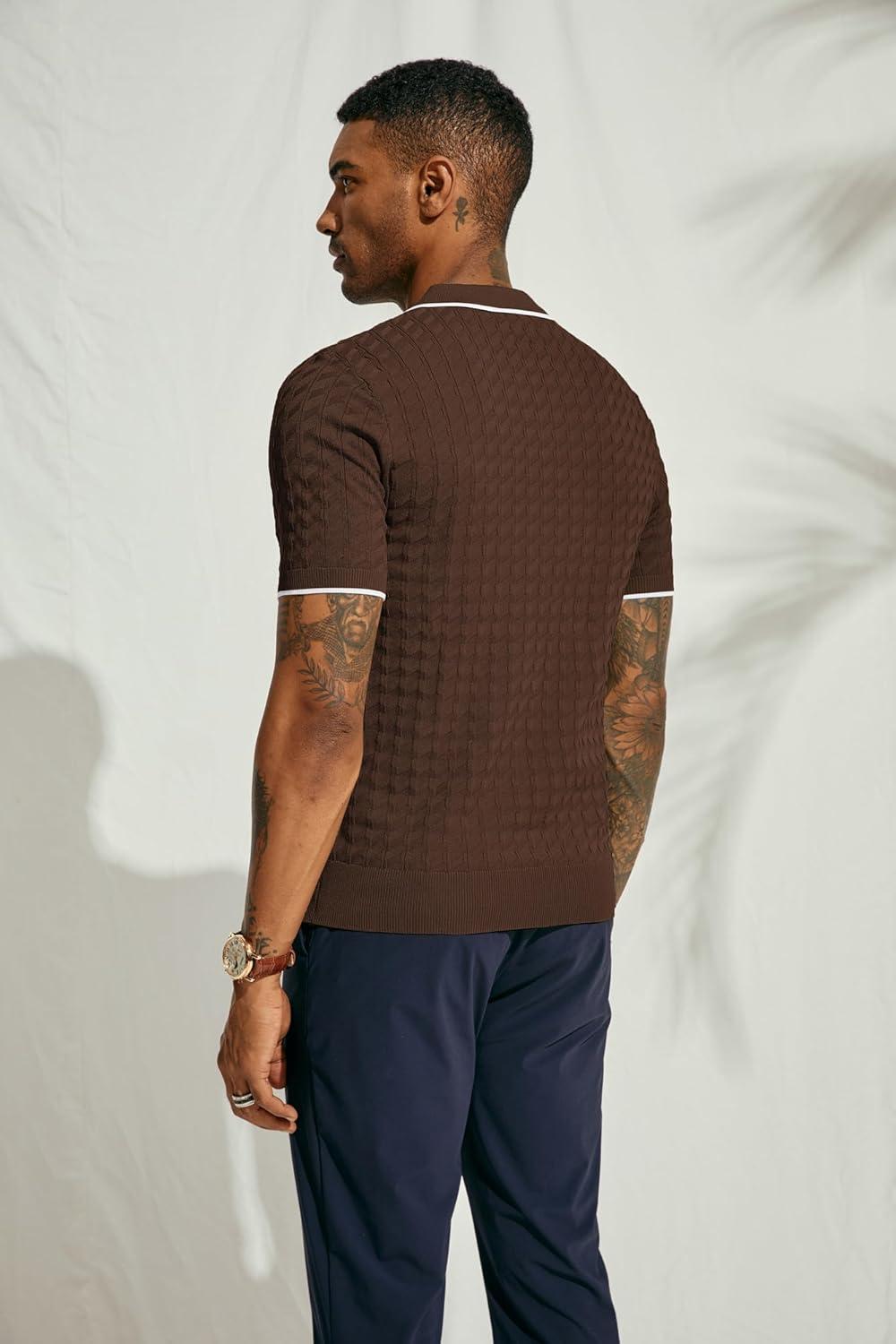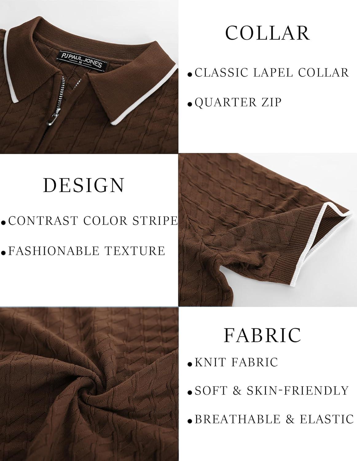 PJ PAUL JONES Men’s Knit Polo Shirts Short Sleeve Quarter Zip Polo Shirt(Coffee)