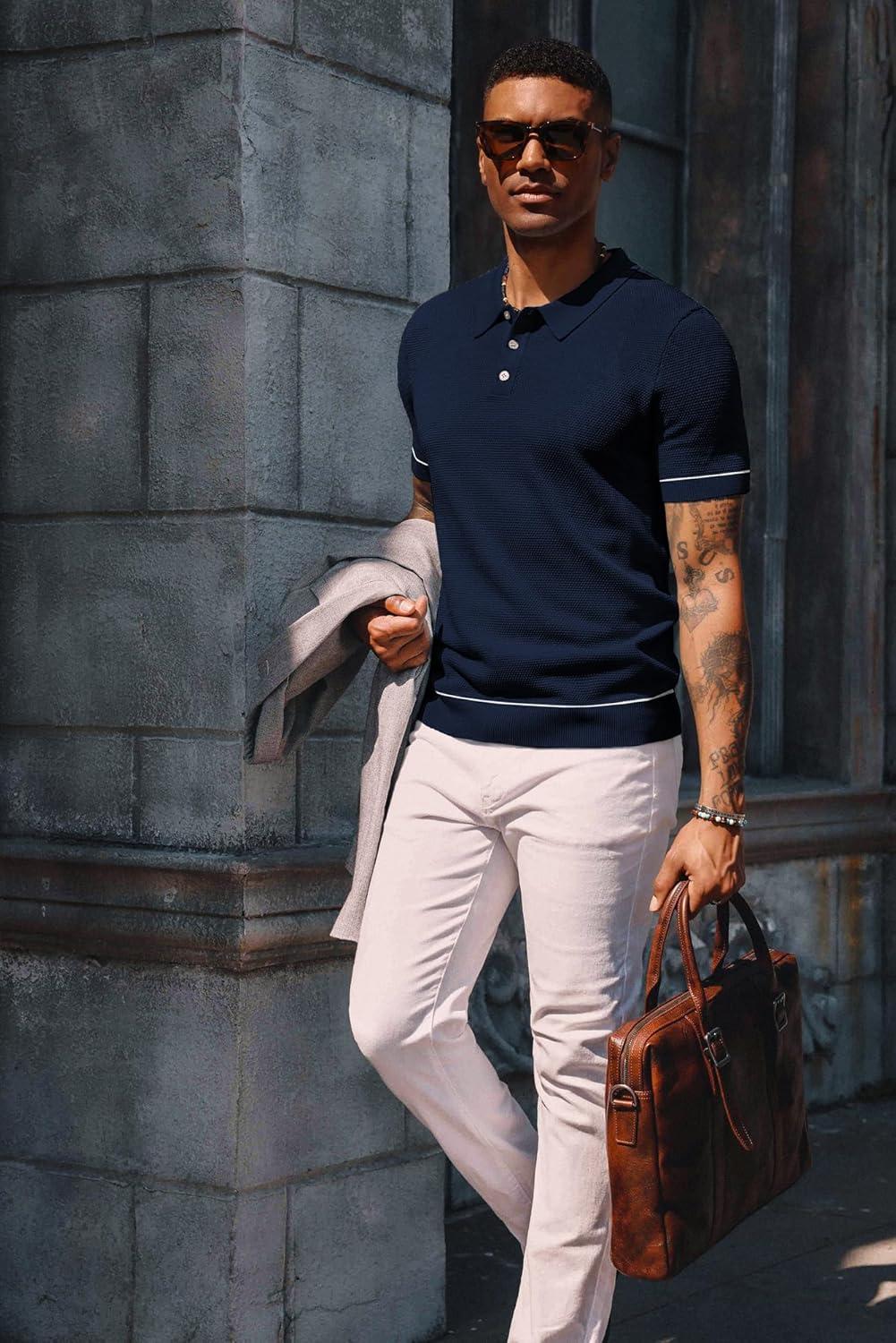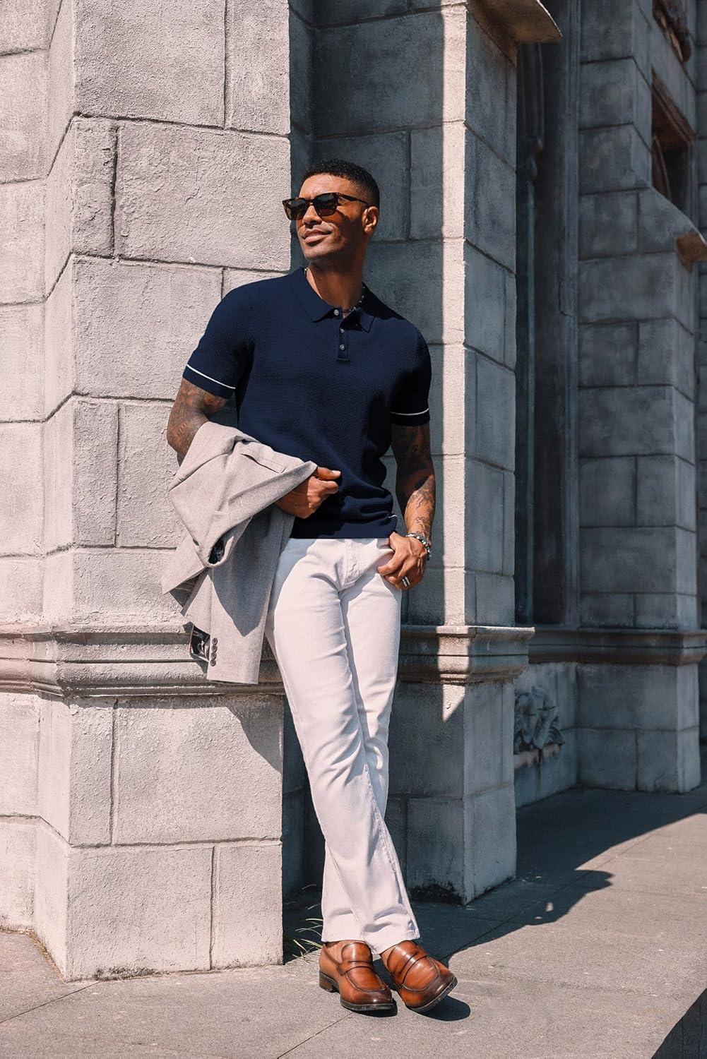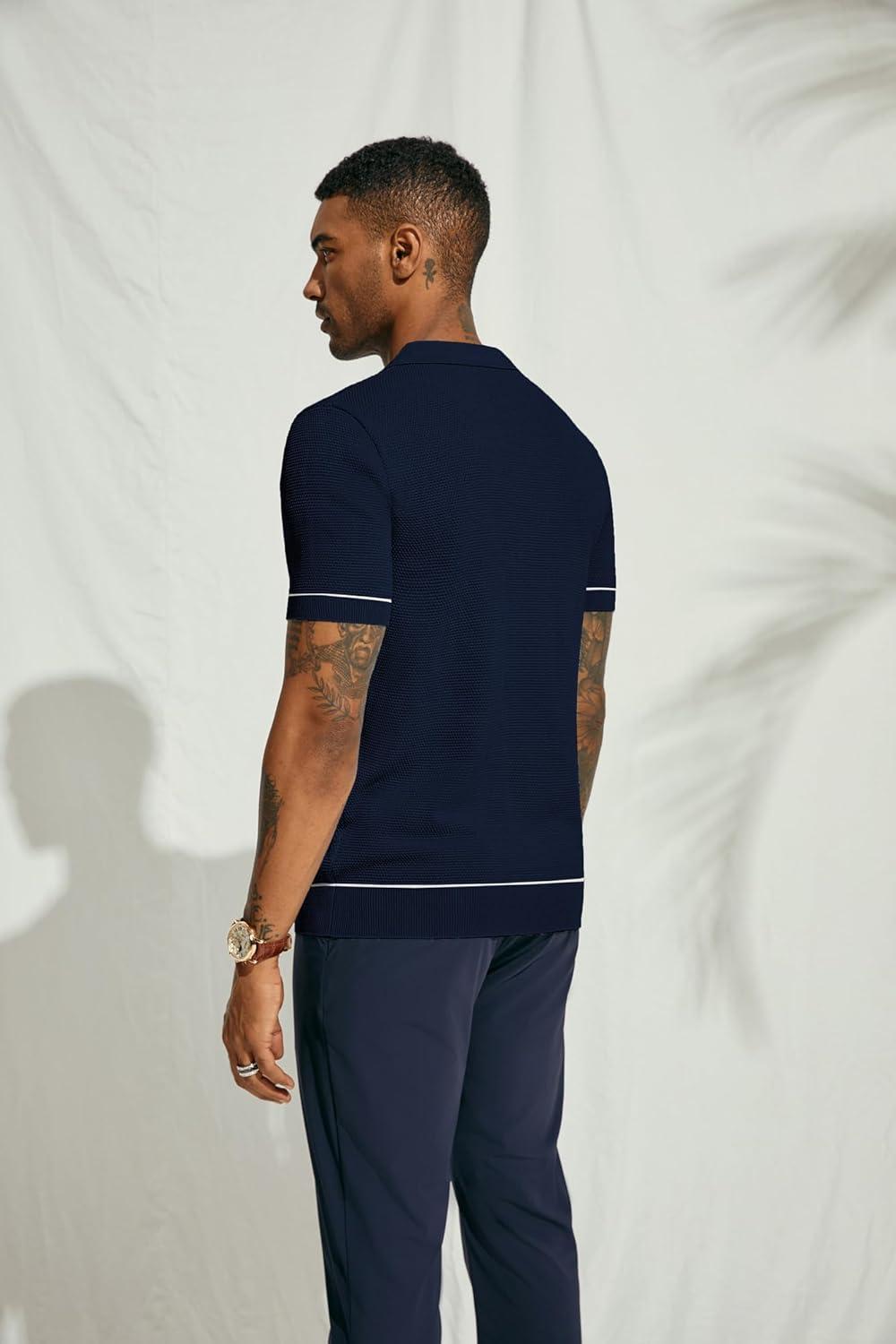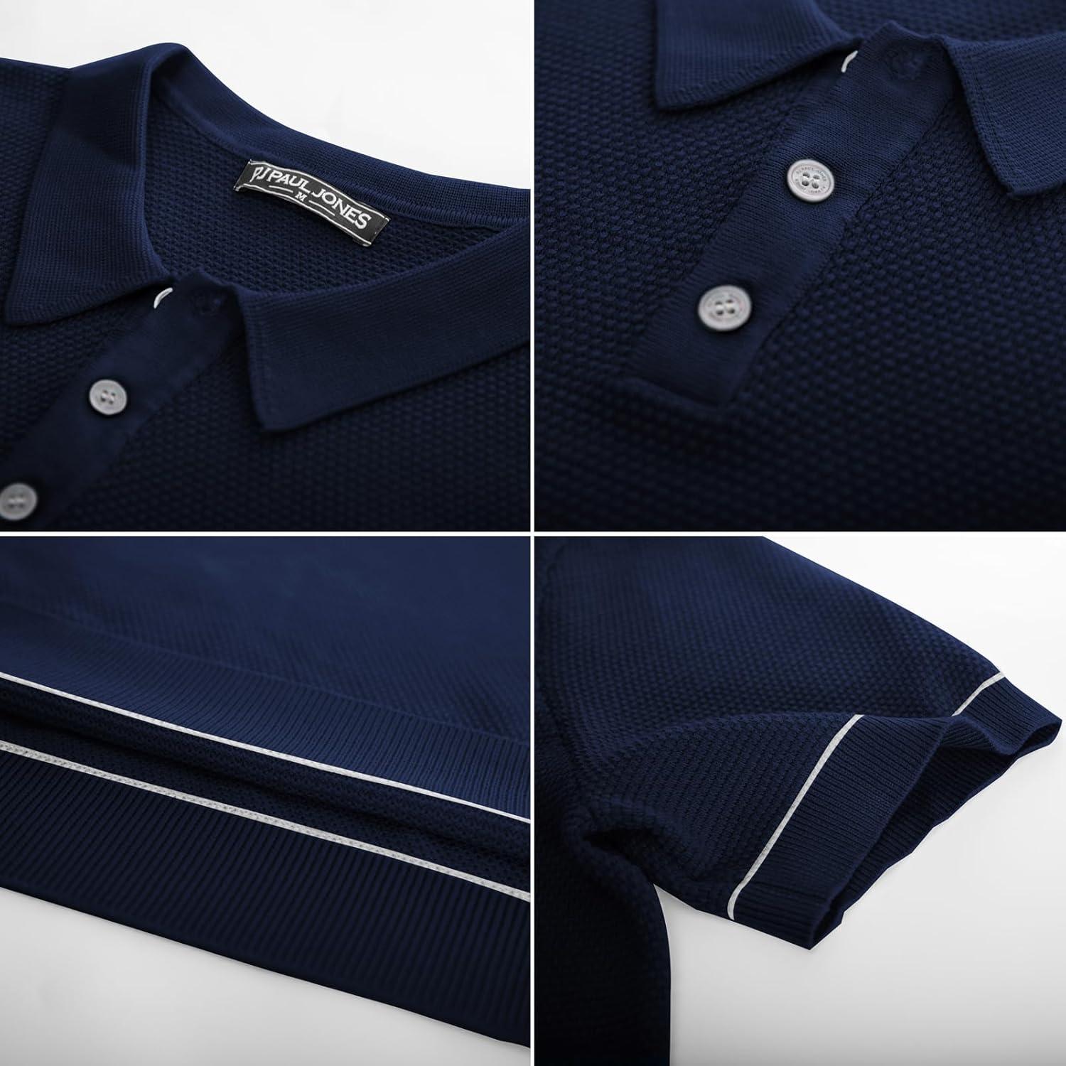 PJ PAUL JONES Mens Knit Polo Shirts Short Sleeve Textured Polo Shirts Sretchy Regular Fit(Navy Blue)