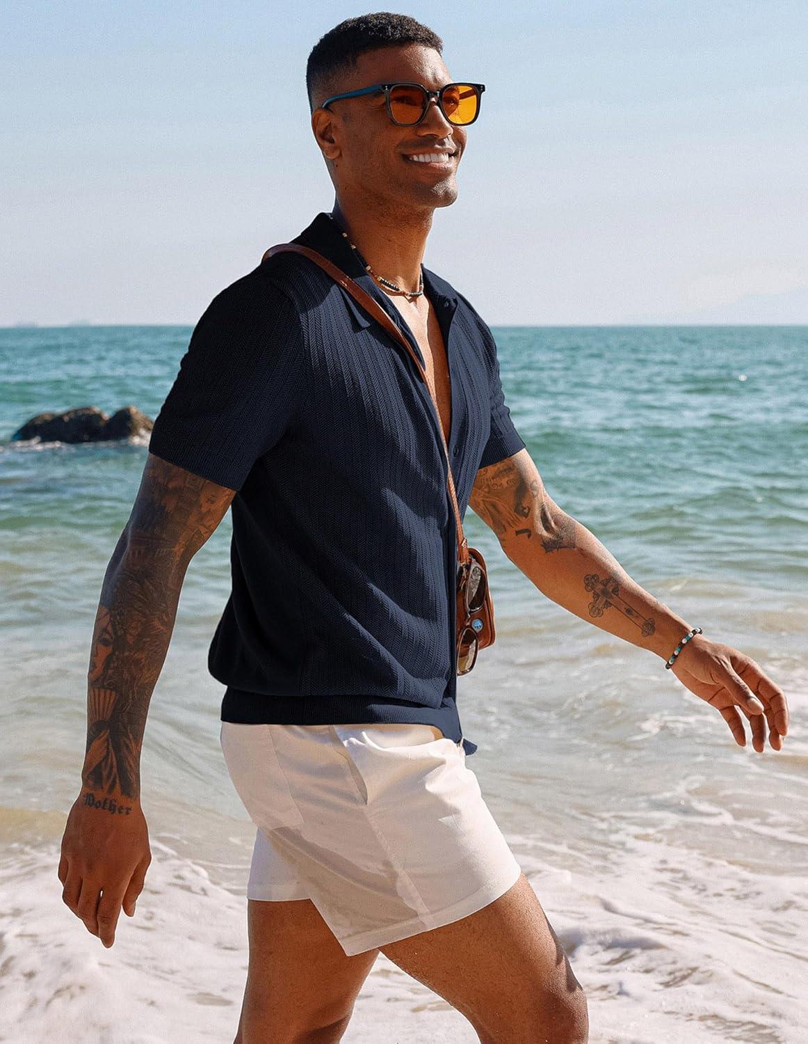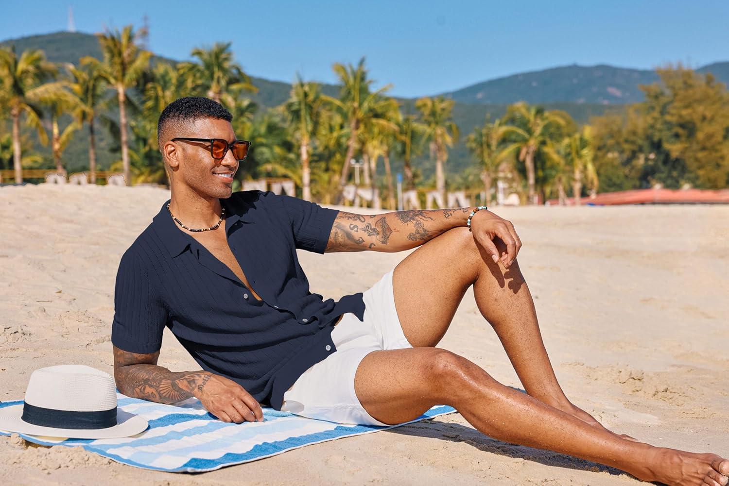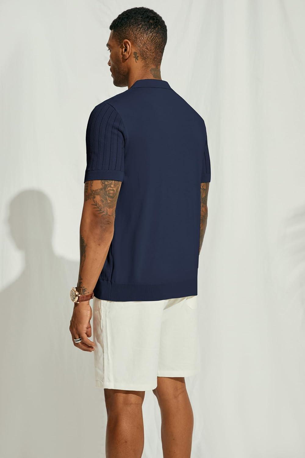 PJ PAUL JONES Mens Knit Shirt Short Sleeve Summer Hollow Out Shirt Beach Button Down Shirt(Navy Blue)