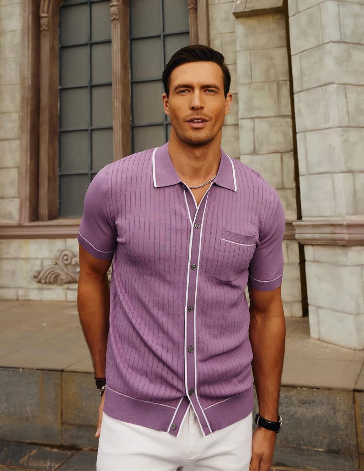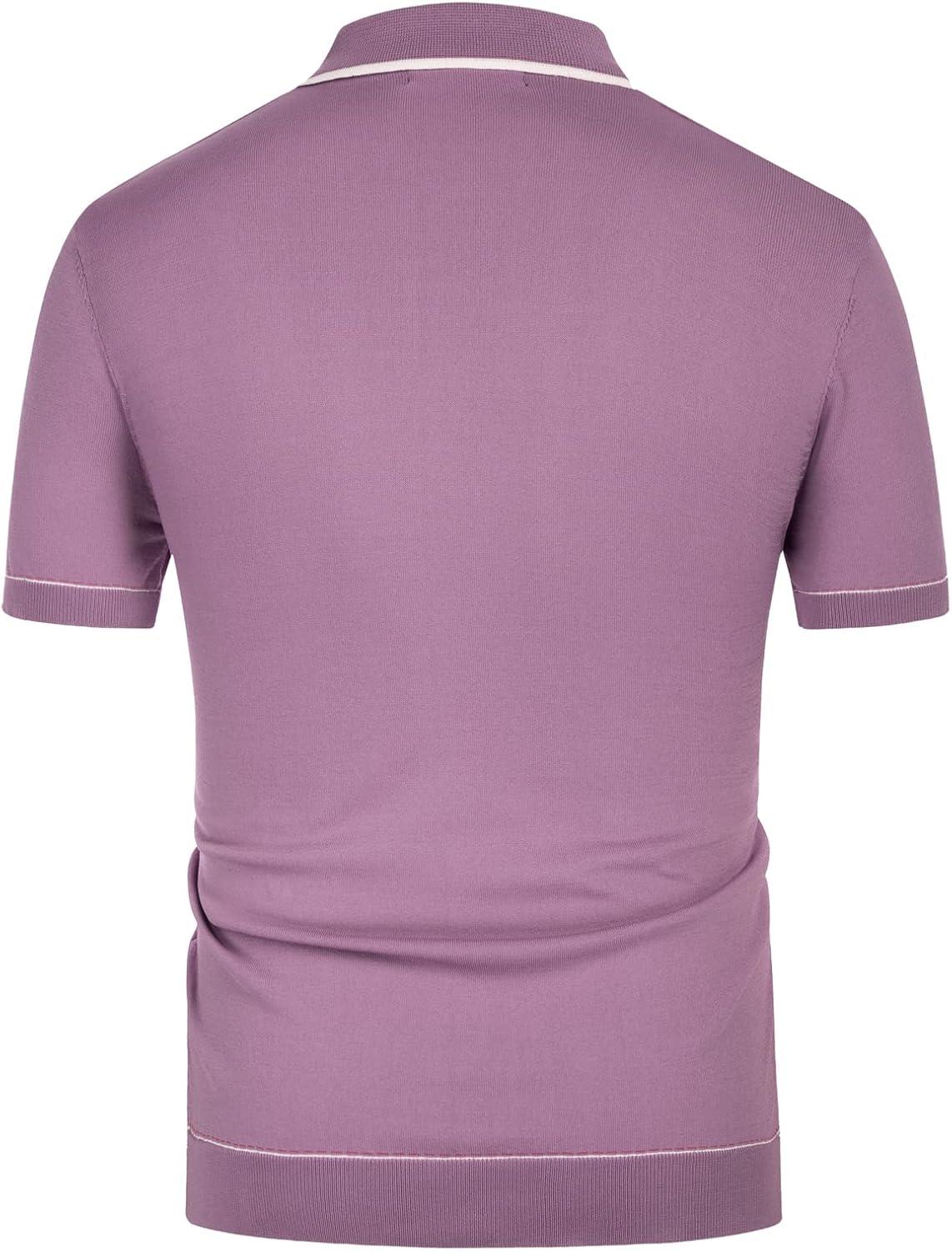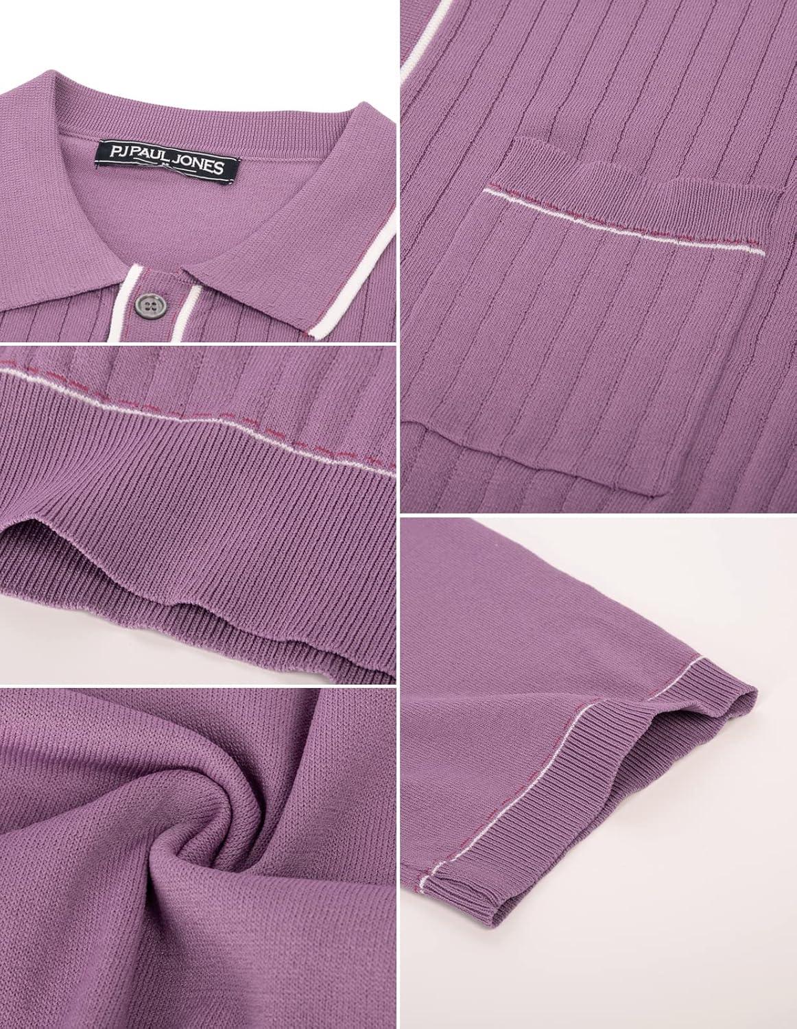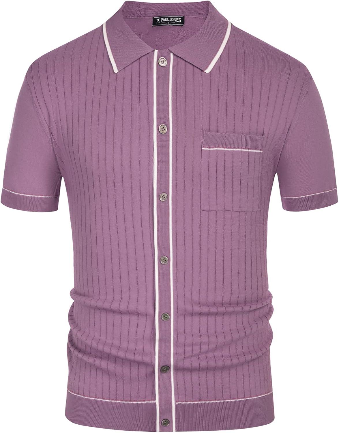 PJ PAUL JONES Mens Knit Shirts Vintage Retro Short Sleeve Button Down Vacation Polo Shirts(Purple)