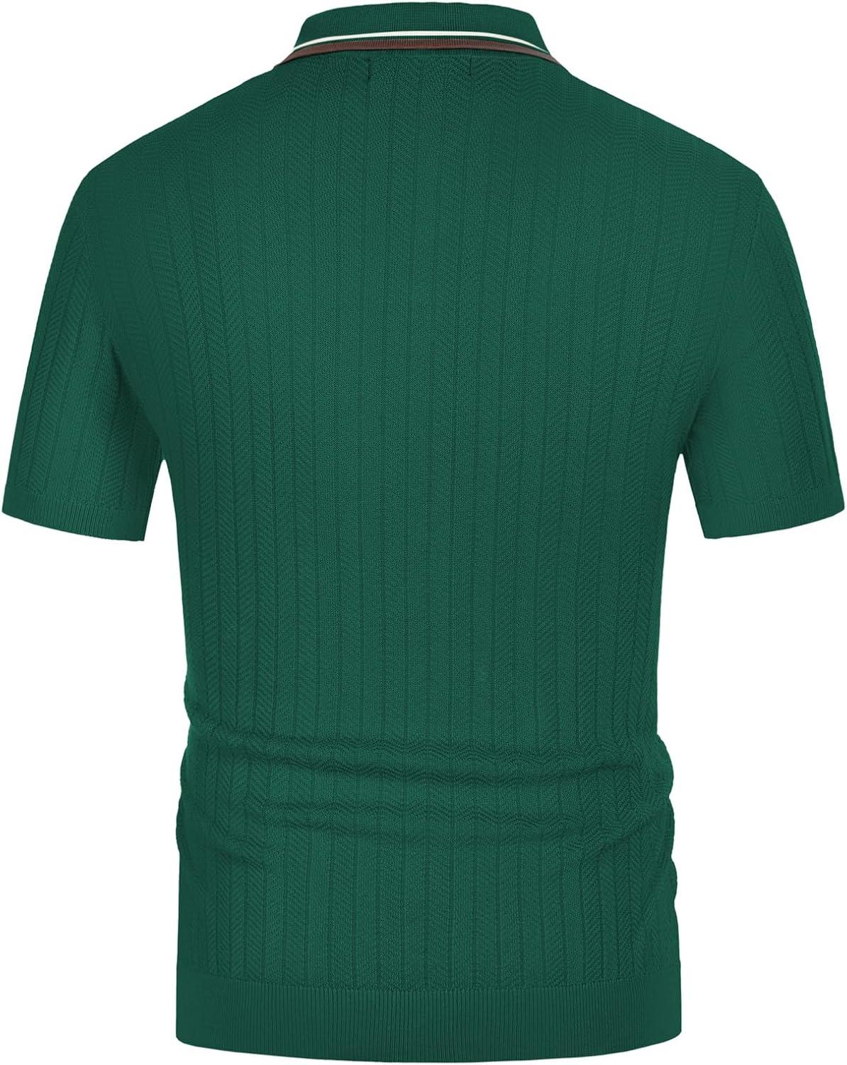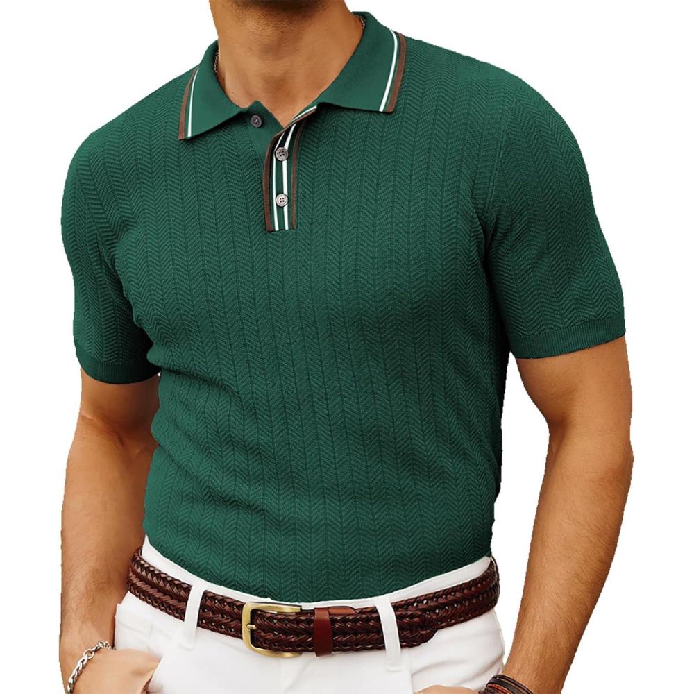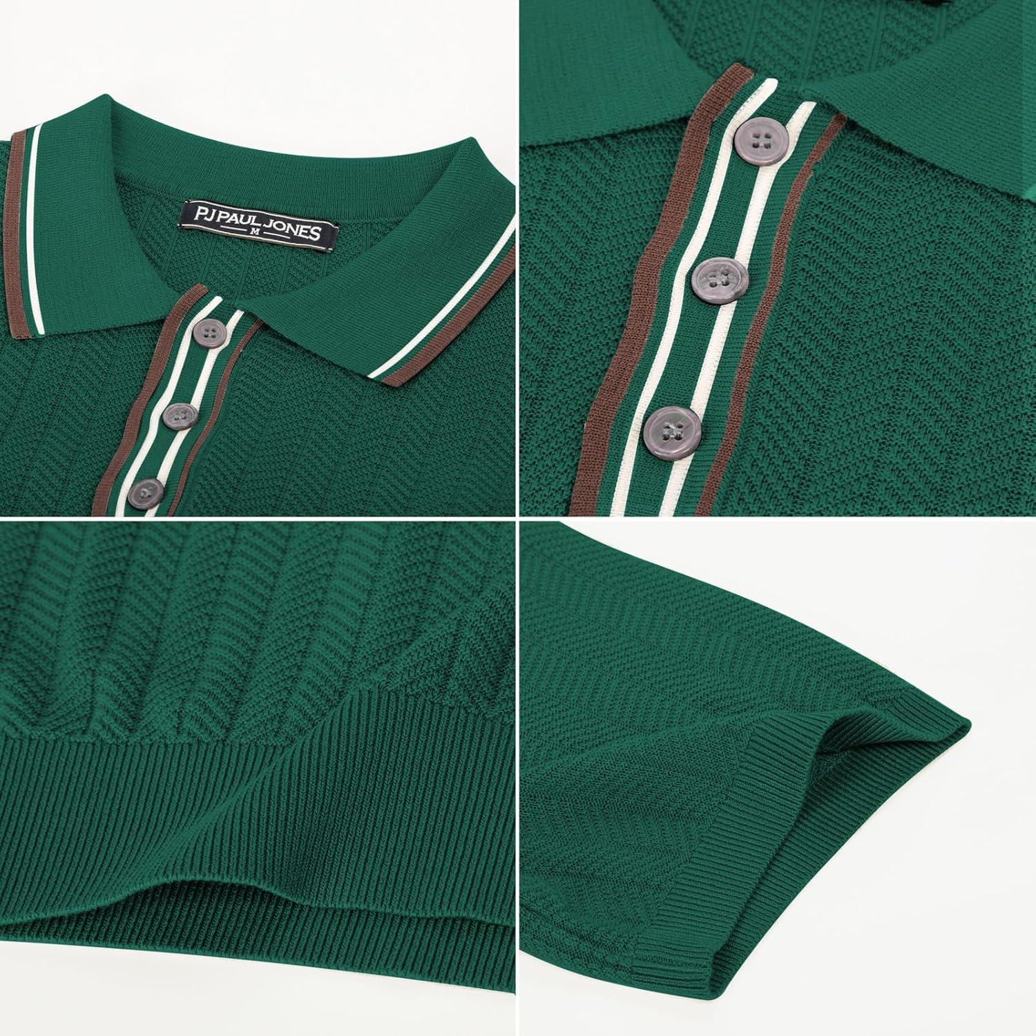 PJ PAUL JONES Mens Knitted Polo Shirts Short Sleeve Textured Pullover Golf Polo T Shirts(Dark Green)