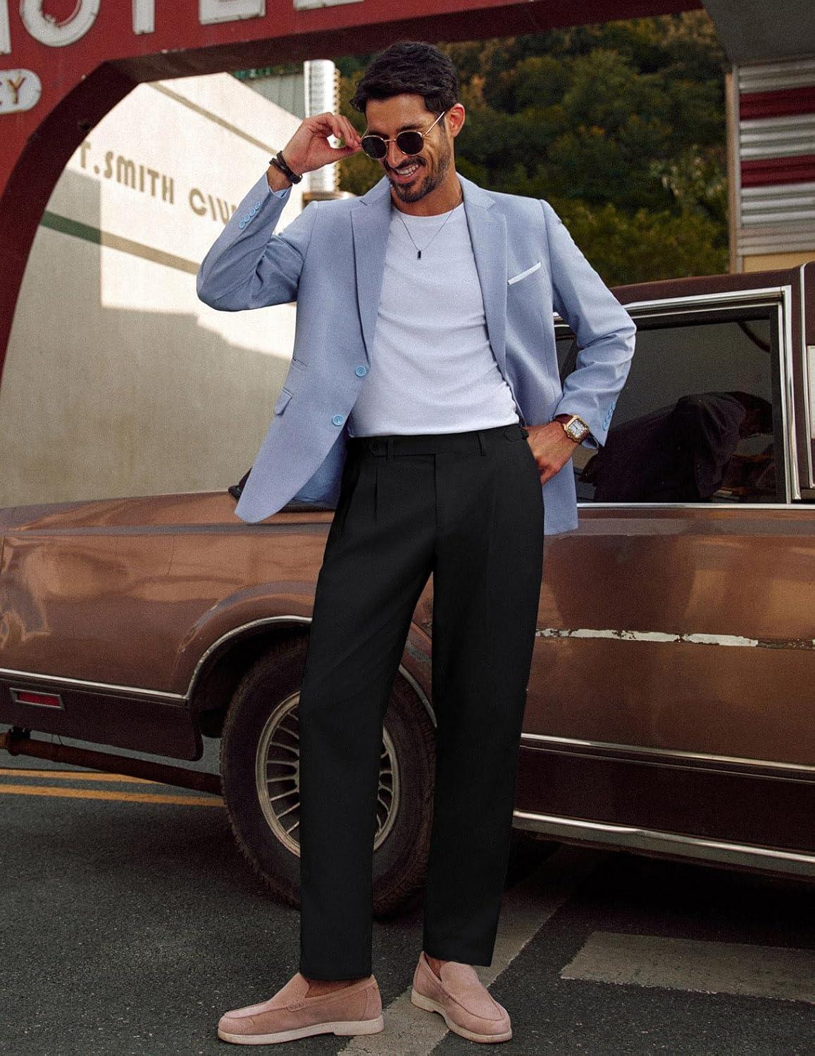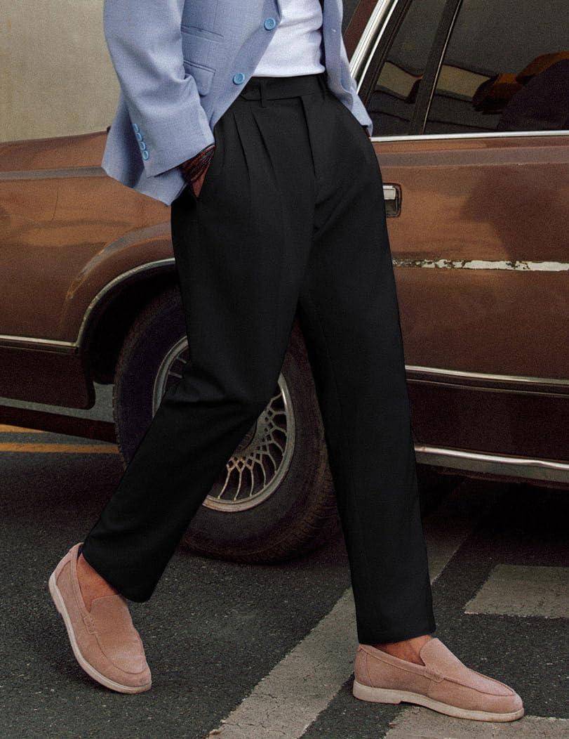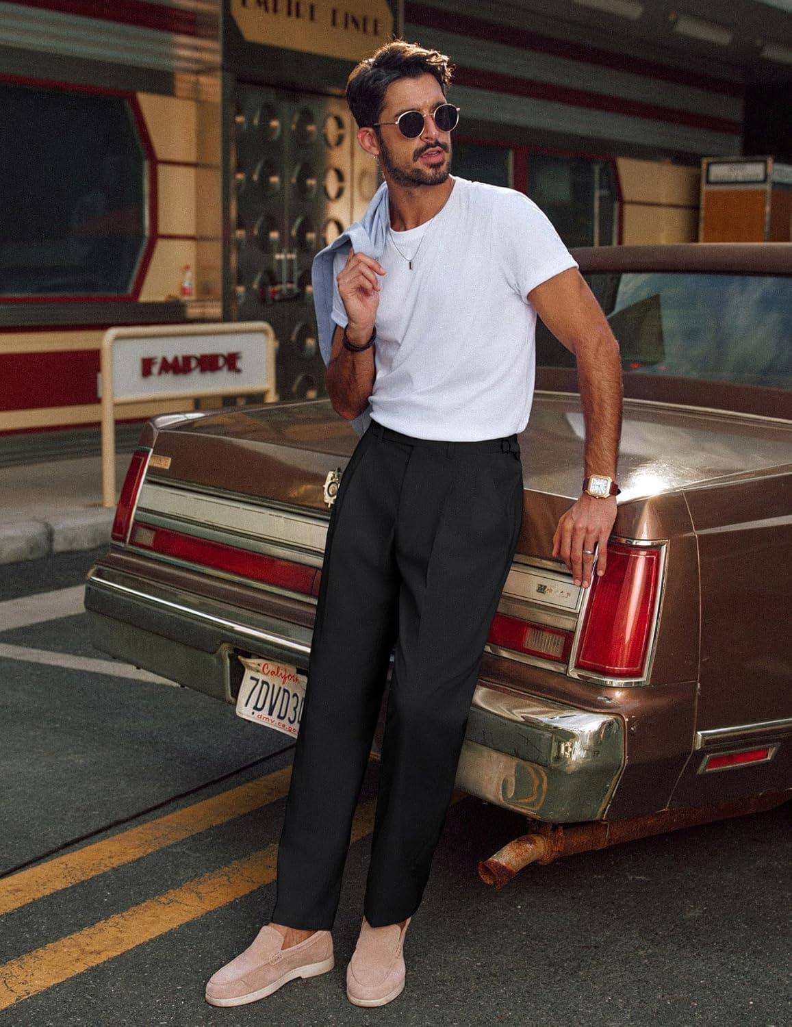 PJ PAUL JONES Mens Linen Dress Pants Casual Slim Fit Expandable Wasit Pleated Front Trousers(Black)