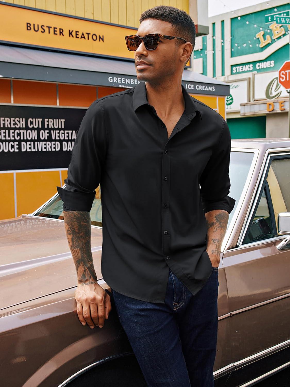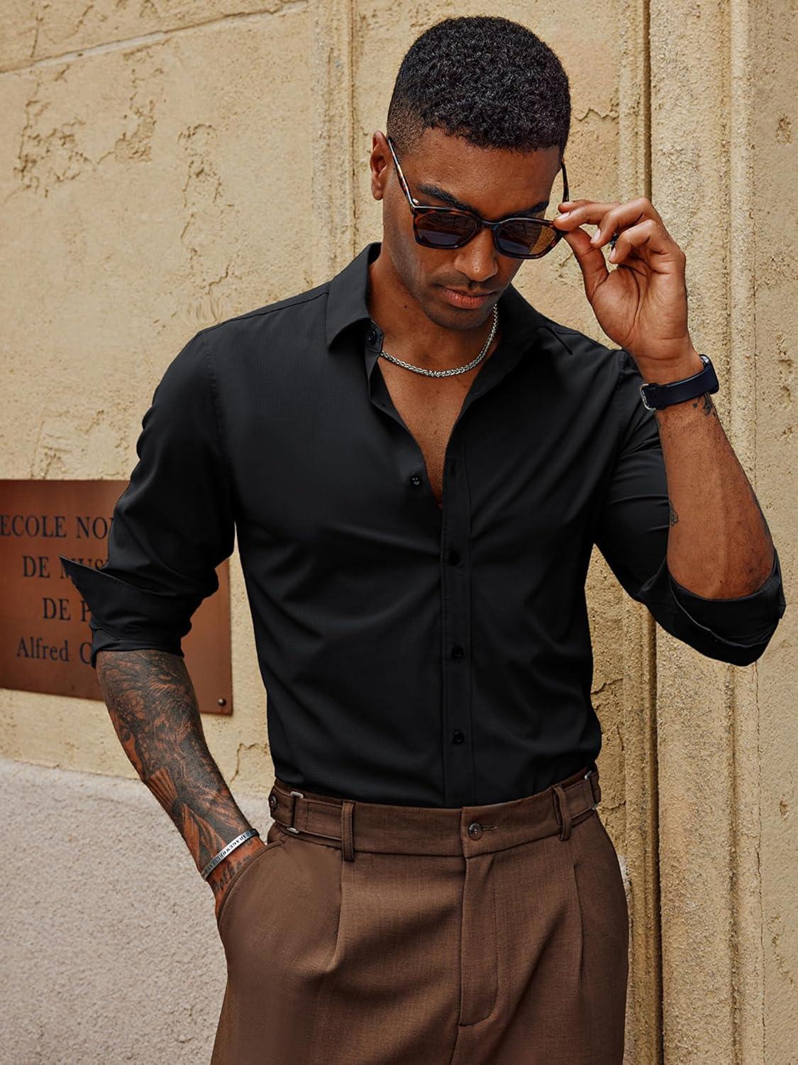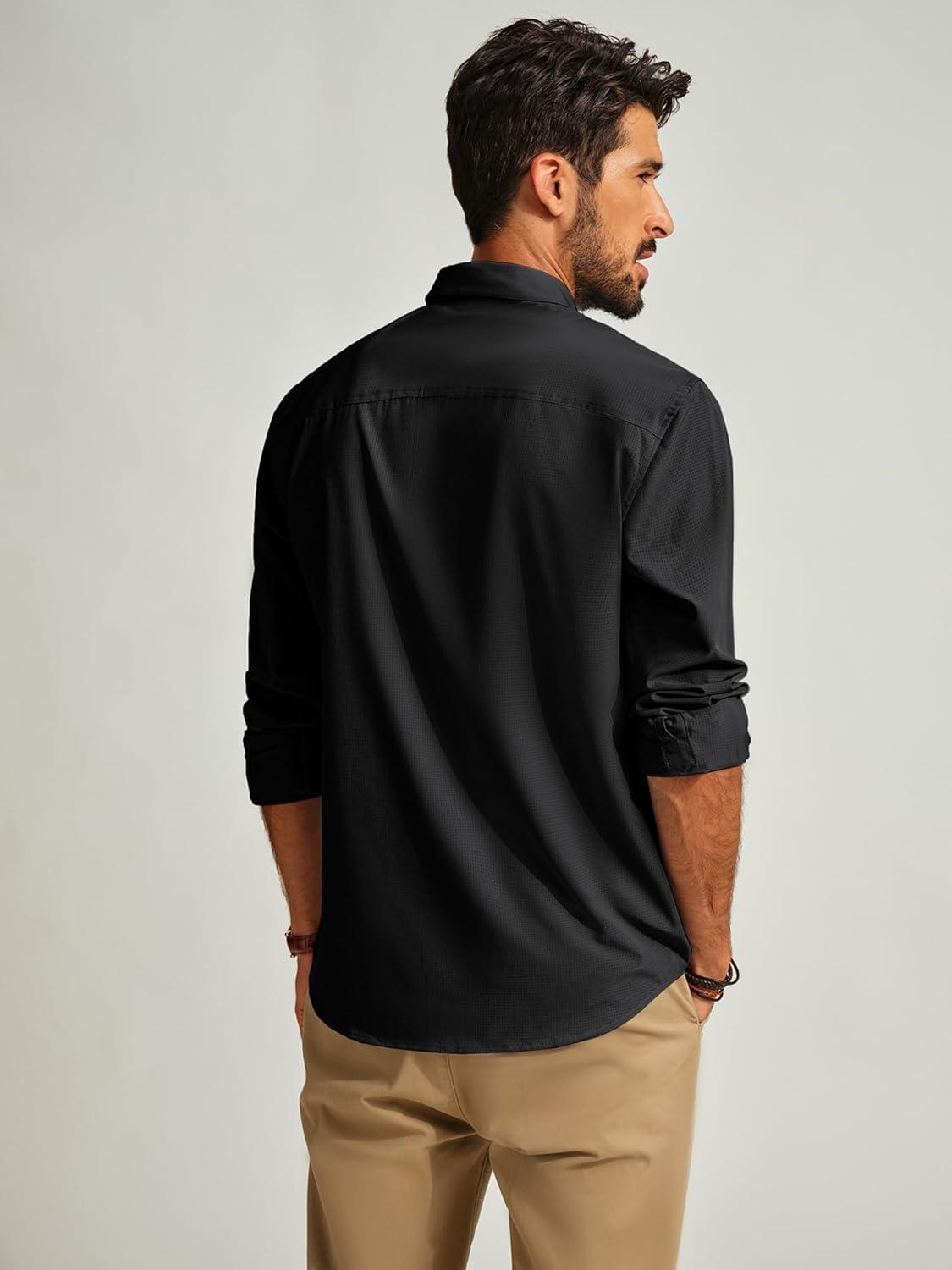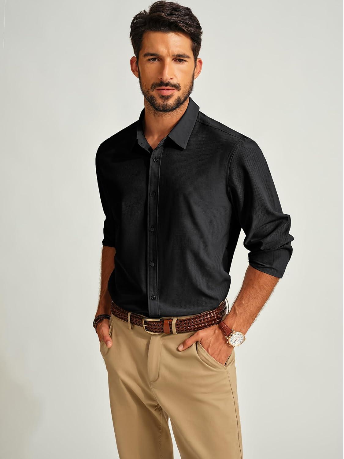 PJ PAUL JONES Mens Long Sleeve Button Down Shirts Wrinkle Free Stretch Untucked Dress Shirts Business Casual Shirt(Black)