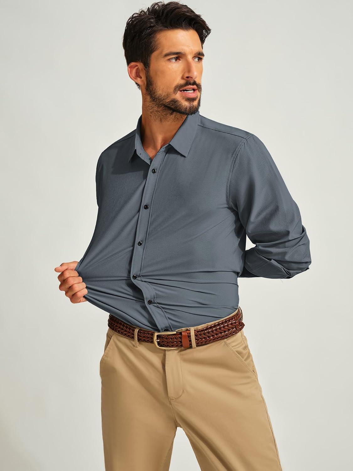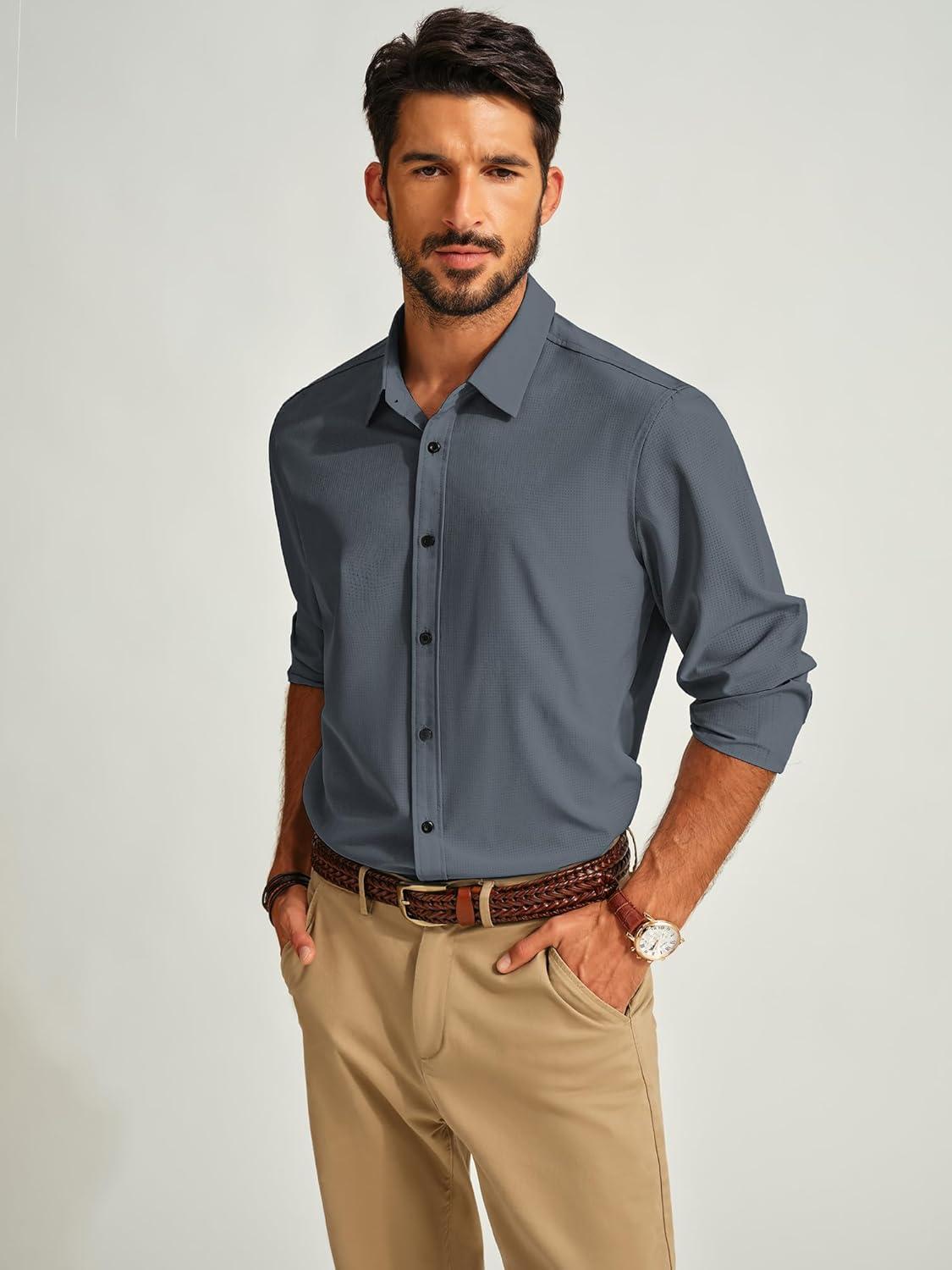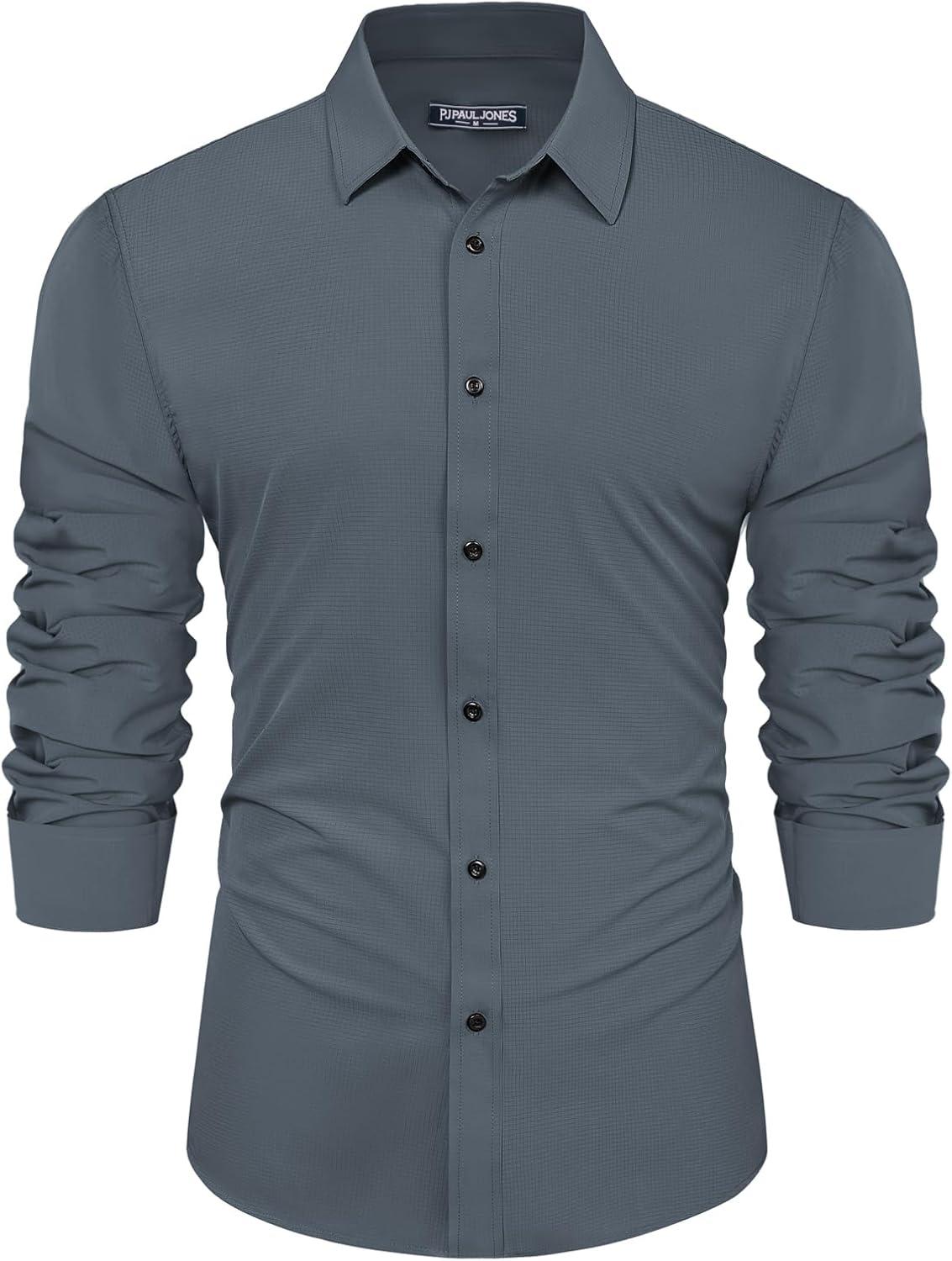 PJ PAUL JONES Mens Long Sleeve Button Down Shirts Wrinkle Free Stretch Untucked Dress Shirts Business Casual Shirt(Blue Grey)