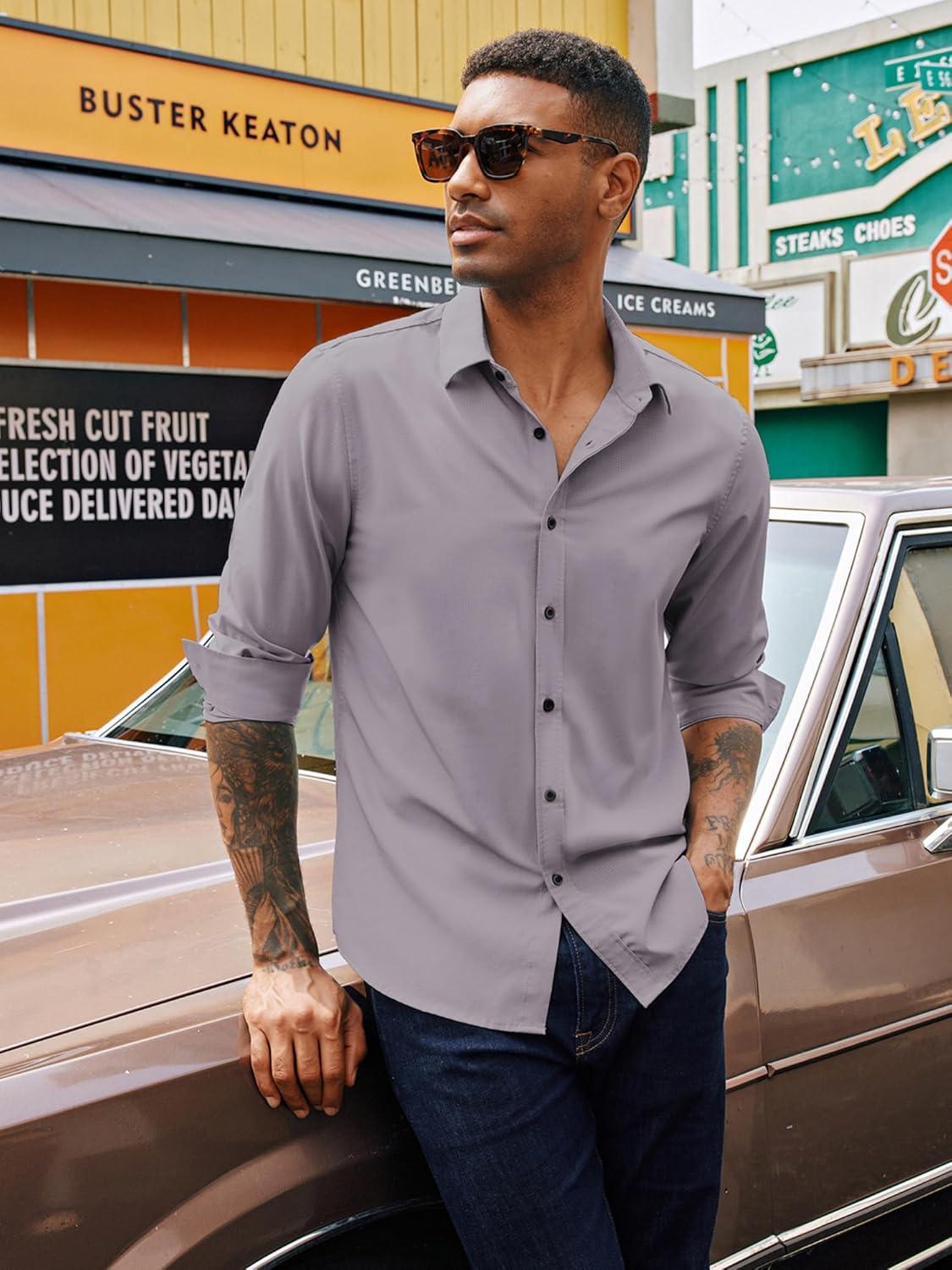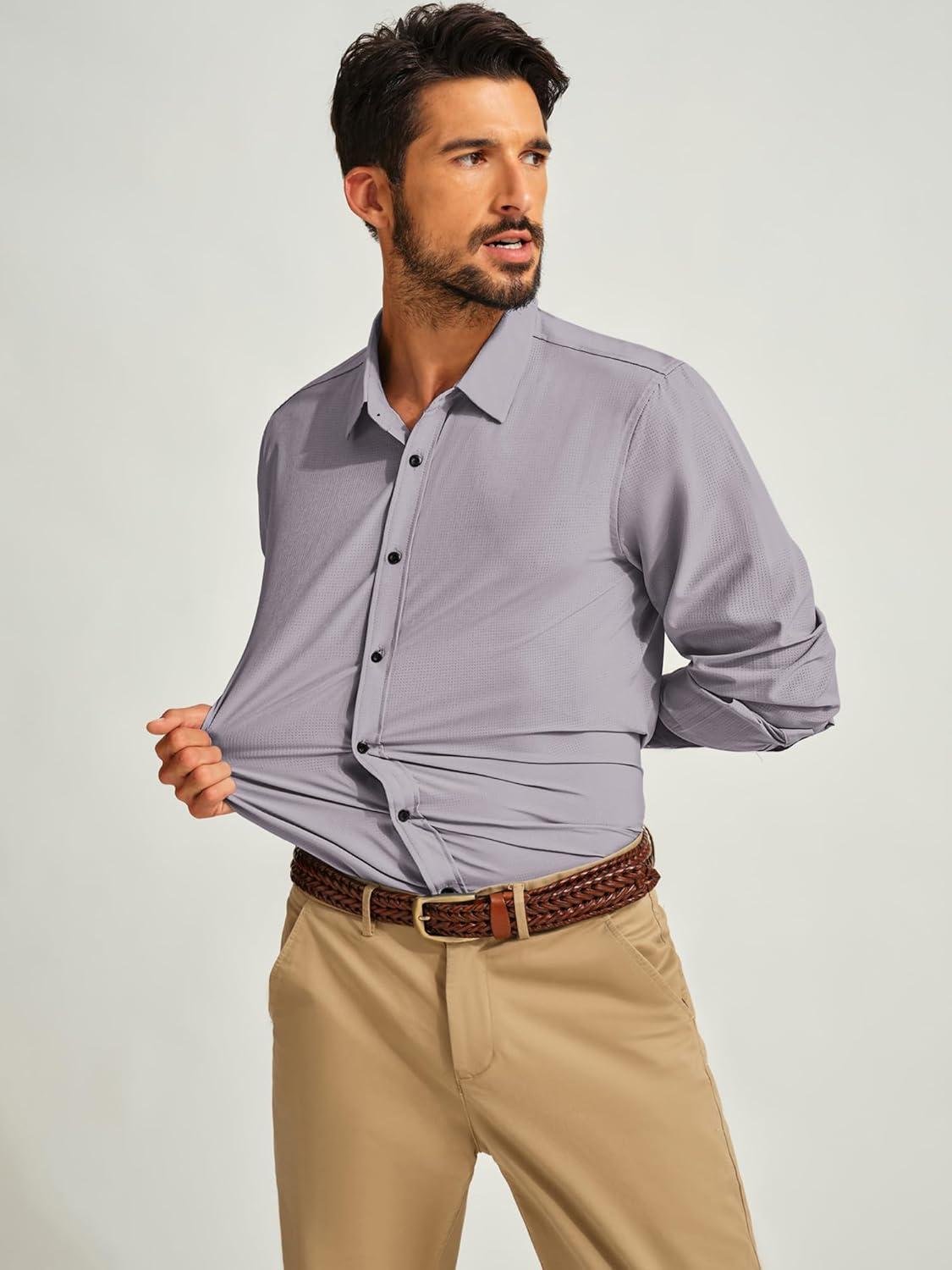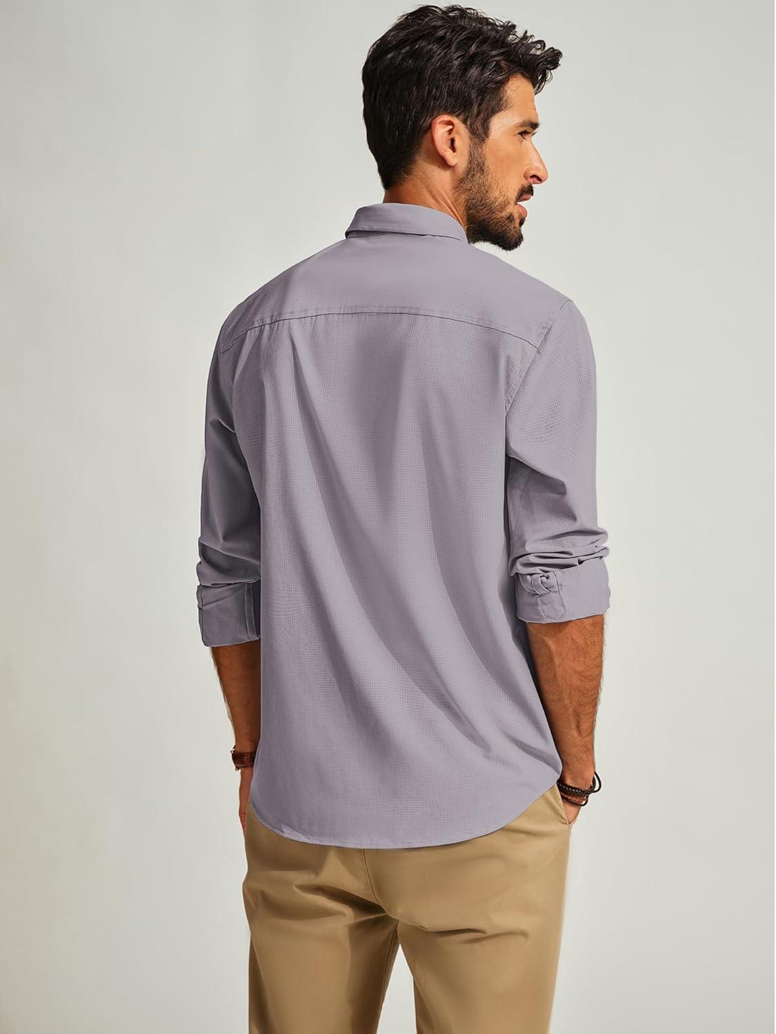 PJ PAUL JONES Mens Long Sleeve Button Down Shirts Wrinkle Free Stretch Untucked Dress Shirts Business Casual Shirt(Purple Grey)