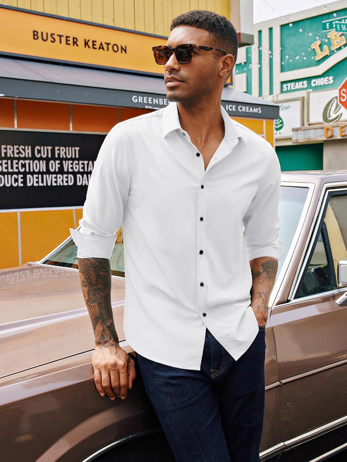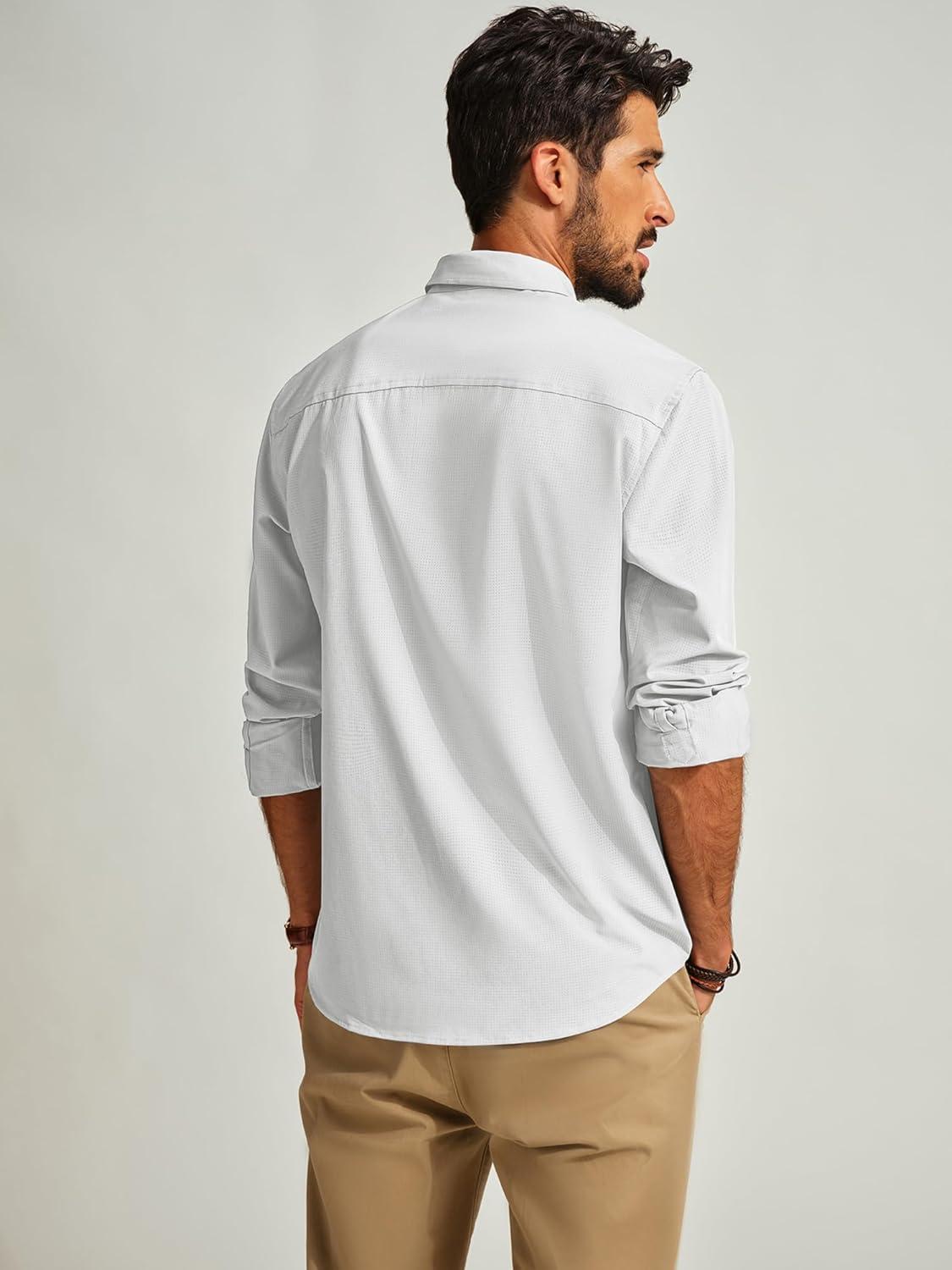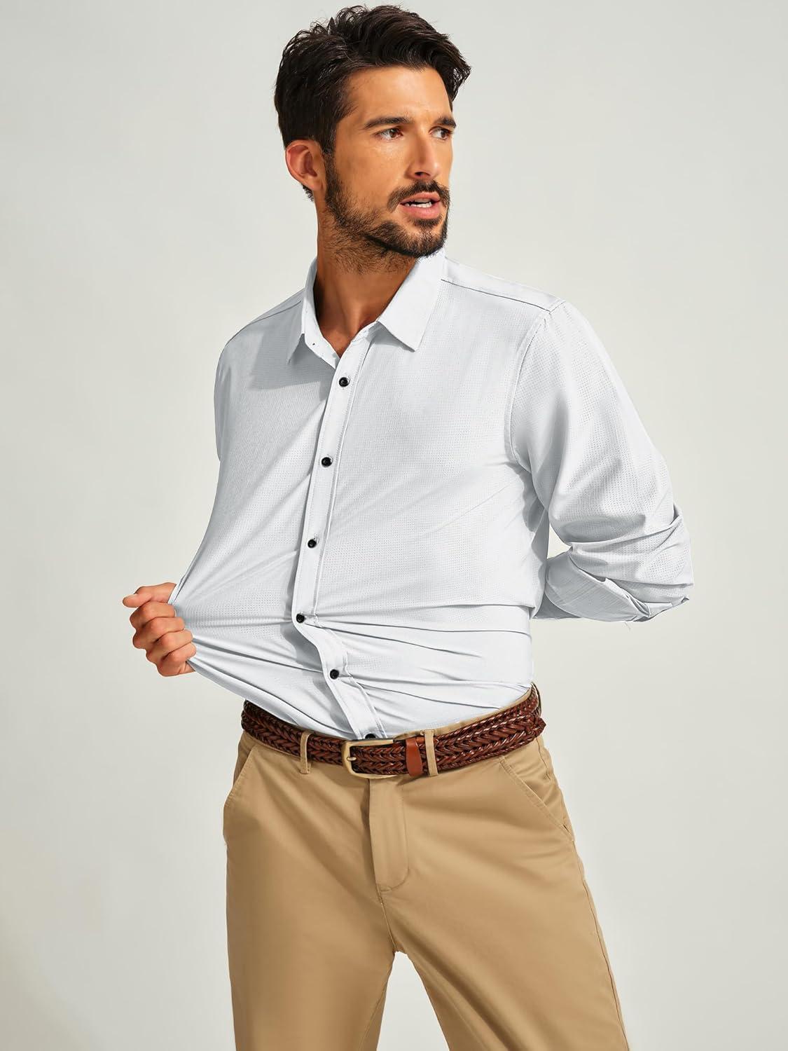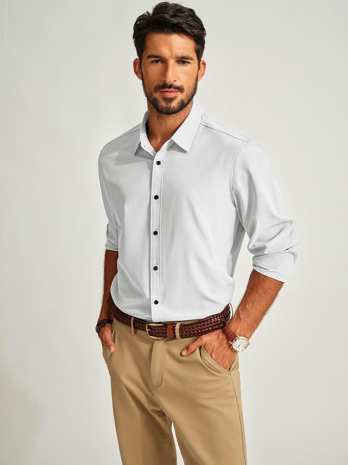 PJ PAUL JONES Mens Long Sleeve Button Down Shirts Wrinkle Free Stretch Untucked Dress Shirts Business Casual Shirt(White)