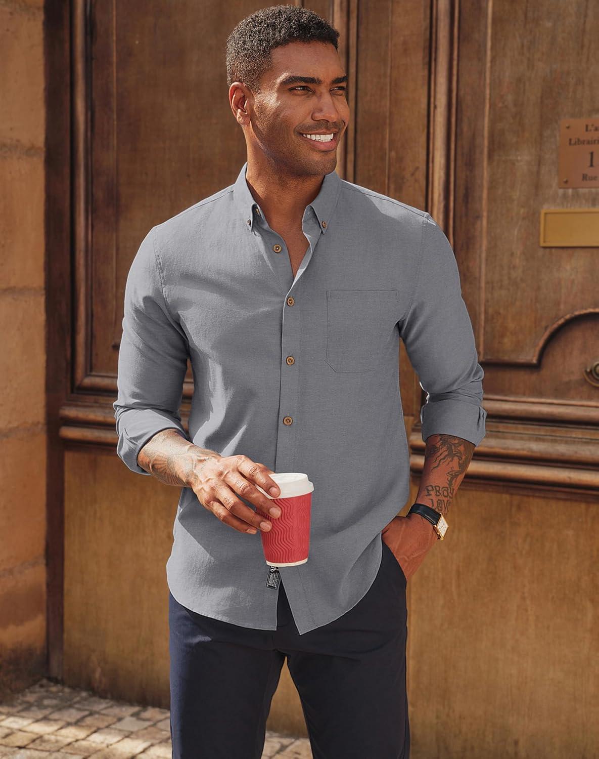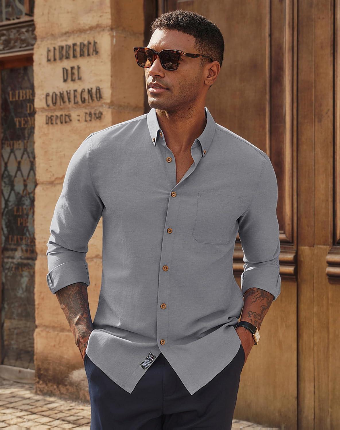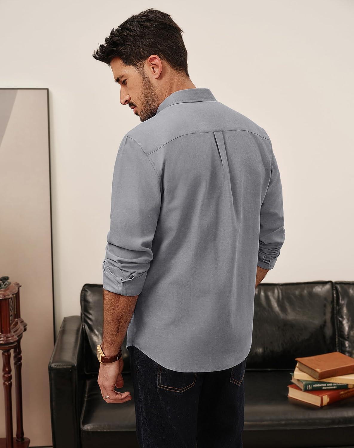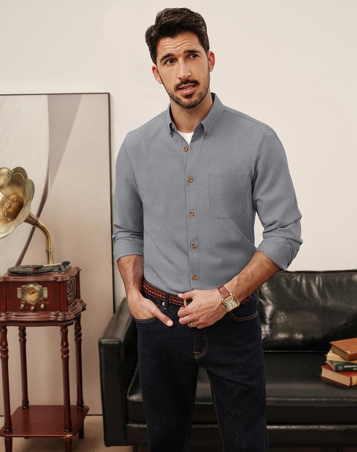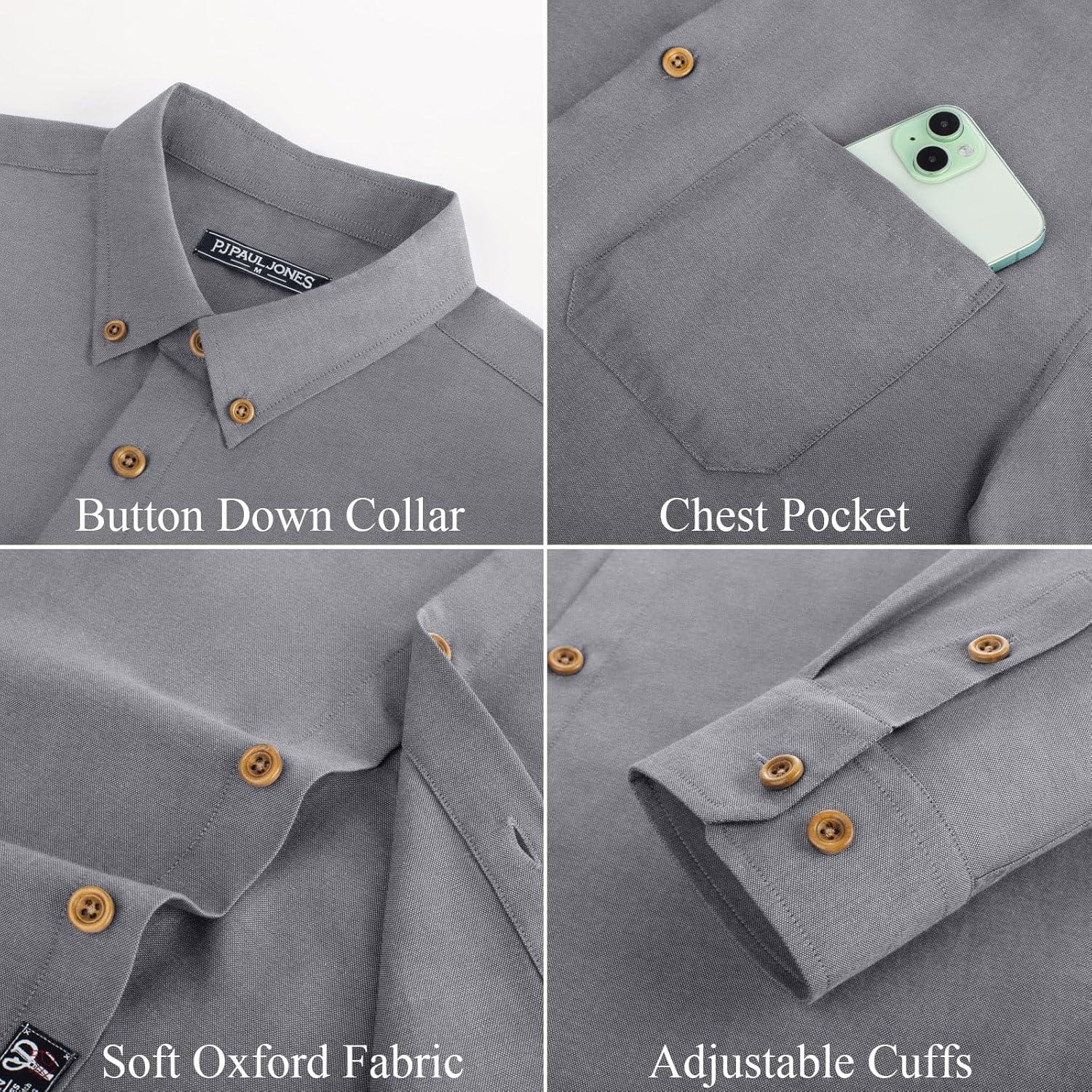PJ PAUL JONES Men’s Oxford Button Down Shirt Long Sleeve Regular Fit Business Casual Dress Shirts with Chest Pocket(Gray)