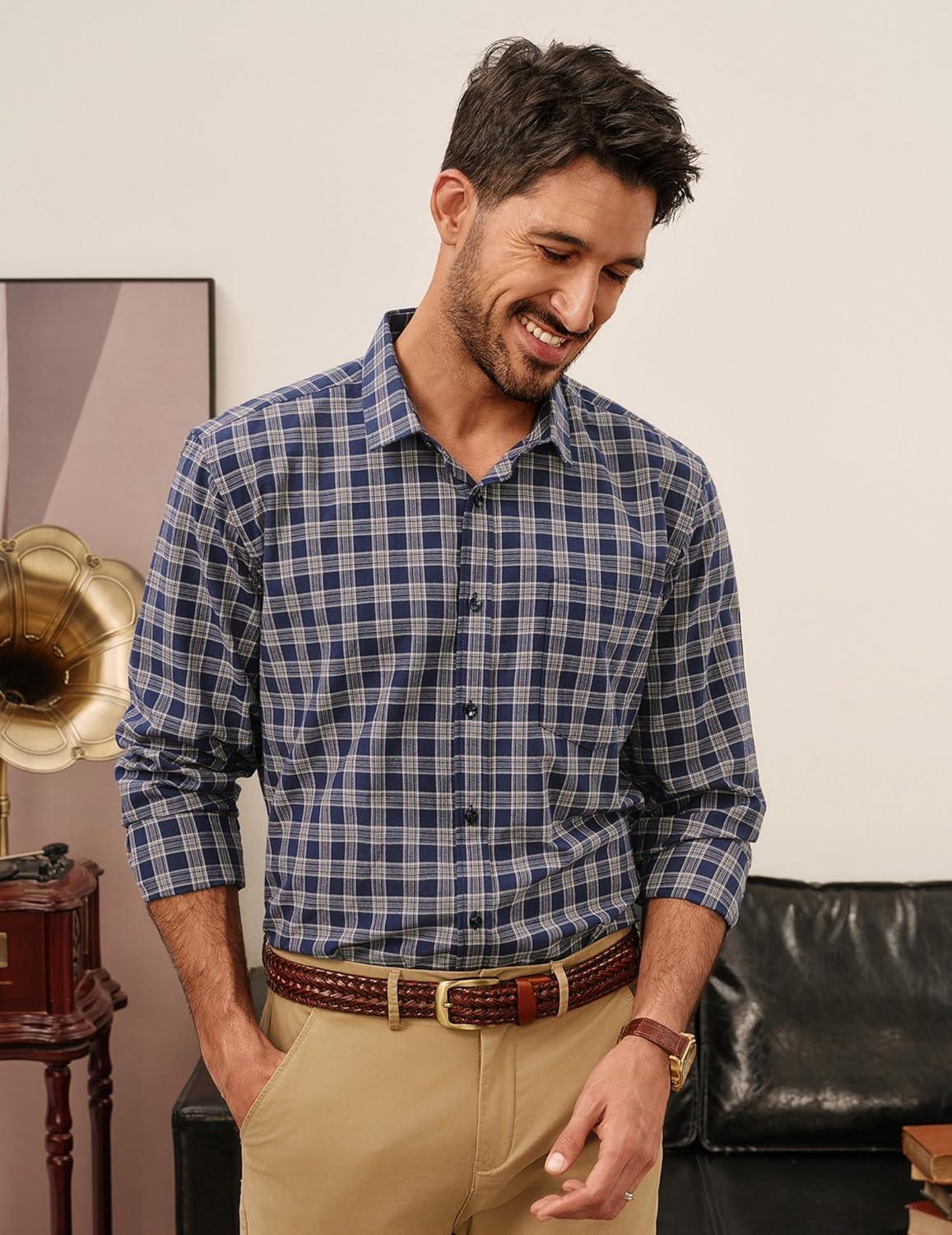 PJ PAUL JONES Men‘s Plaid Button Down Shirt Cotton Long Sleeve Dress Shirt Casual Gingham Shirts(Navy Tan Gingham)