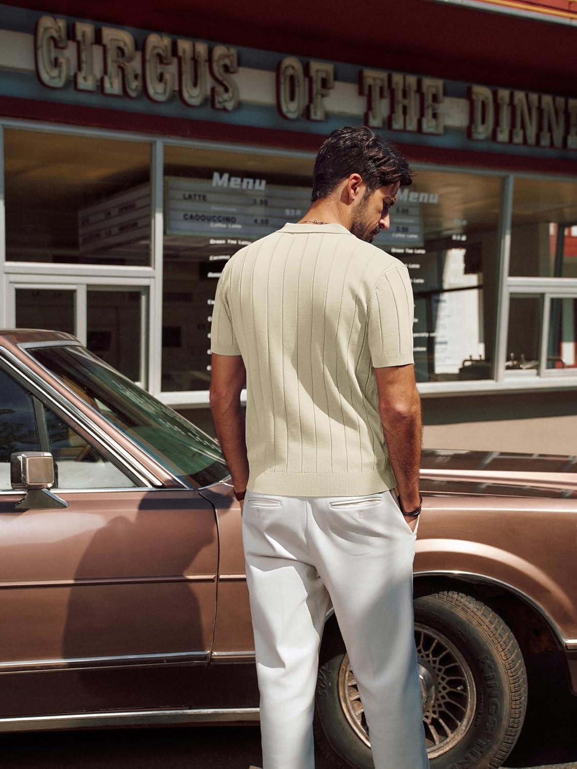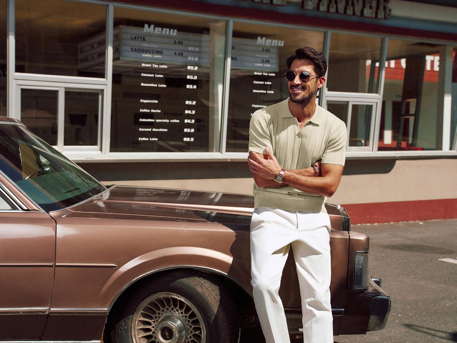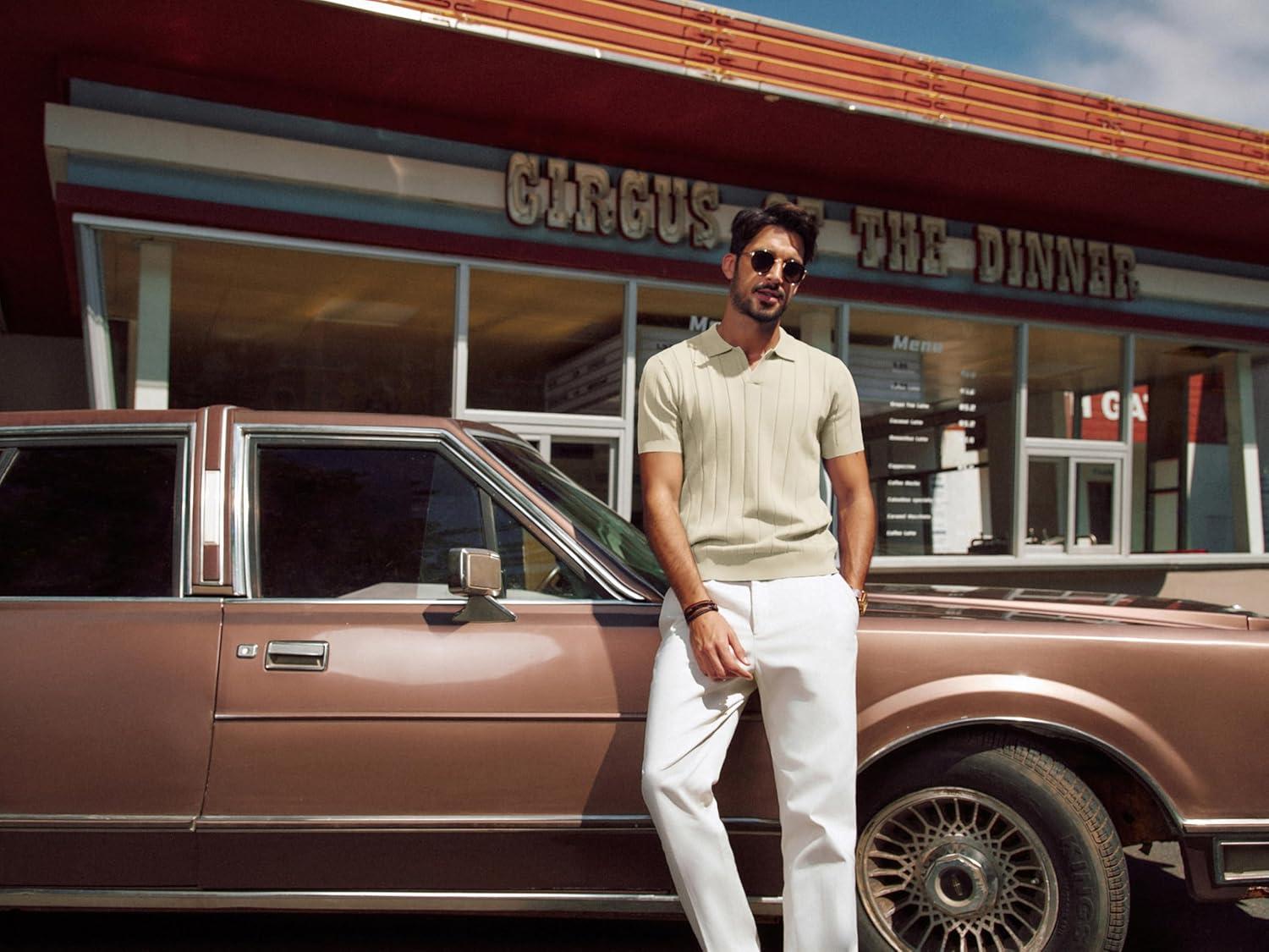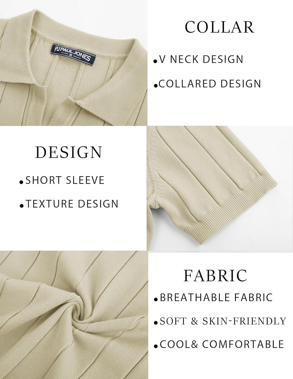 PJ PAUL JONES Men’s Polo Shirt V Neck Texture Shirt Short Sleeve Casual Knit Polos(Apricot)