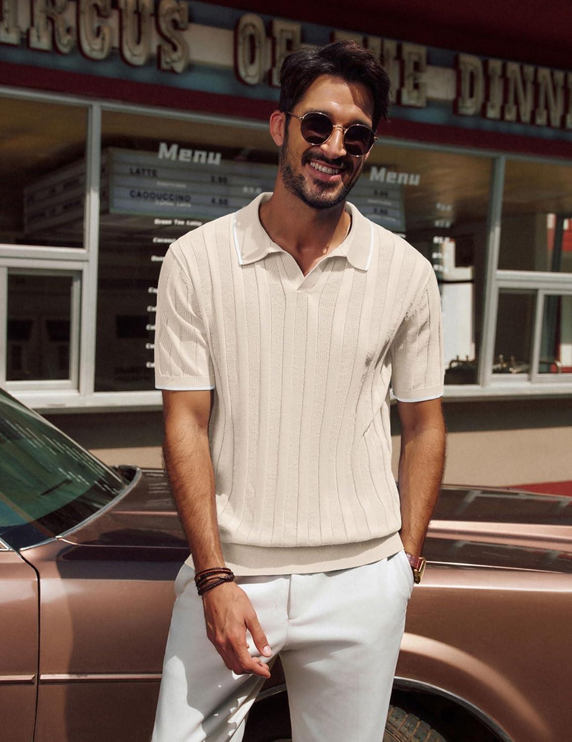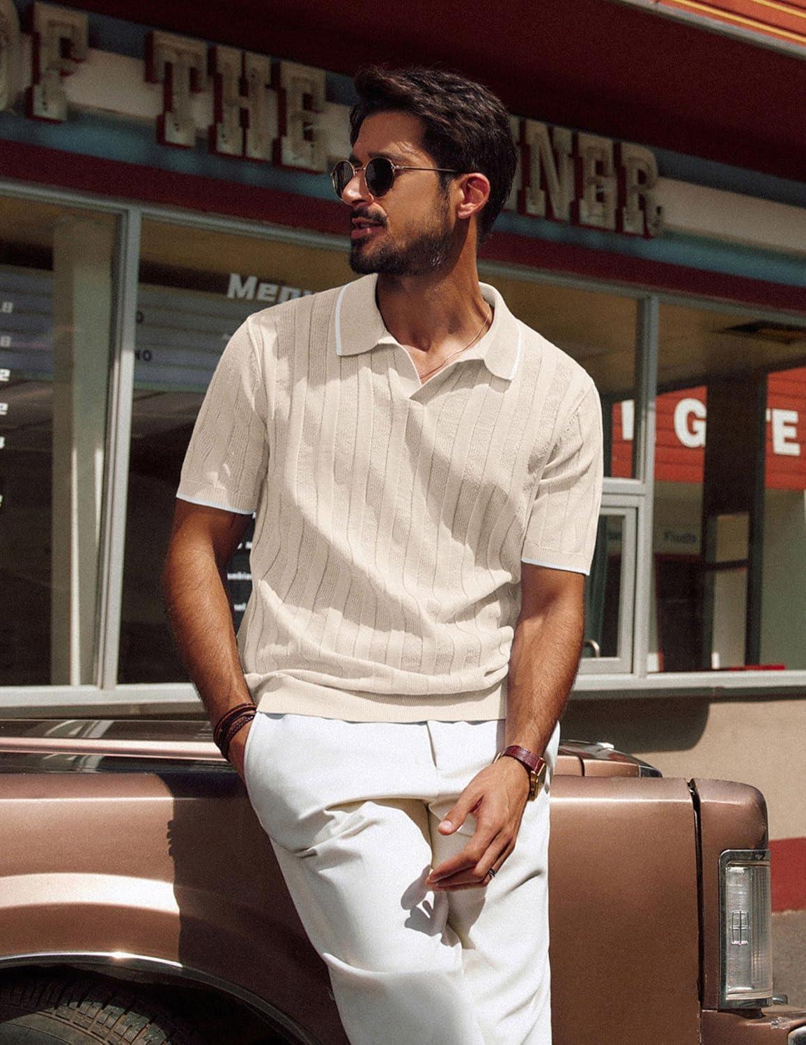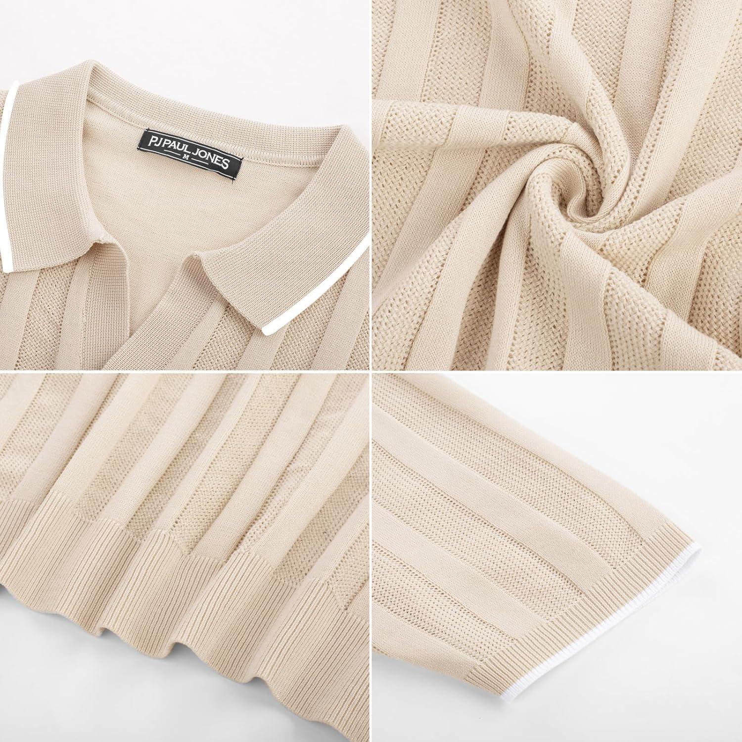 PJ PAUL JONES Mens Polo Shirts Regular Fit Textured V-Neck Knit Golf Polos(Apricot Contrast)