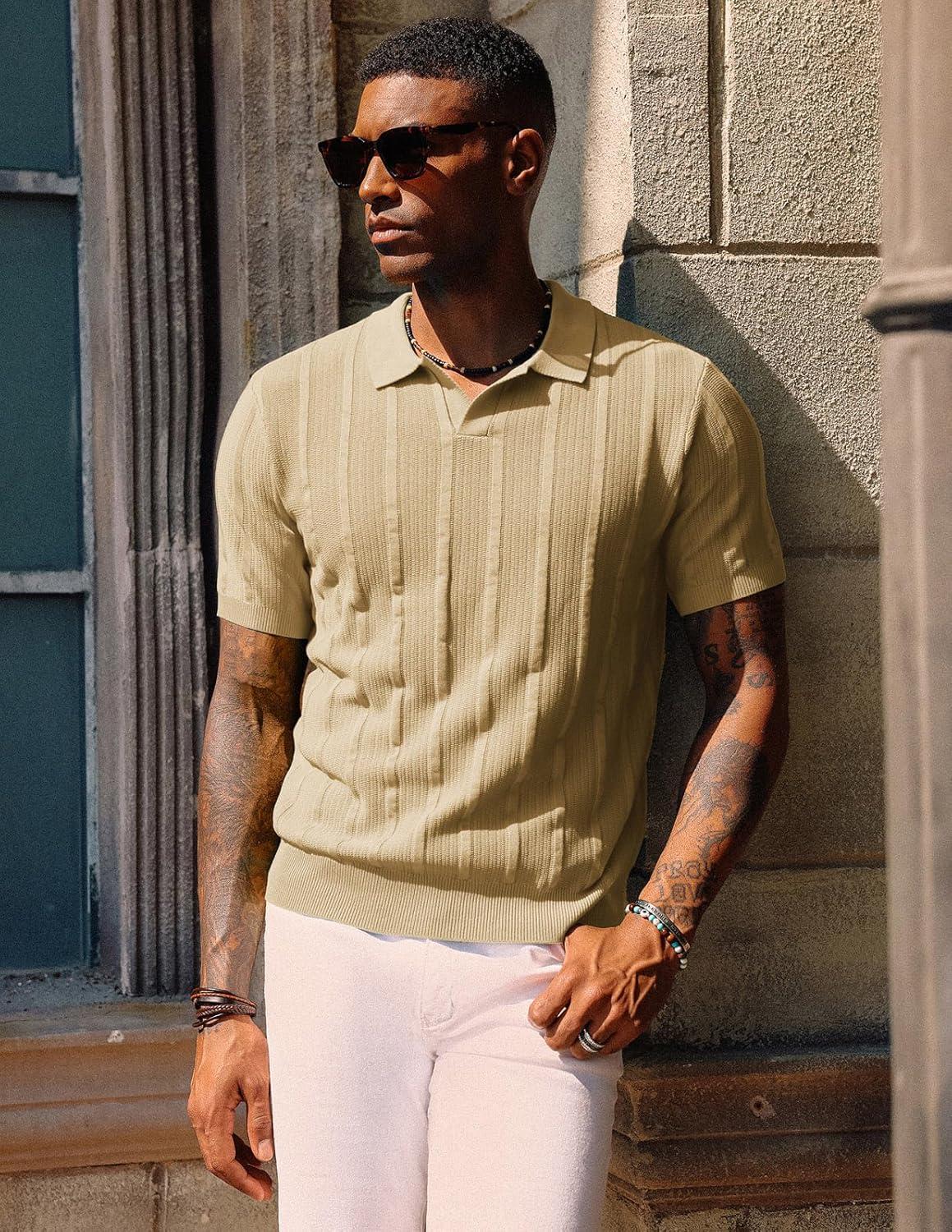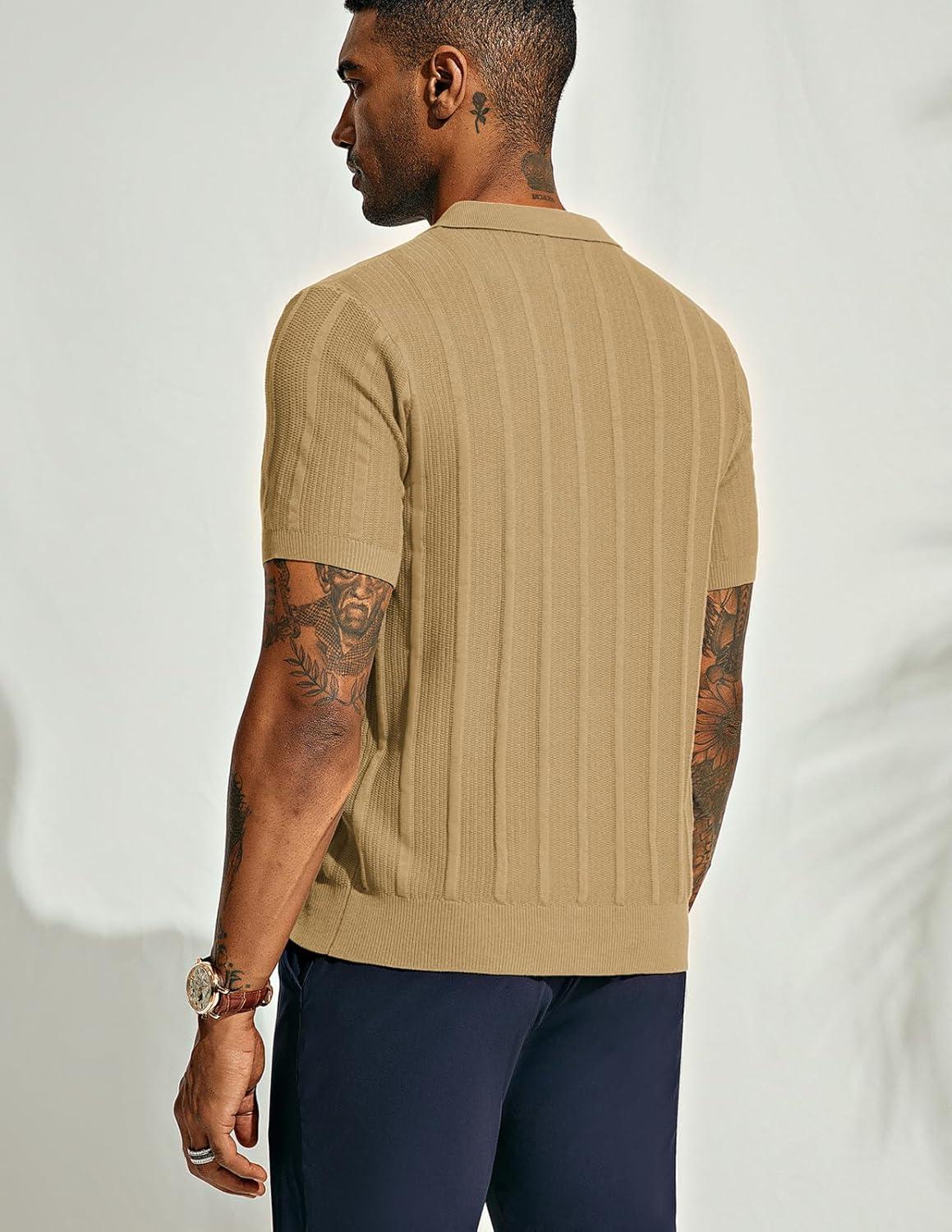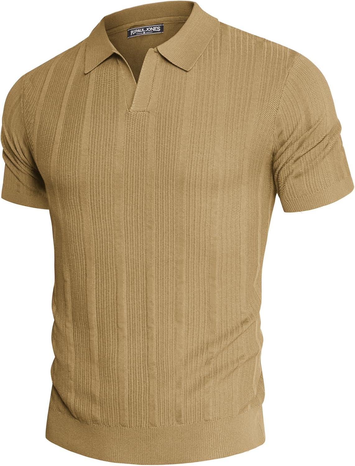 PJ PAUL JONES Mens Polo Shirts Regular Fit Textured V-Neck Knit Golf Polos(Camel)