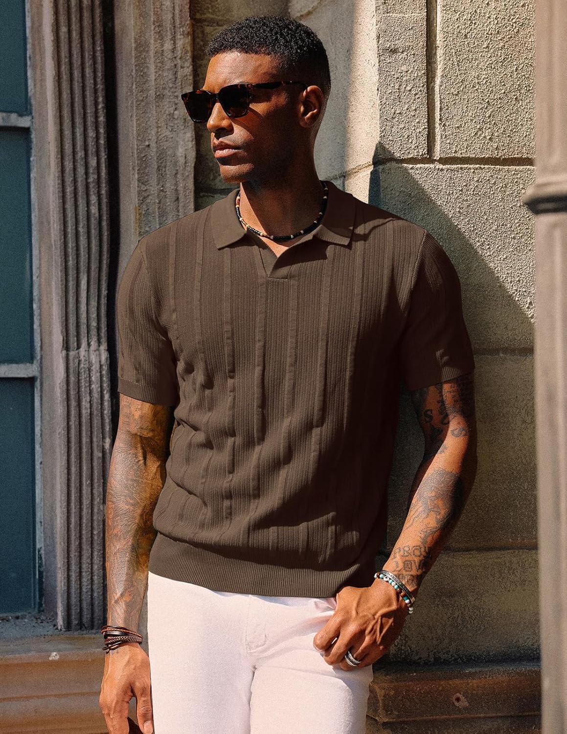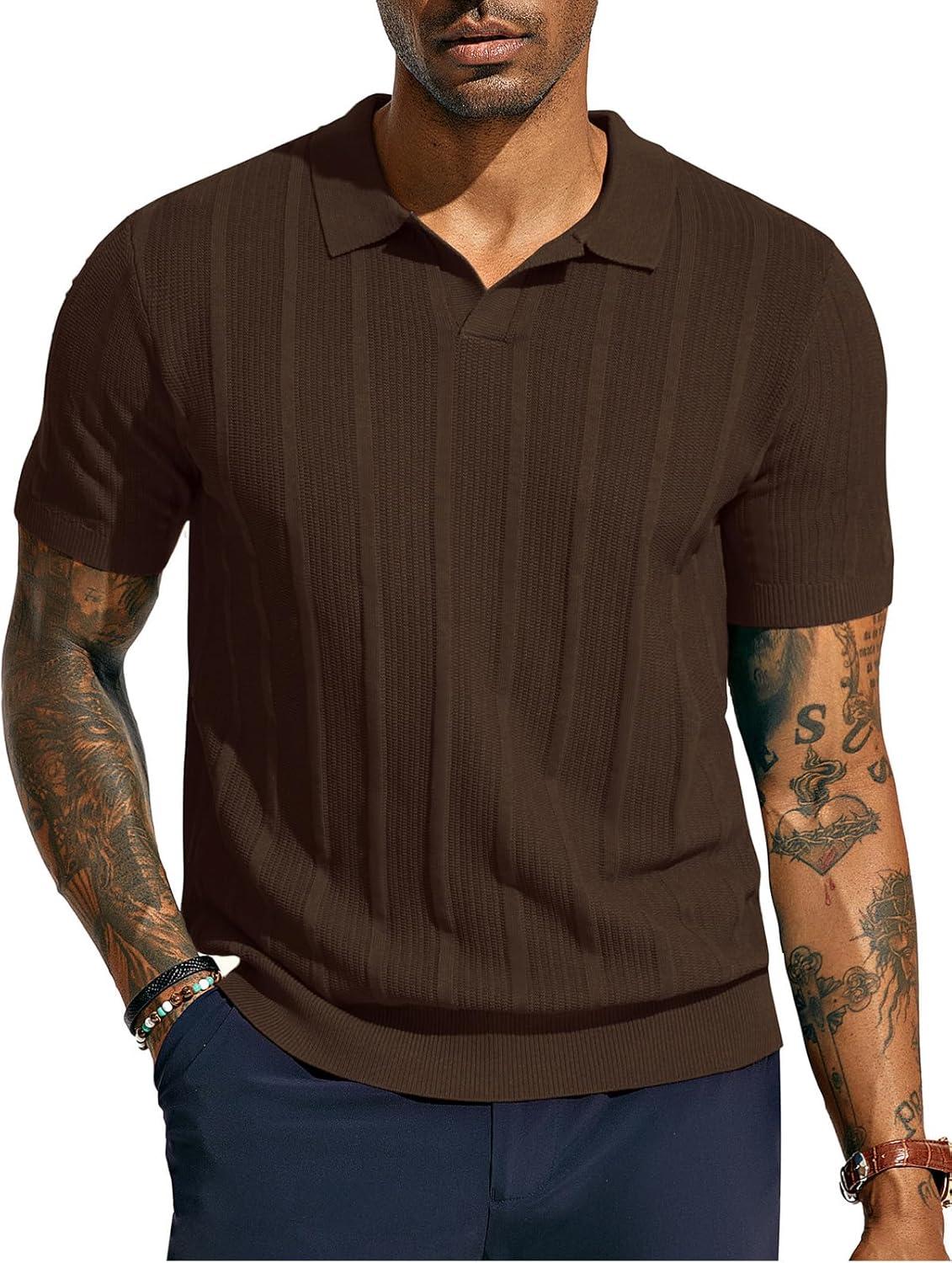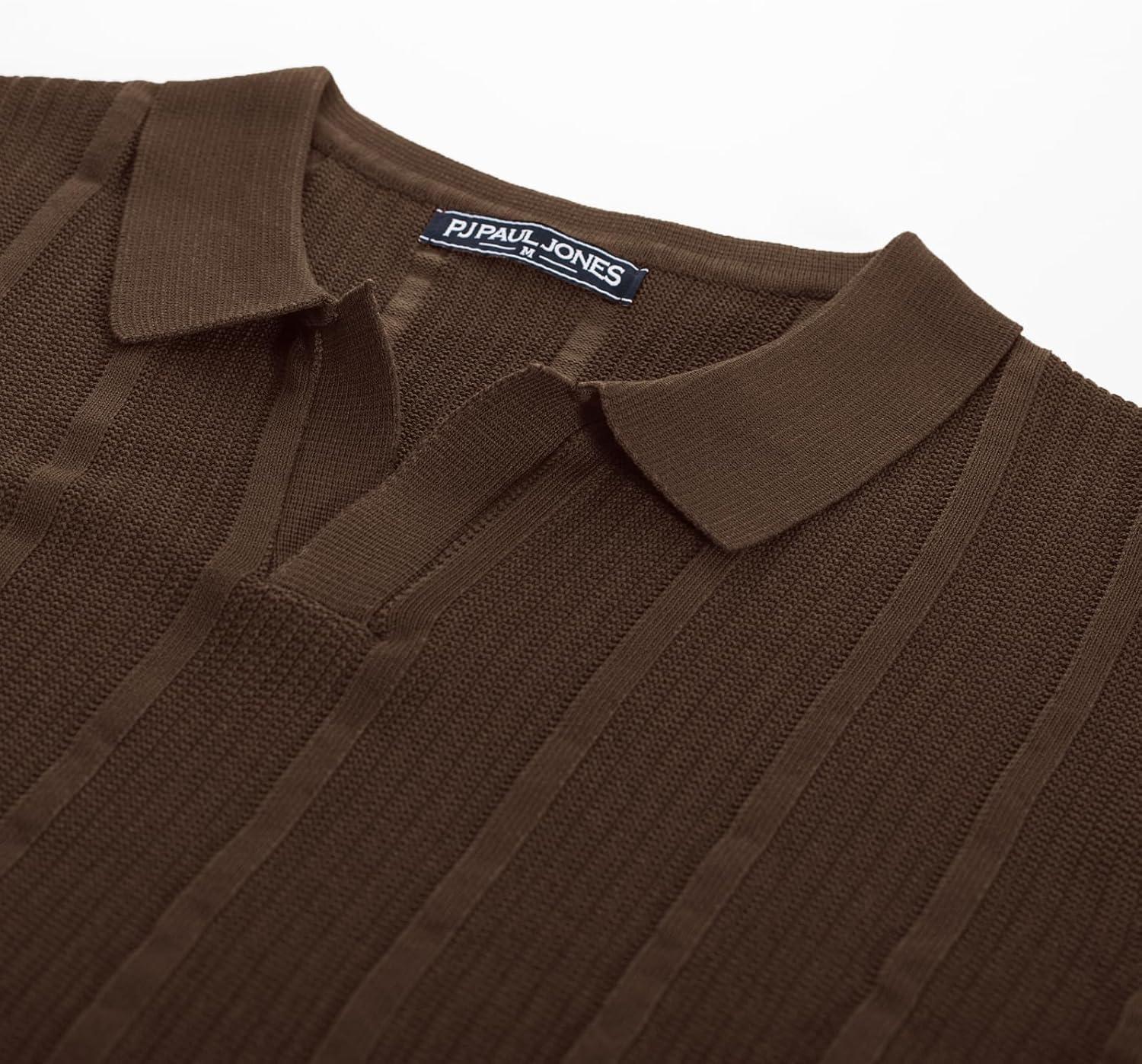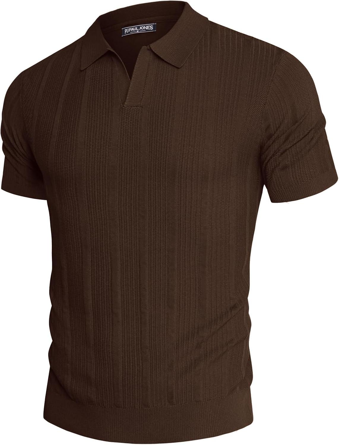 PJ PAUL JONES Mens Polo Shirts Regular Fit Textured V-Neck Knit Golf Polos(Dark Coffee)