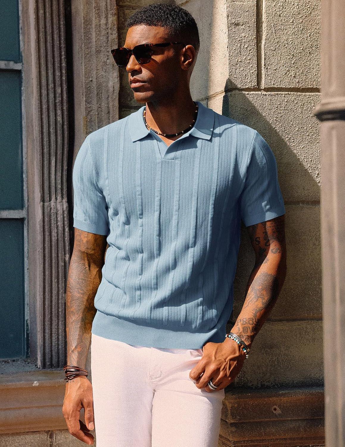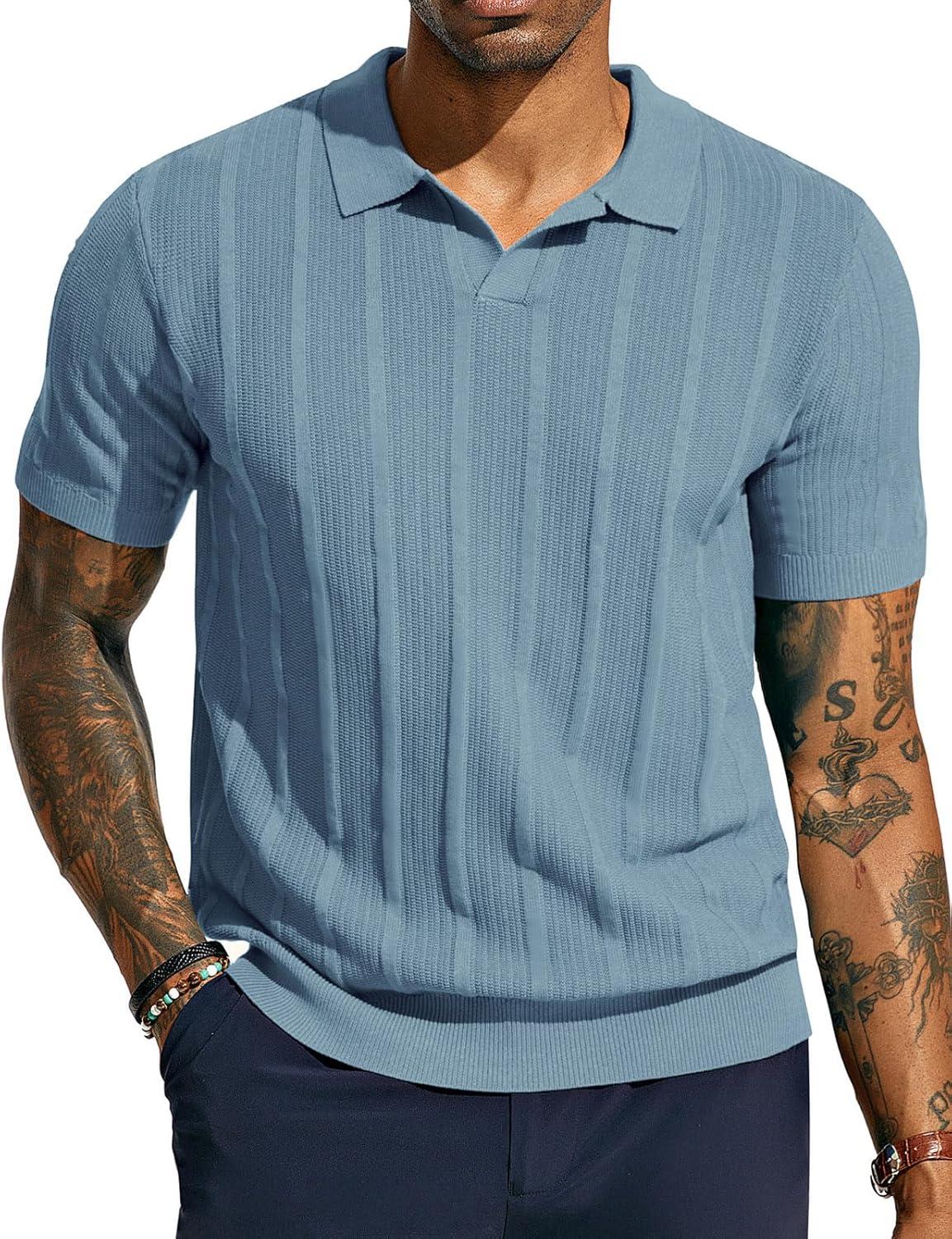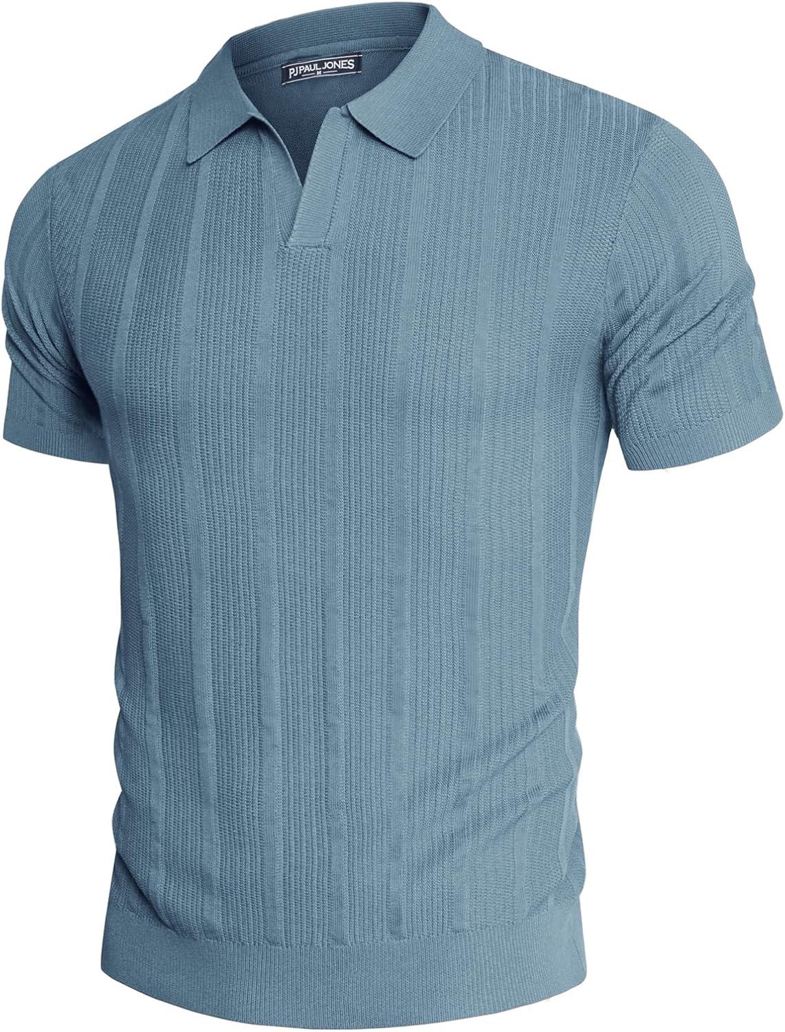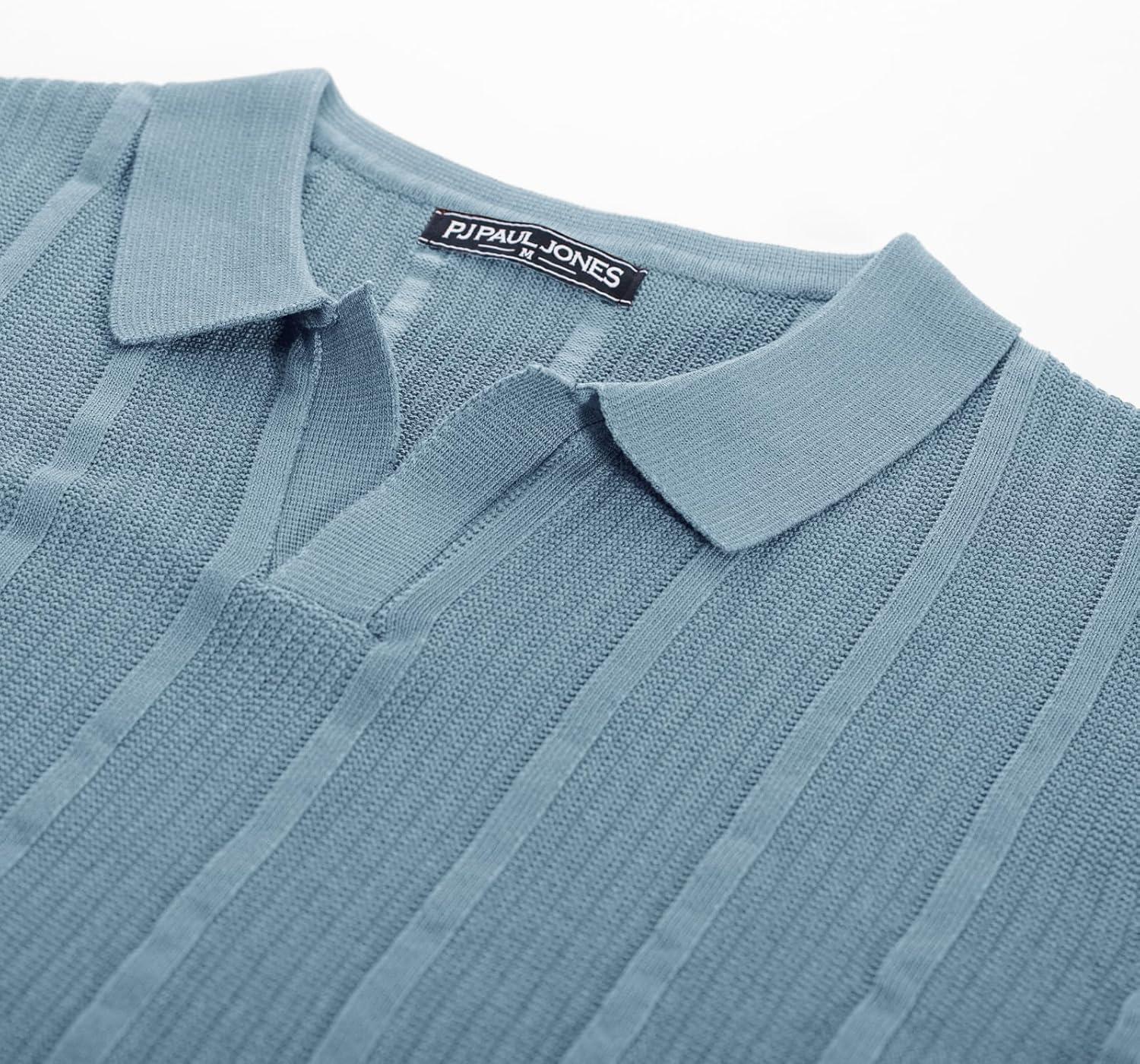 PJ PAUL JONES Mens Polo Shirts Regular Fit Textured V-Neck Knit Golf Polos(Grey Blue)