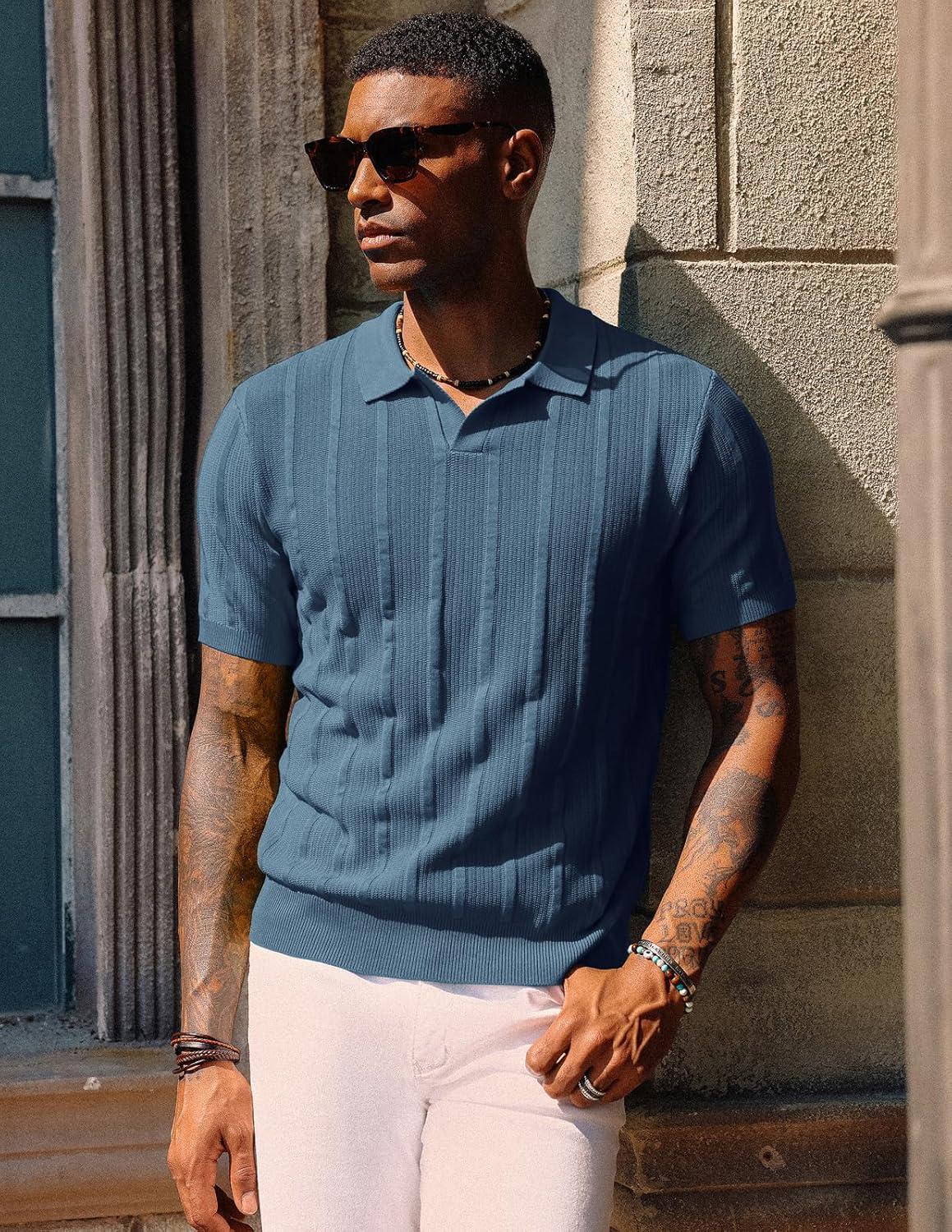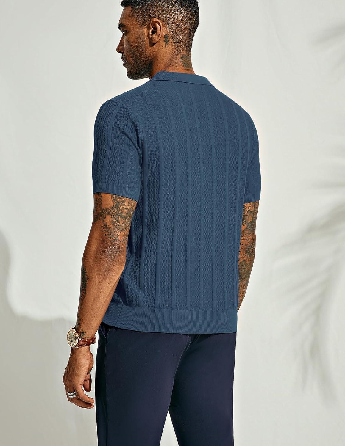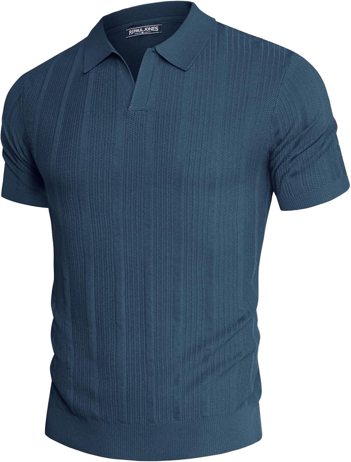 PJ PAUL JONES Mens Polo Shirts Regular Fit Textured V-Neck Knit Golf Polos(Indigo-blue)