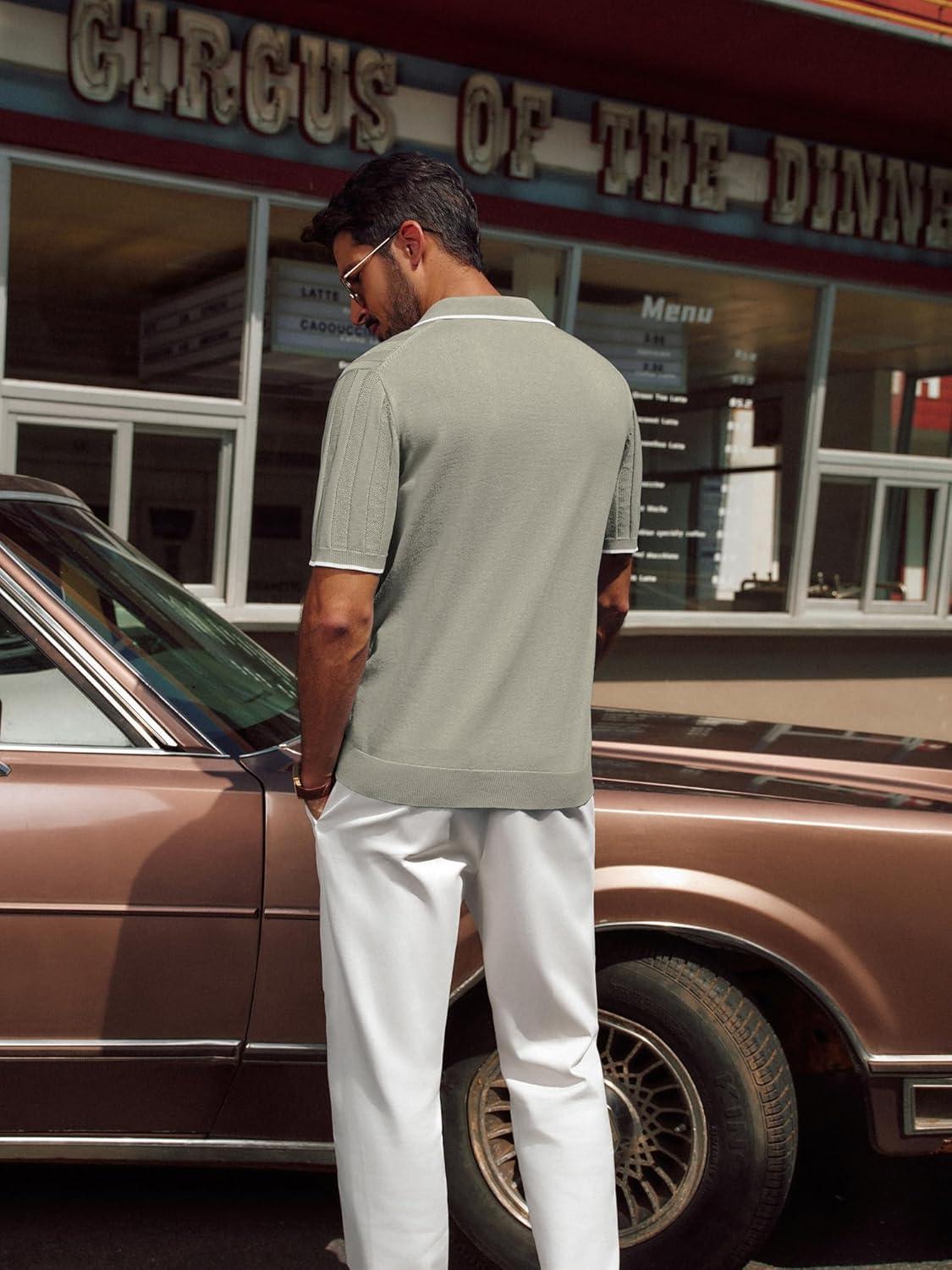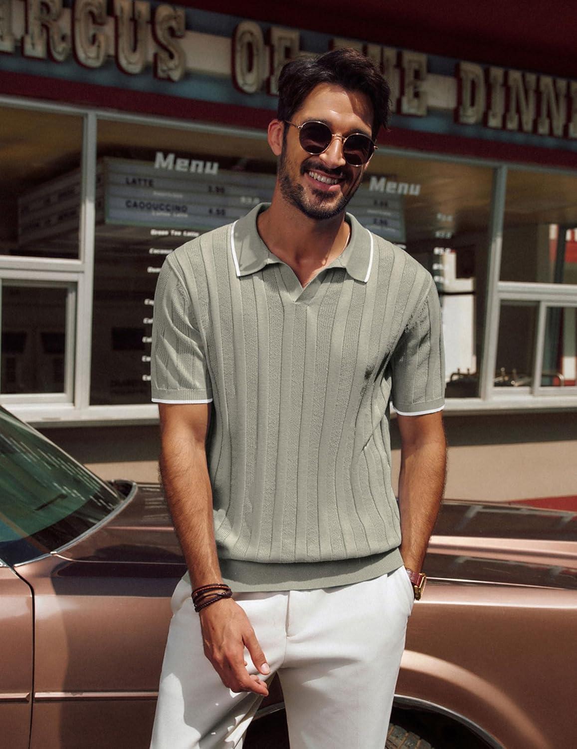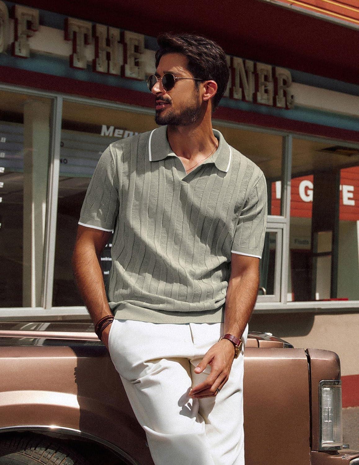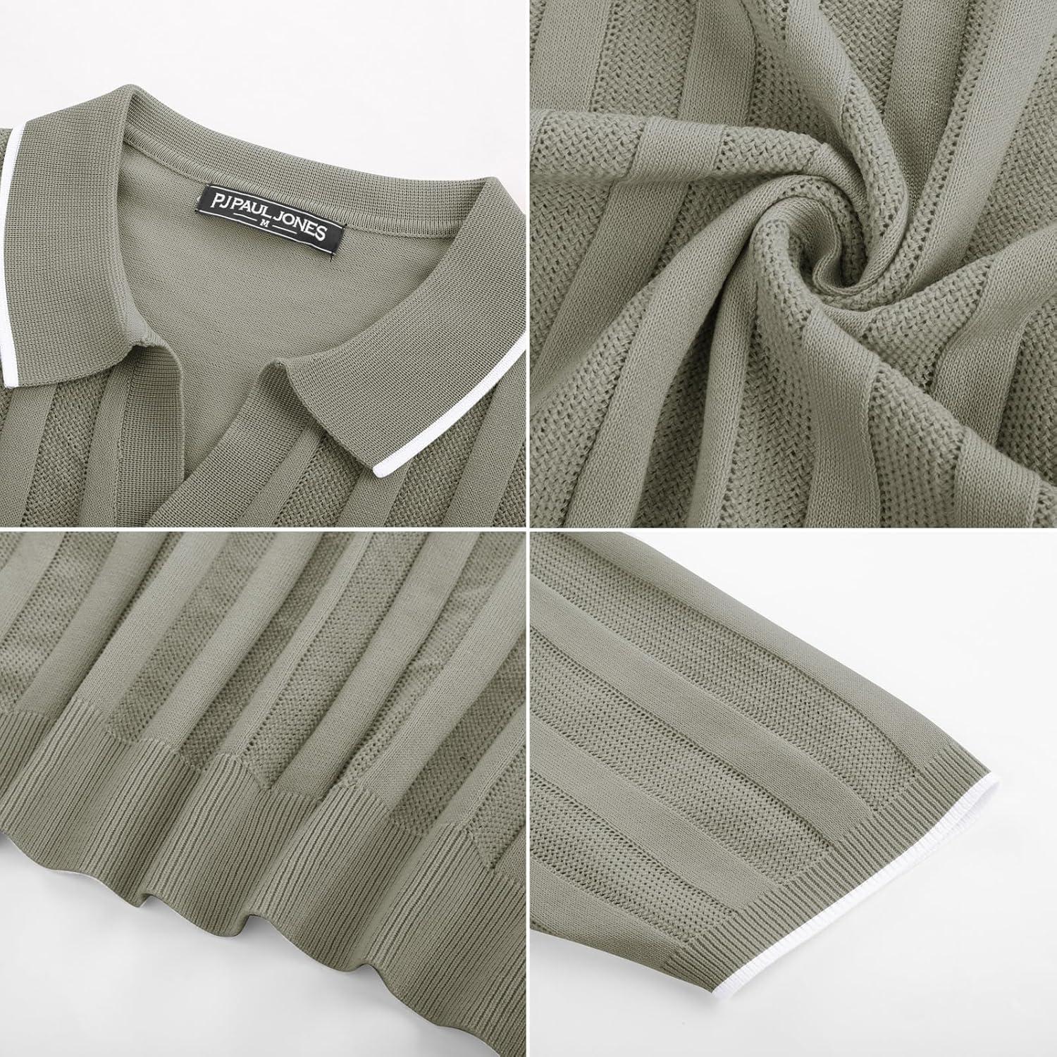 PJ PAUL JONES Mens Polo Shirts Regular Fit Textured V-Neck Knit Golf Polos(Khaki Contrast)