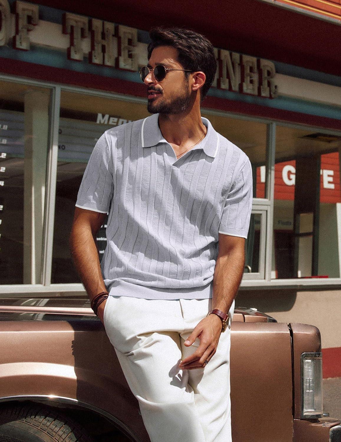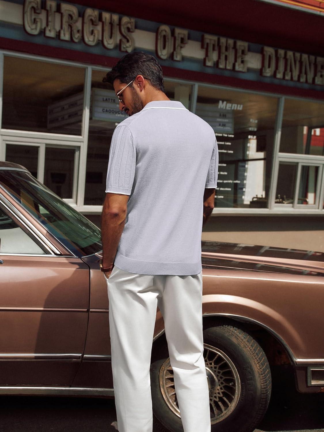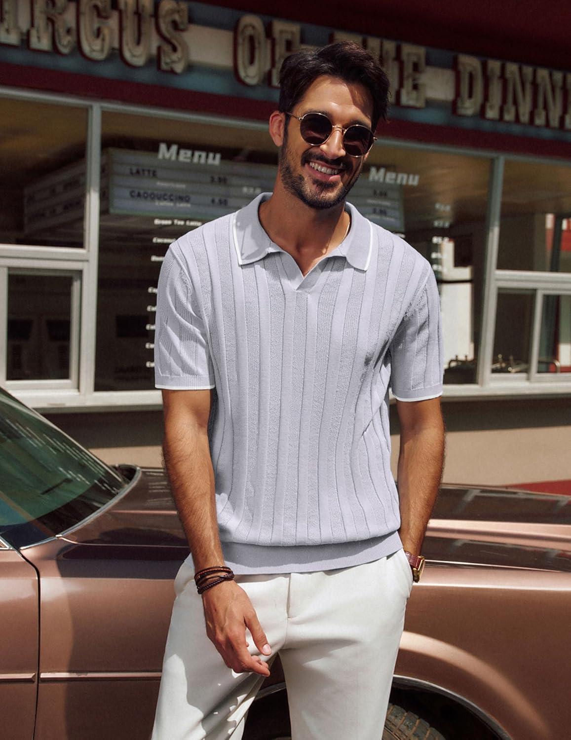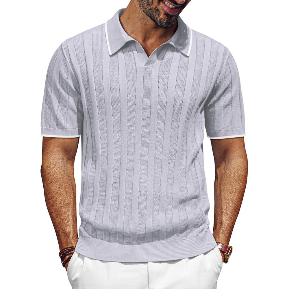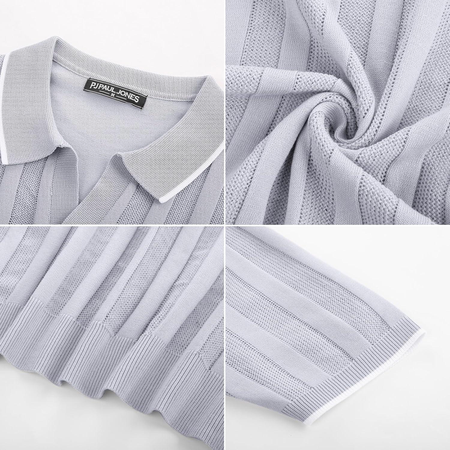 PJ PAUL JONES Mens Polo Shirts Regular Fit Textured V-Neck Knit Golf Polos(Light Grey Contrast)