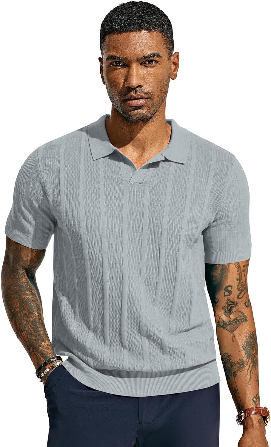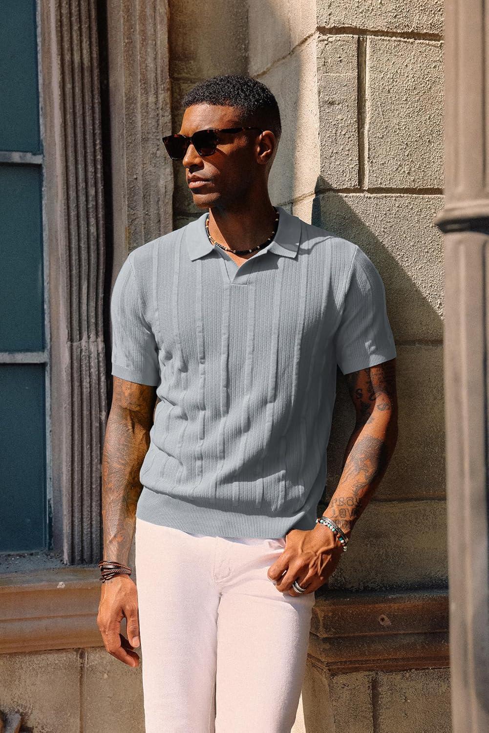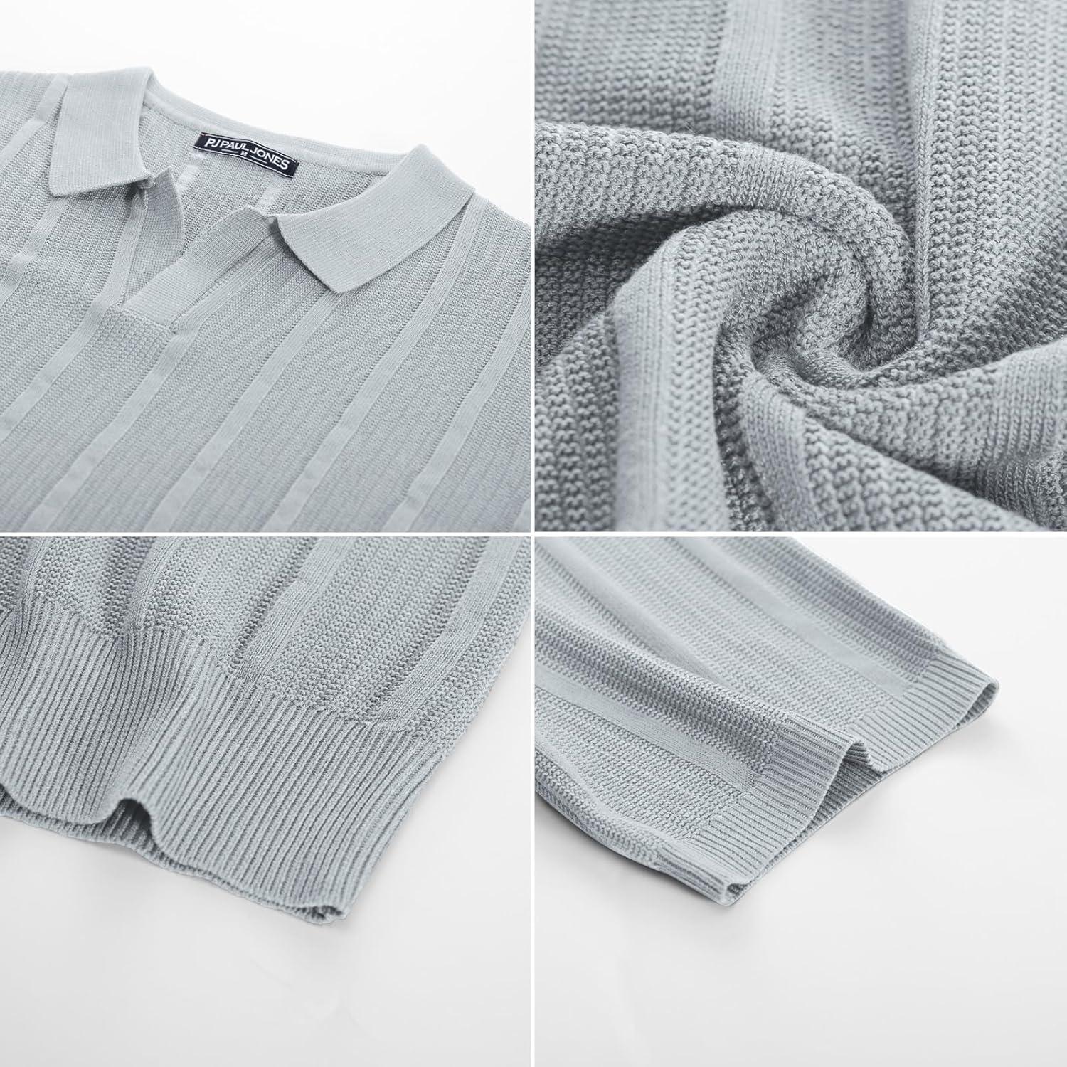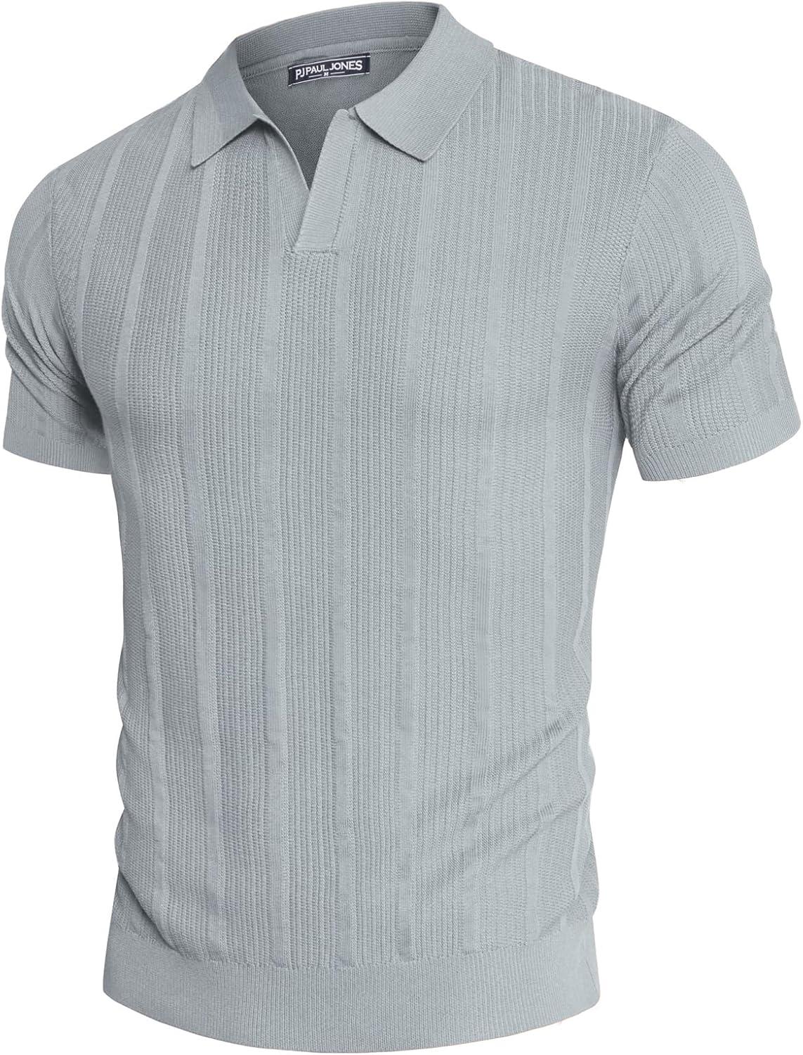PJ PAUL JONES Mens Polo Shirts Regular Fit Textured V-Neck Knit Golf Polos(Light Grey)