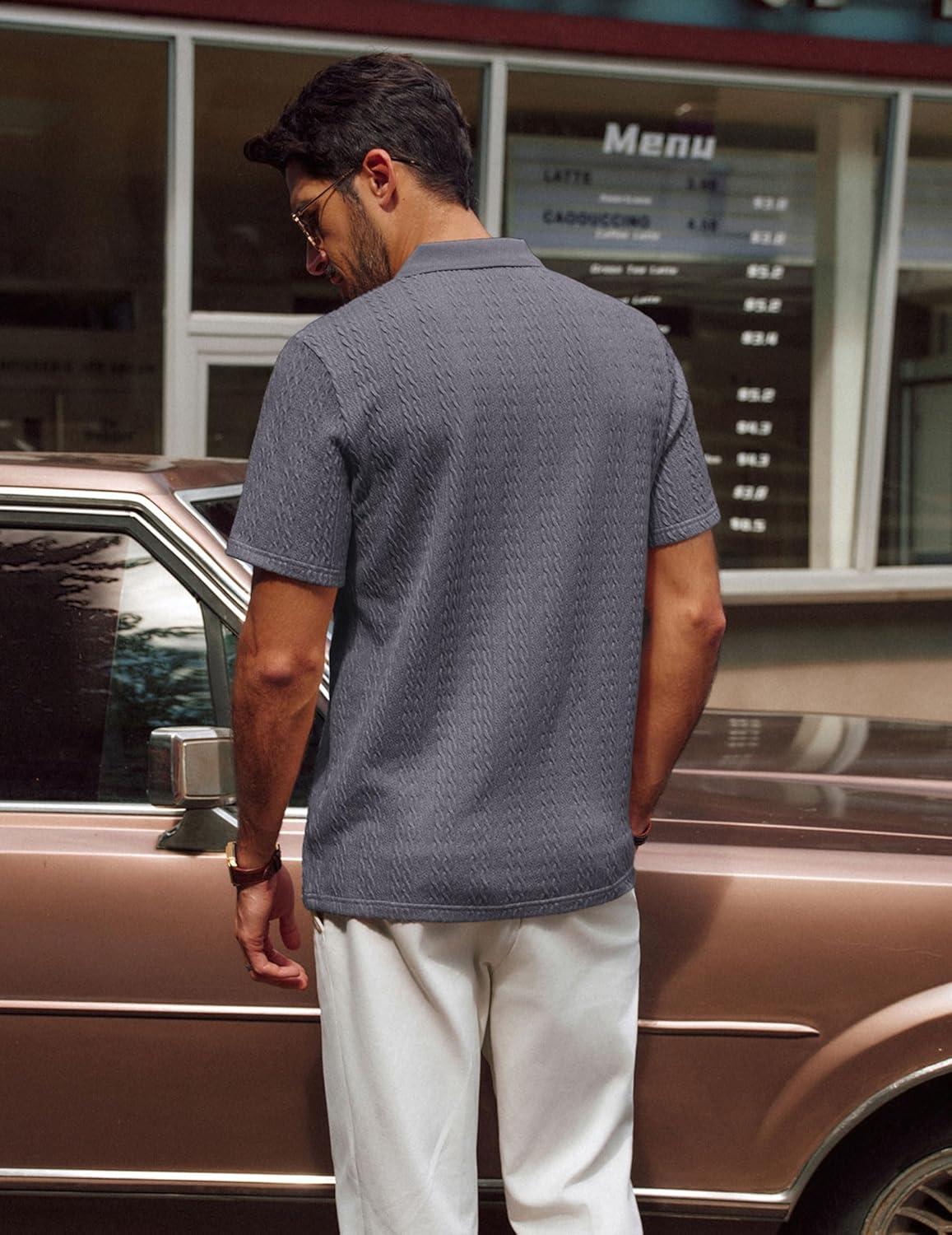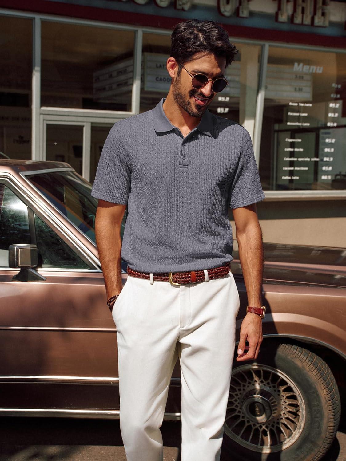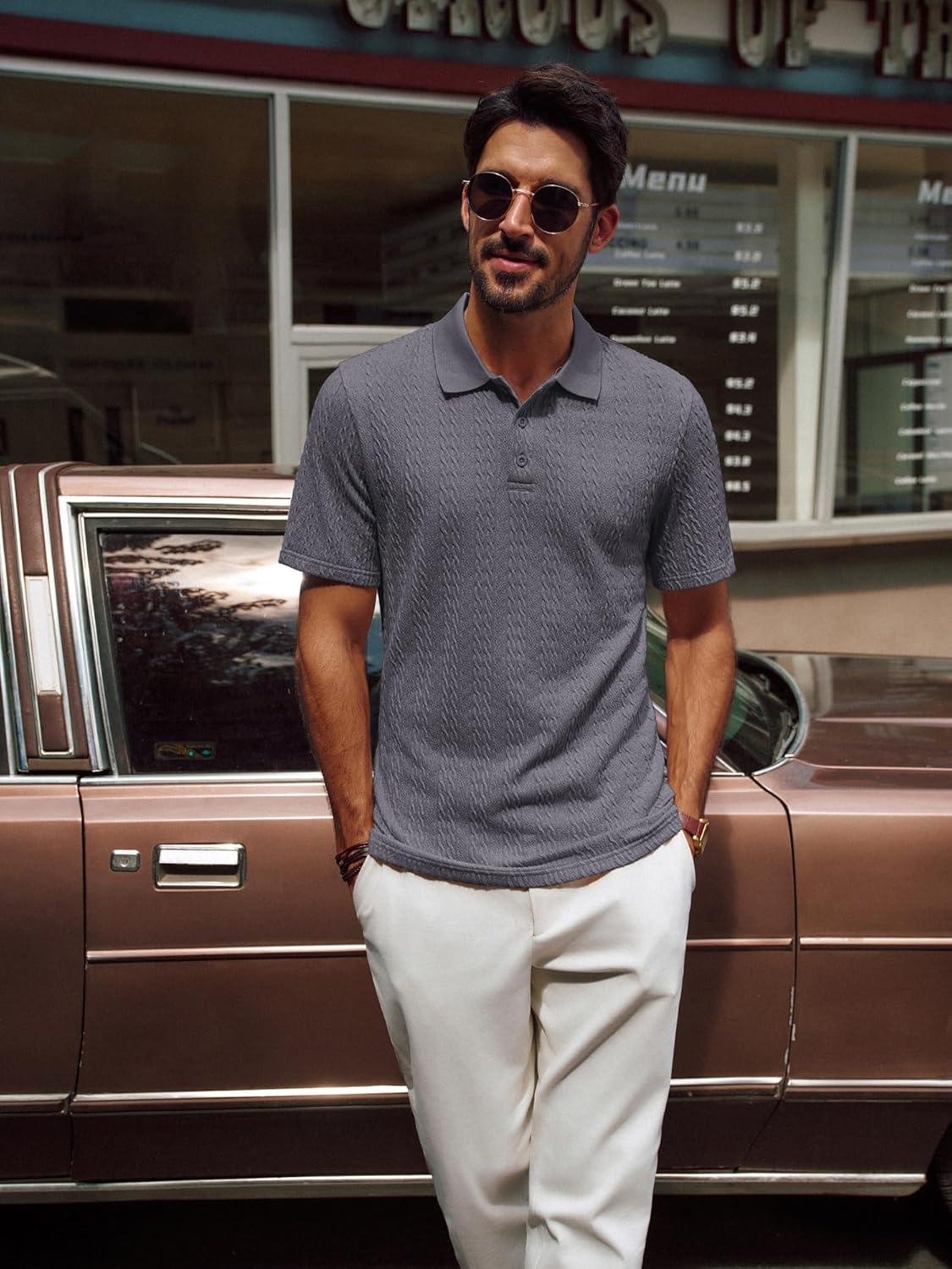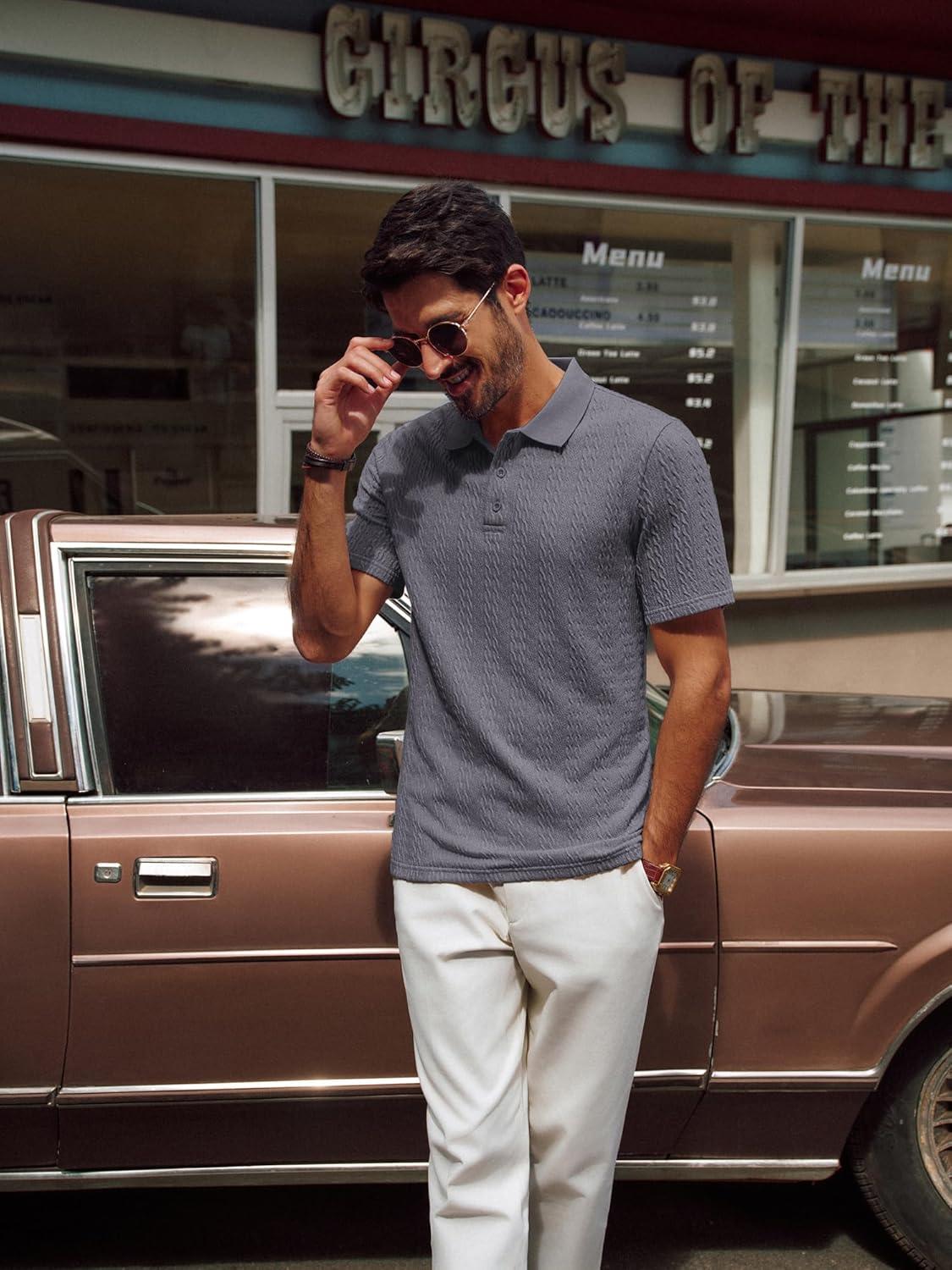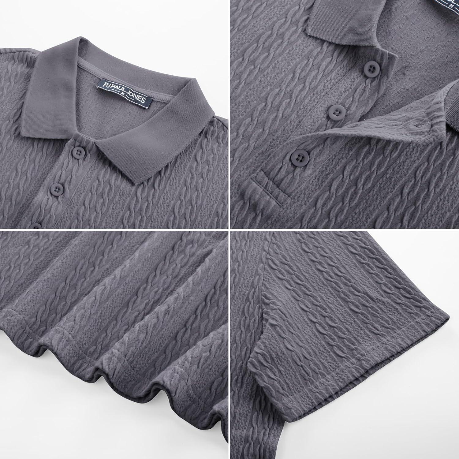 PJ PAUL JONES Mens Polo Shirts Short Sleeve Casual Collared Shirts Textured Stretchy Golf Shirts(Deep Grey)