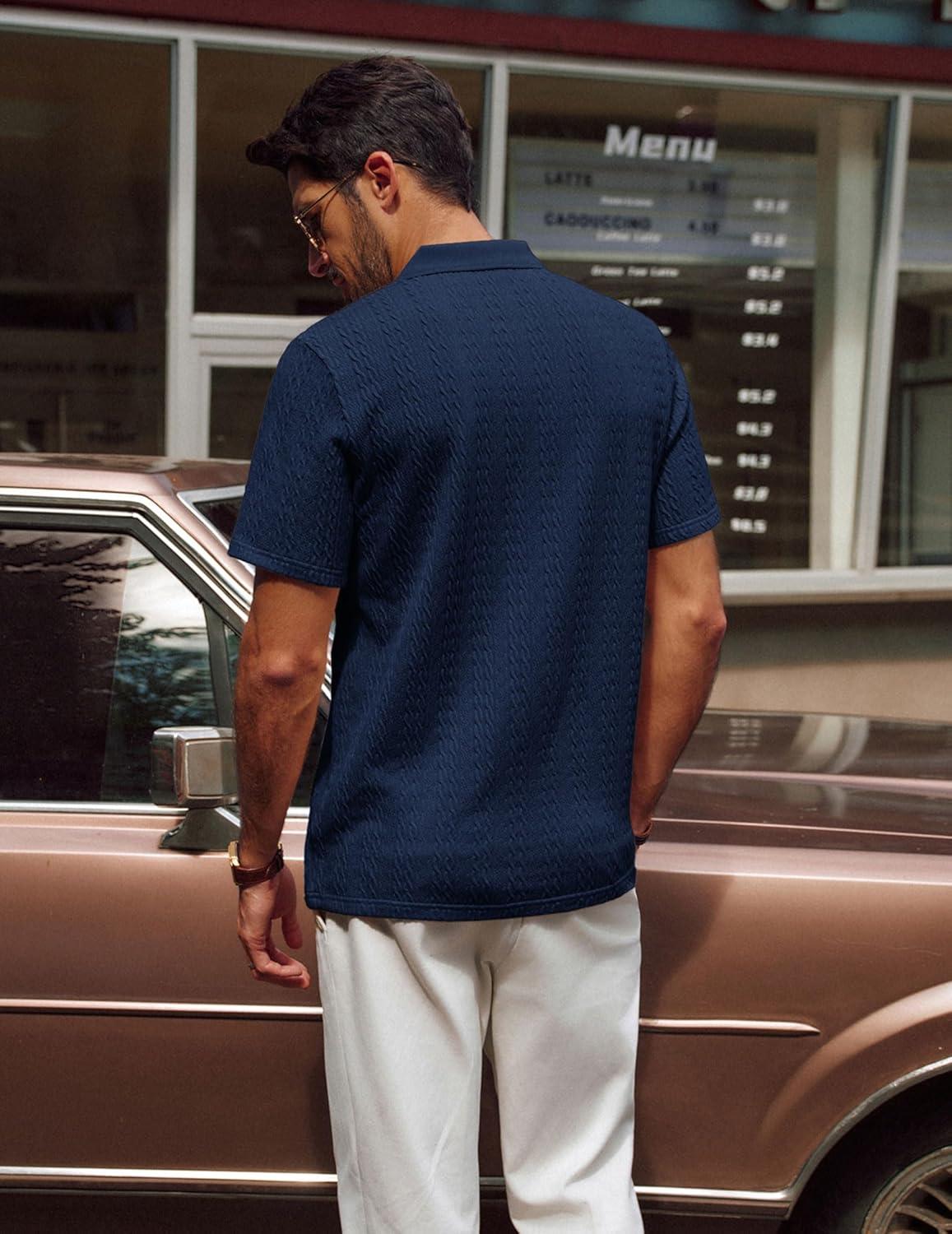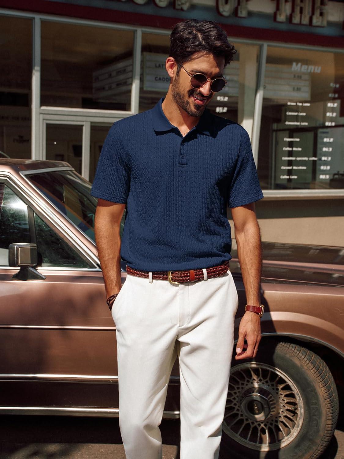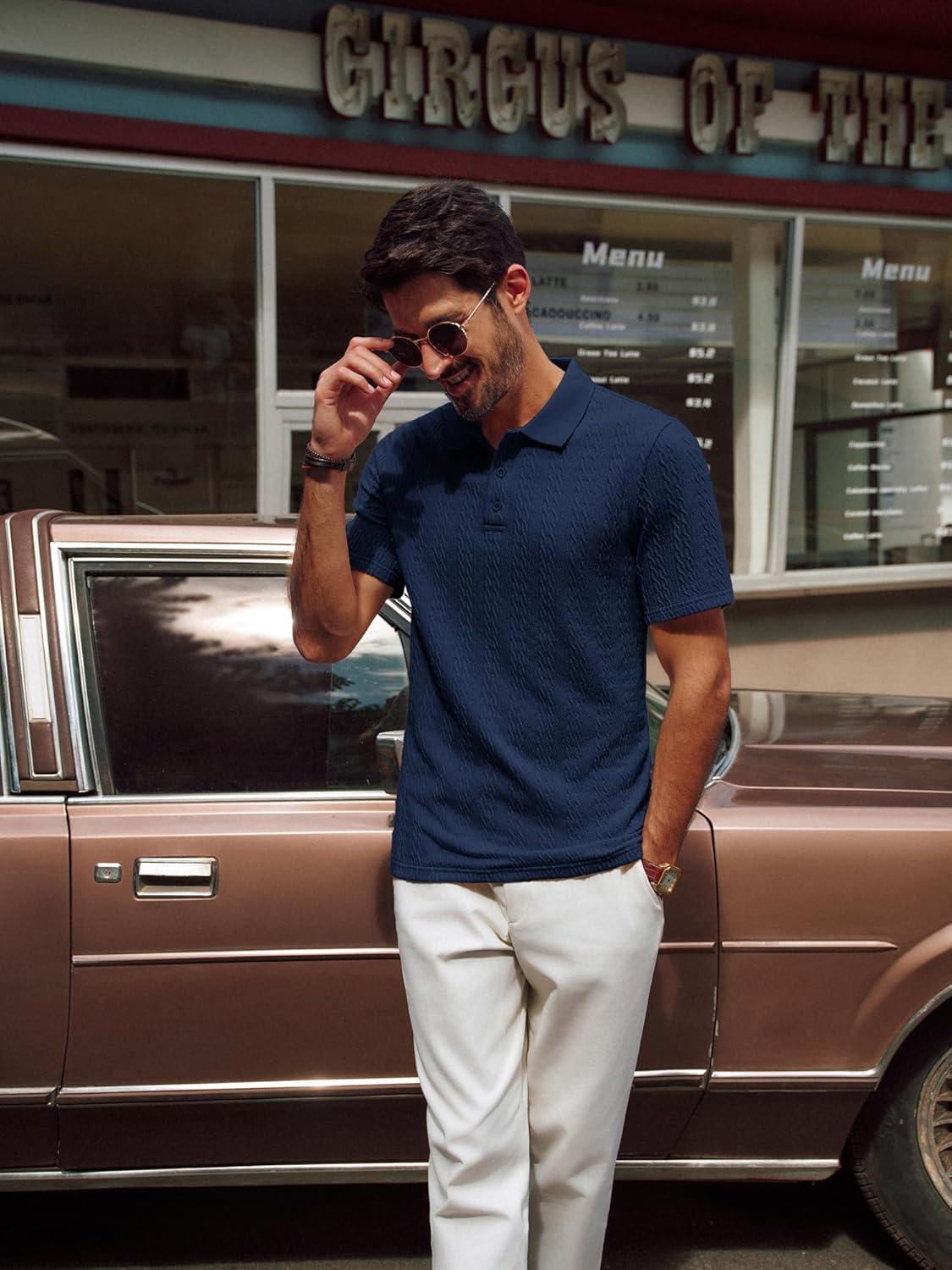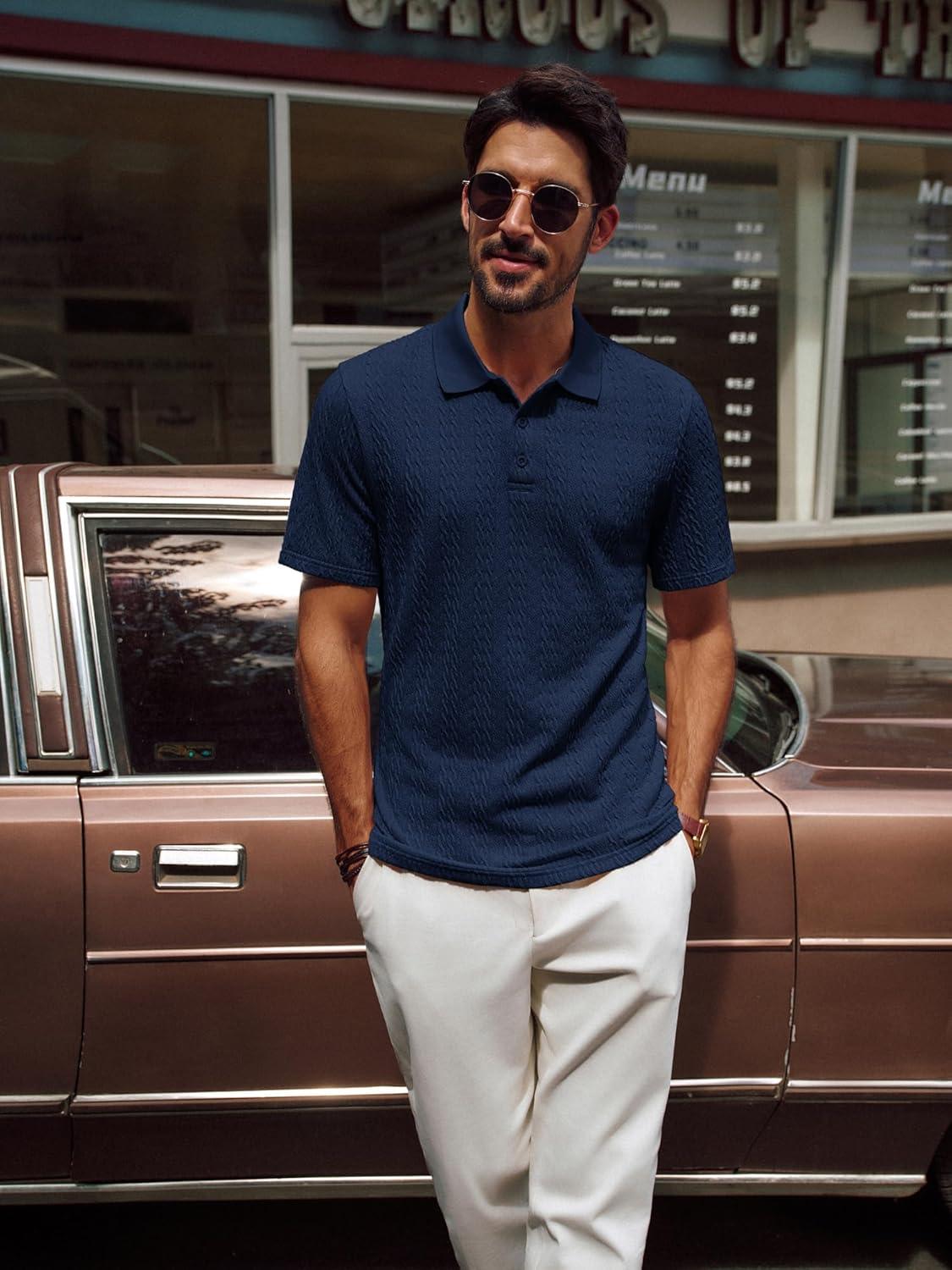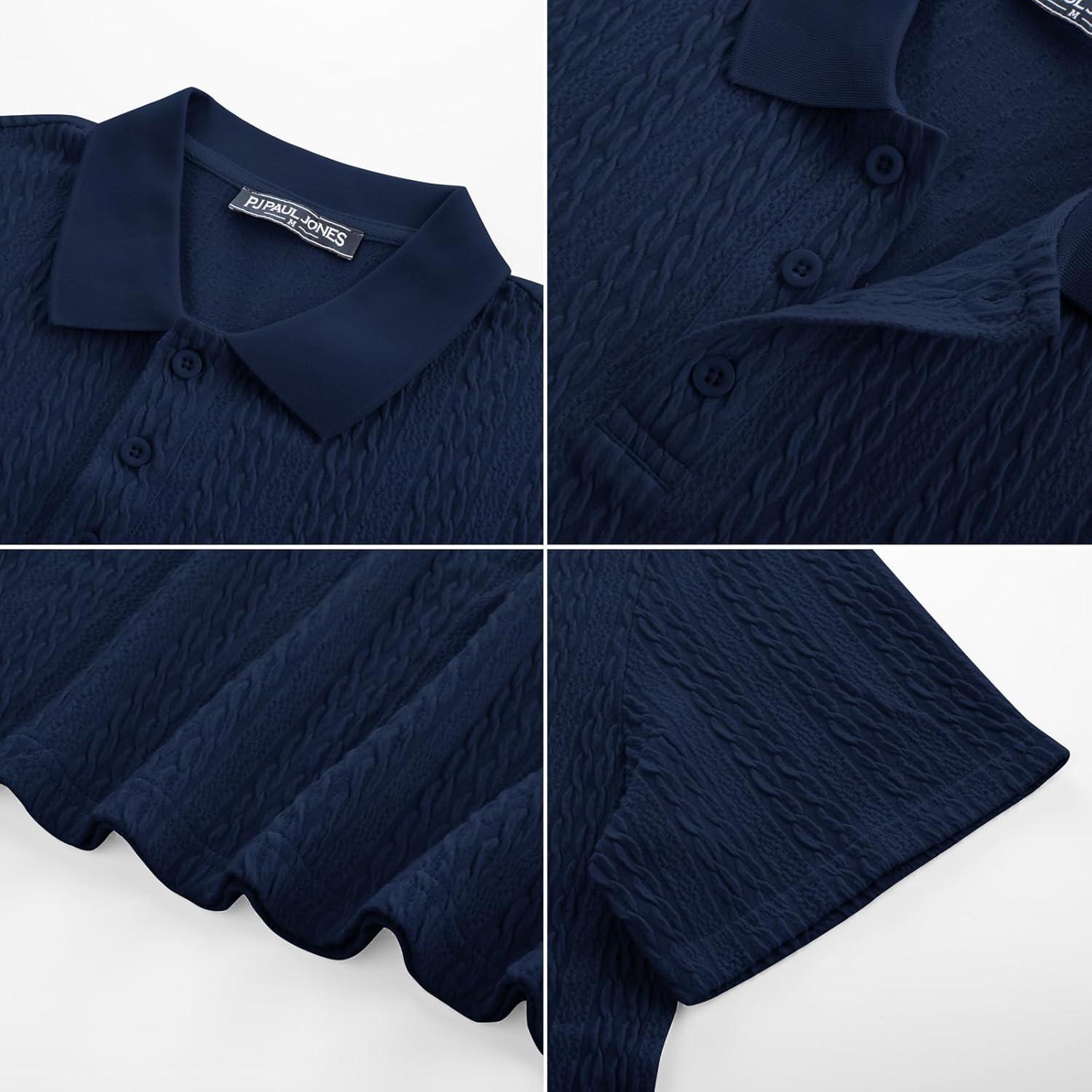 PJ PAUL JONES Mens Polo Shirts Short Sleeve Casual Collared Shirts Textured Stretchy Golf Shirts(Navy Blue)