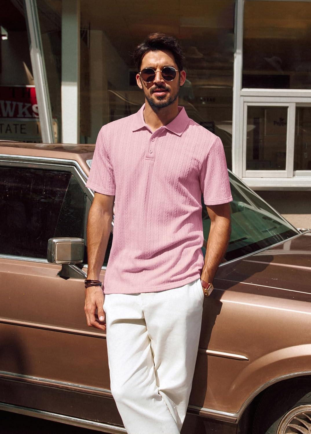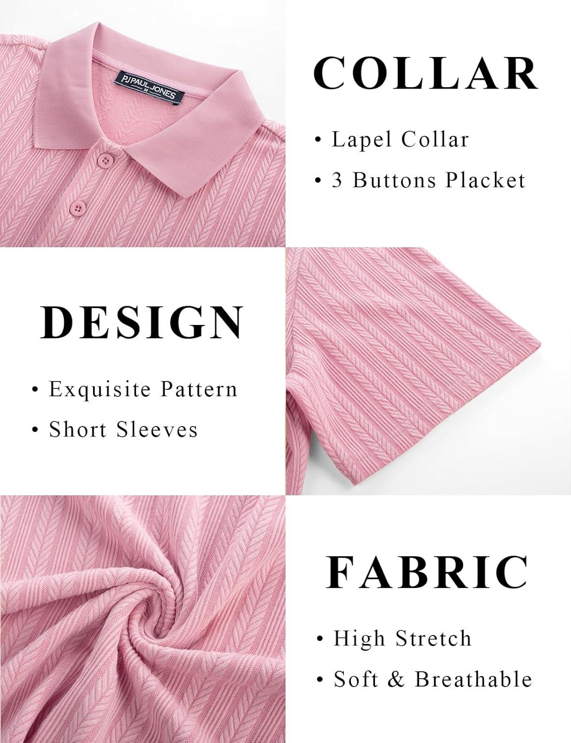 PJ PAUL JONES Mens Polo Shirts Short Sleeve Fashion Textured Polo Shirt Regular Fit Stretchy Golf Shirts(Pink)